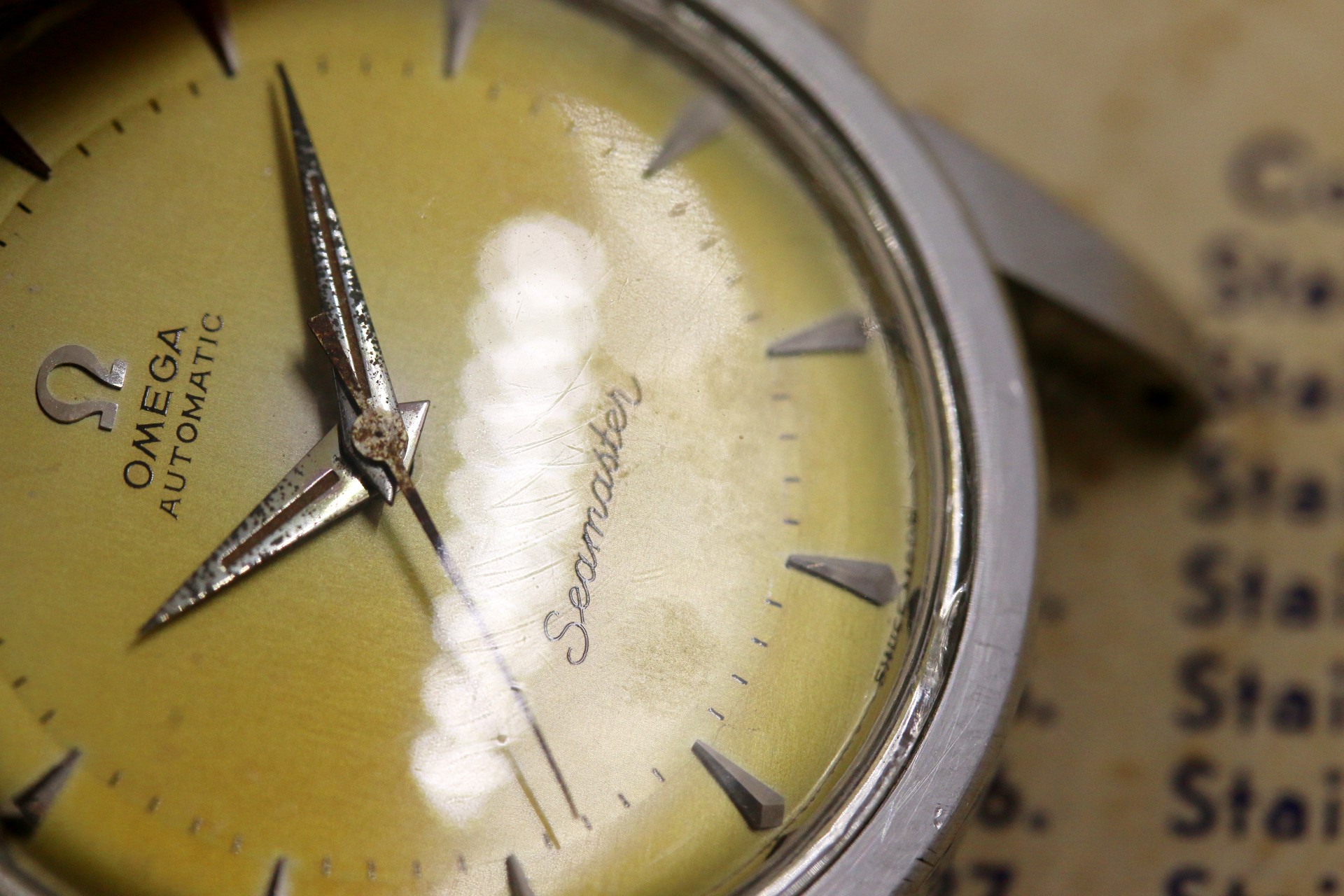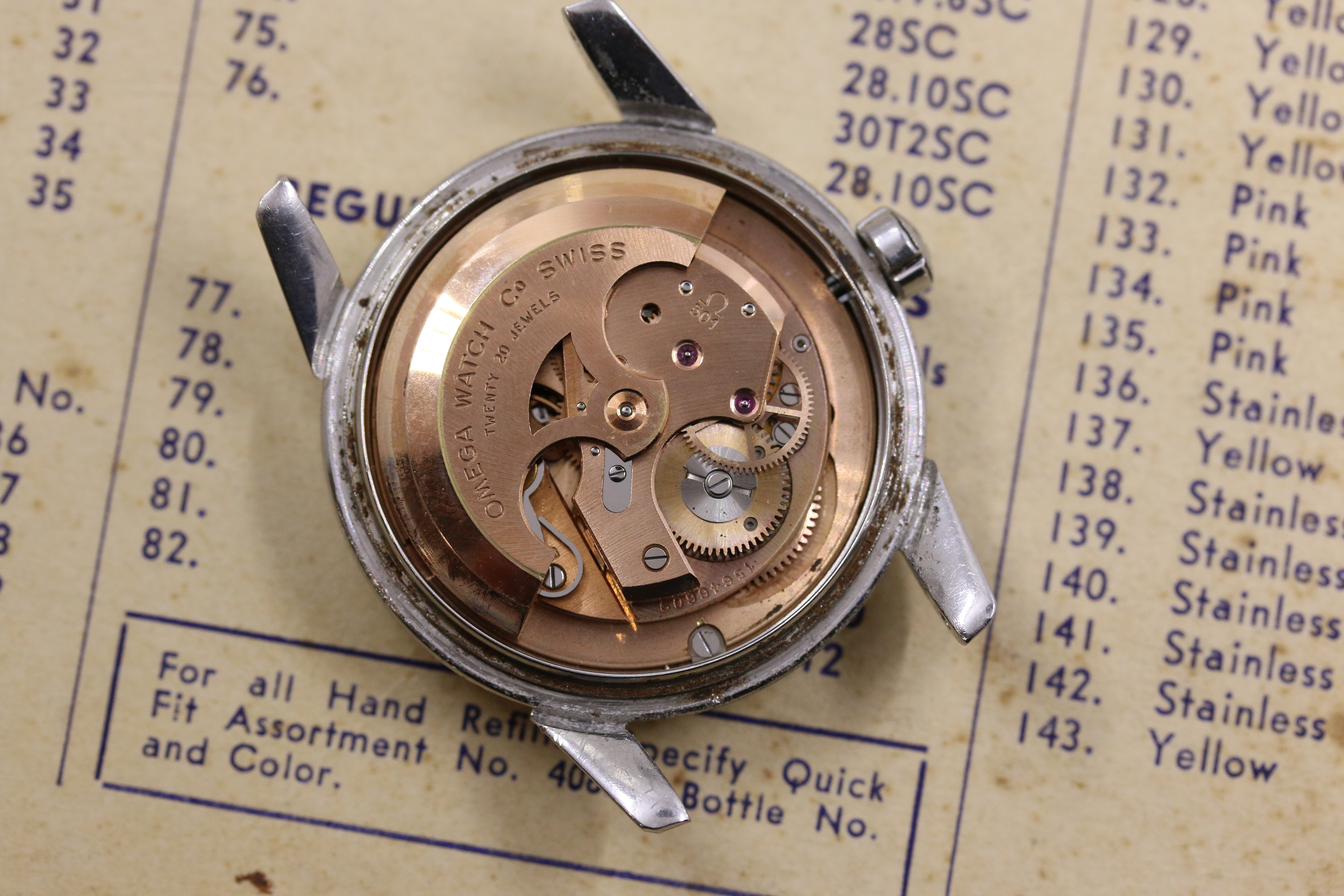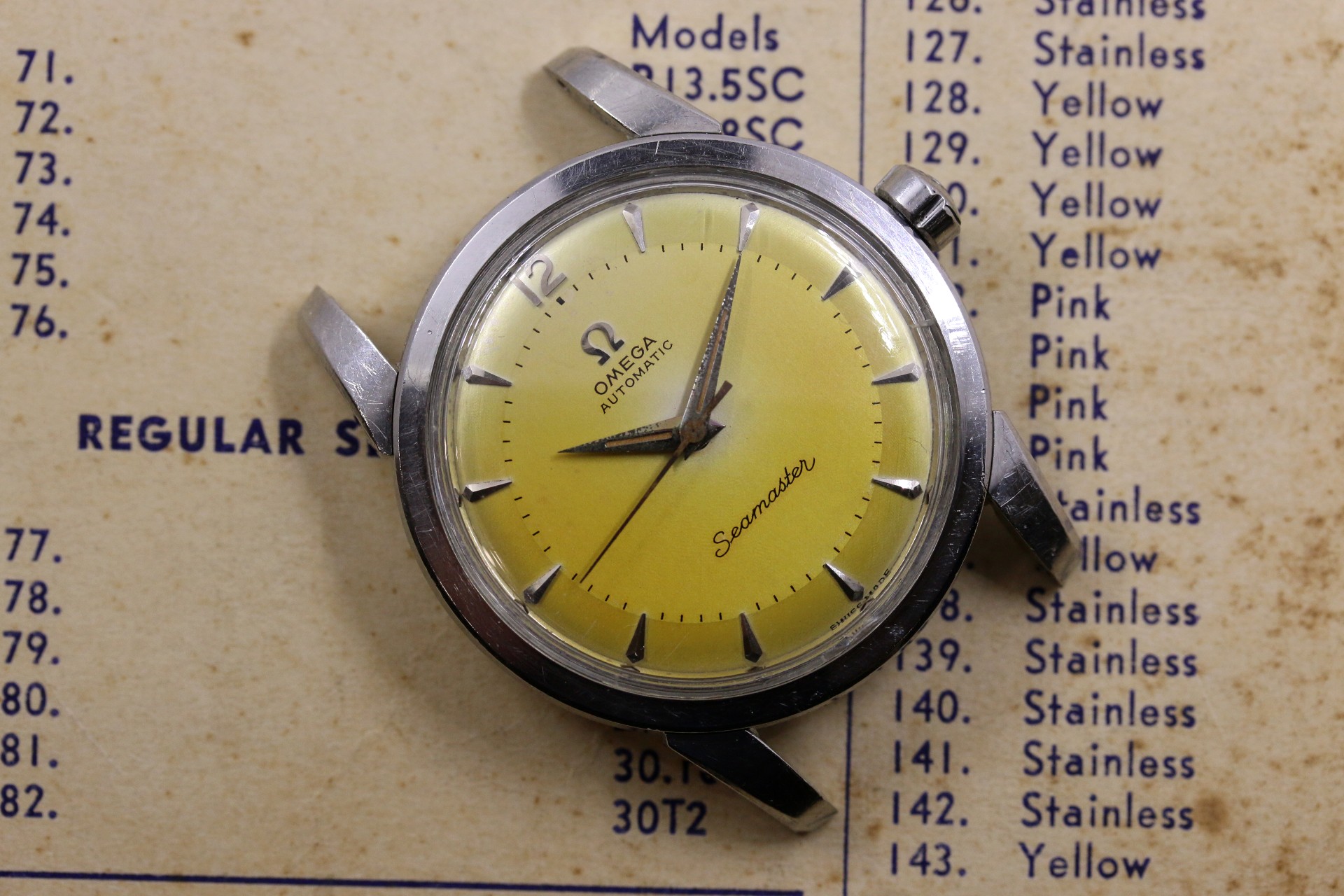 Up for sale is a decent Seamaster 2846 Cal. 501. Most noticeable is the dial which has a nice yellow patina. Overall the dial is pleasing, but there are some minor blemishes shown in the 4th picture which can only be seen in very harsh light. Most of the time the watch does look like how it is pictured in the first couple of pictures. I do believe that the hands were replaced at some point or the dial, as the hands have lume and the dial doesn't. Case is in ok condition with some pitting around the caseback, shown in the pictures. Crystal is original with some little nicks around the edges. Watch runs, but has not been serviced in my possession. As always, if you have any questions feel free to pm me!
