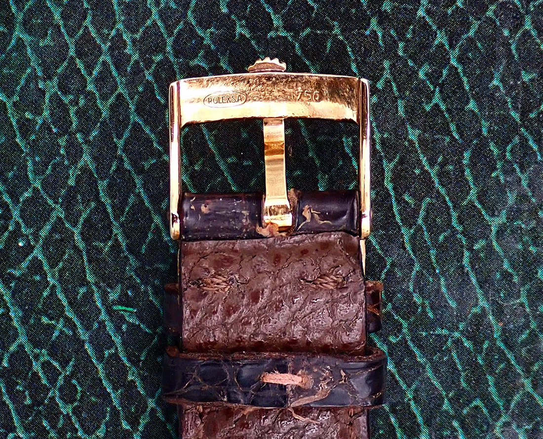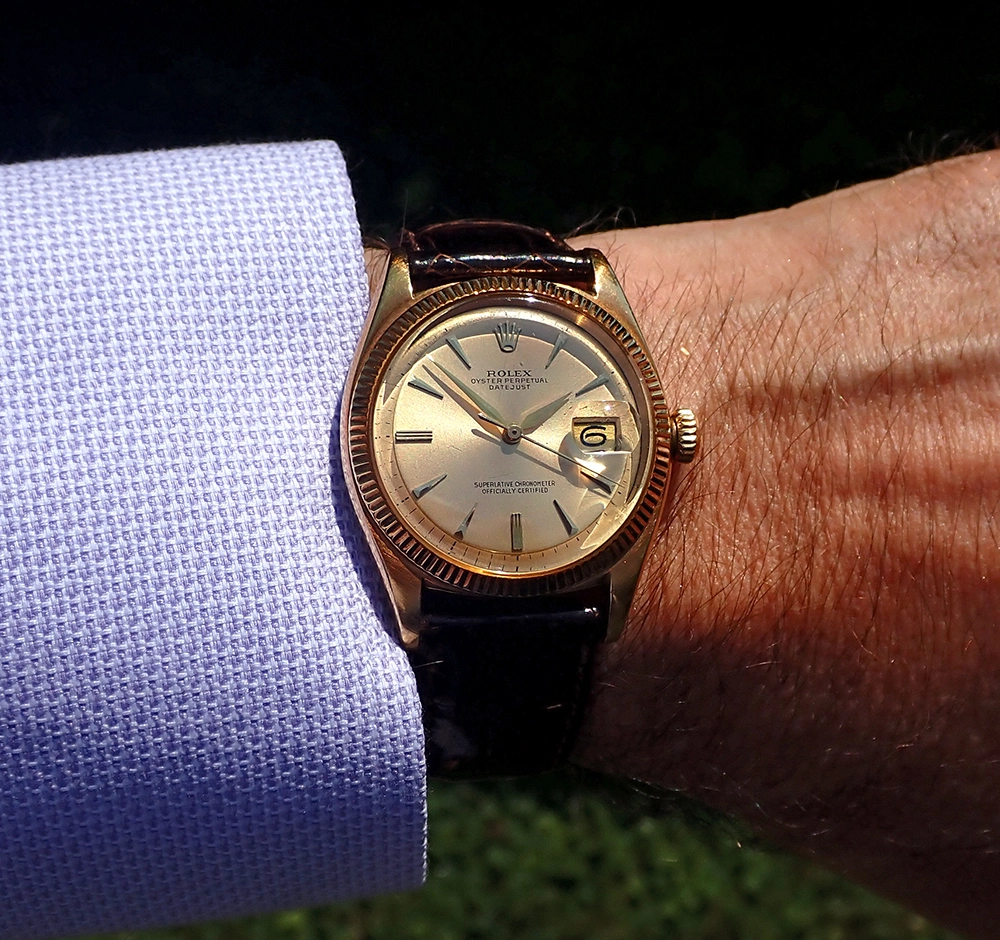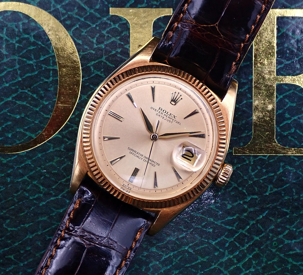 ·On offer from my personal collection is this classic Rolex reference 6605 Oyster Perpetual Datejust with solid 18 karat yellow gold case, semi-coin edge milled bezel and super elegant and scarce non-luminous dial & hands. This circa 1958-9 gold Datejust has been in my collection since 2009 and has acquired a lovely case patina, since I have never so much as buffed it and it’s been worn sparingly throughout that time. It comes equipped with its original 18k Rolex-signed buckle mounted on a genuine modern Rolex dark brown crocodile strap, two very valuable accessories in their own right. Overall, this beautiful gold DJ is in Excellent vintage condition for an over 60-year-old gold watch, with fantastic Near Mint dial & hands, and its uncommon caliber 1066 movement with butterfly rotor is running like a champ.