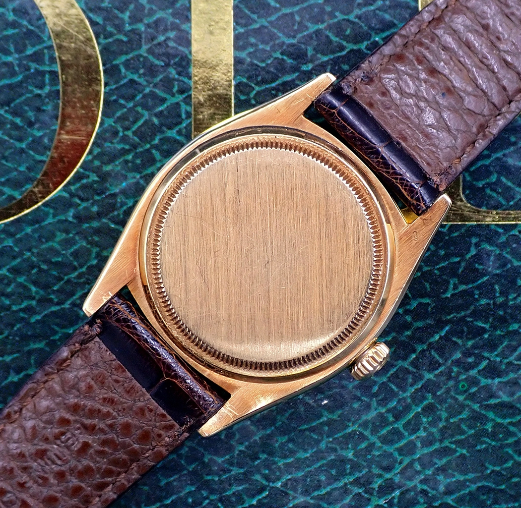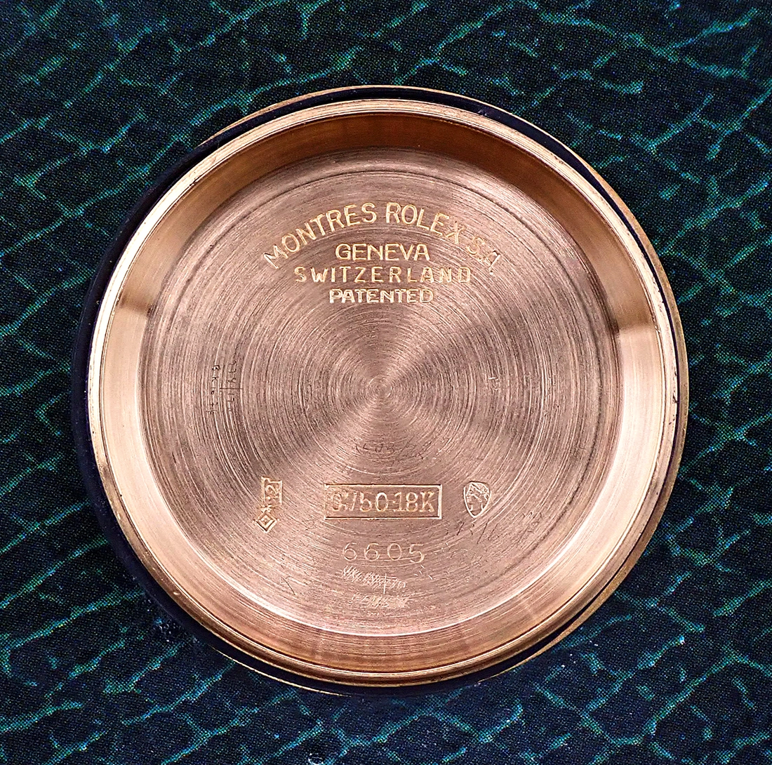 CASE & BACK: Classically proportioned 36mm x 44mm x around 10mm thick to the top of the crystal 18 karat gold Oyster case that wears a bit bigger due to the prominent, finely milled semi-coin edge bezel and the wonderfully proportioned dial design. The case is thick and even, as is the knurling of the bezel, and both have developed a lovely iridescent patina to their gold surfaces over time, which adds that extra bit of true vintage charm to the watch. This vintage Rolex gold case correctly does not have any lug holes. The sides and lugs have acquired some minor scratches and marks from wear but no major dings - Excellent vintage condition for an over 60-year old gold watch. There is wear between the lugs from the years but the correct model number “6605” and the complete case serial number of 474,xxx are still sharp and legible. The correct flat outer caseback has some superficial scratches to what looks like the original brushed finish but no real nicks or major tool marks to speak of, and nice, crisp knurling is present— again, Excellent vintage cosmetic condition overall. The inner caseback is very clean and bears the correct "6605" reference and all Rolex nomenclature of the period, including the hallmarks for 18 karat gold.