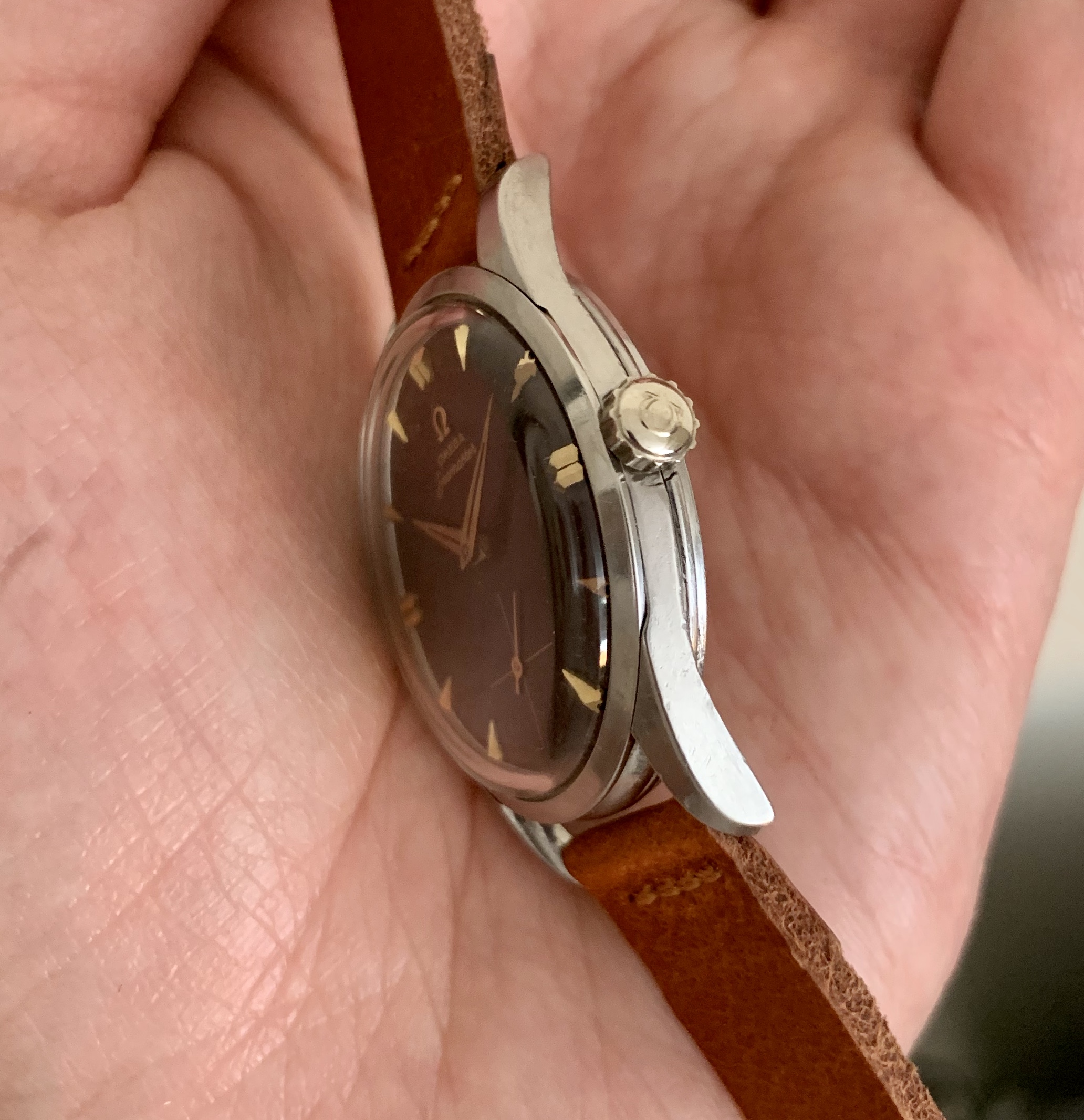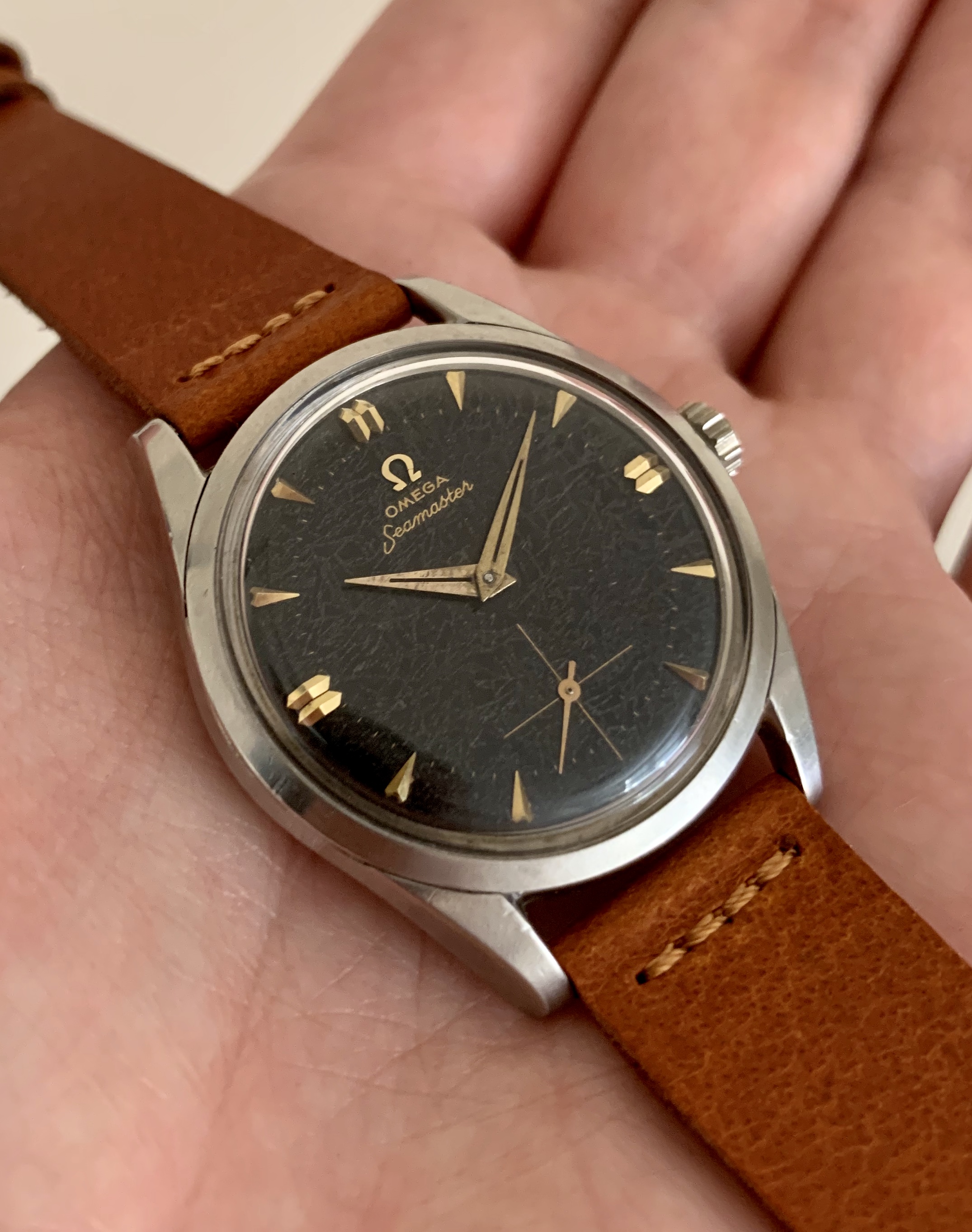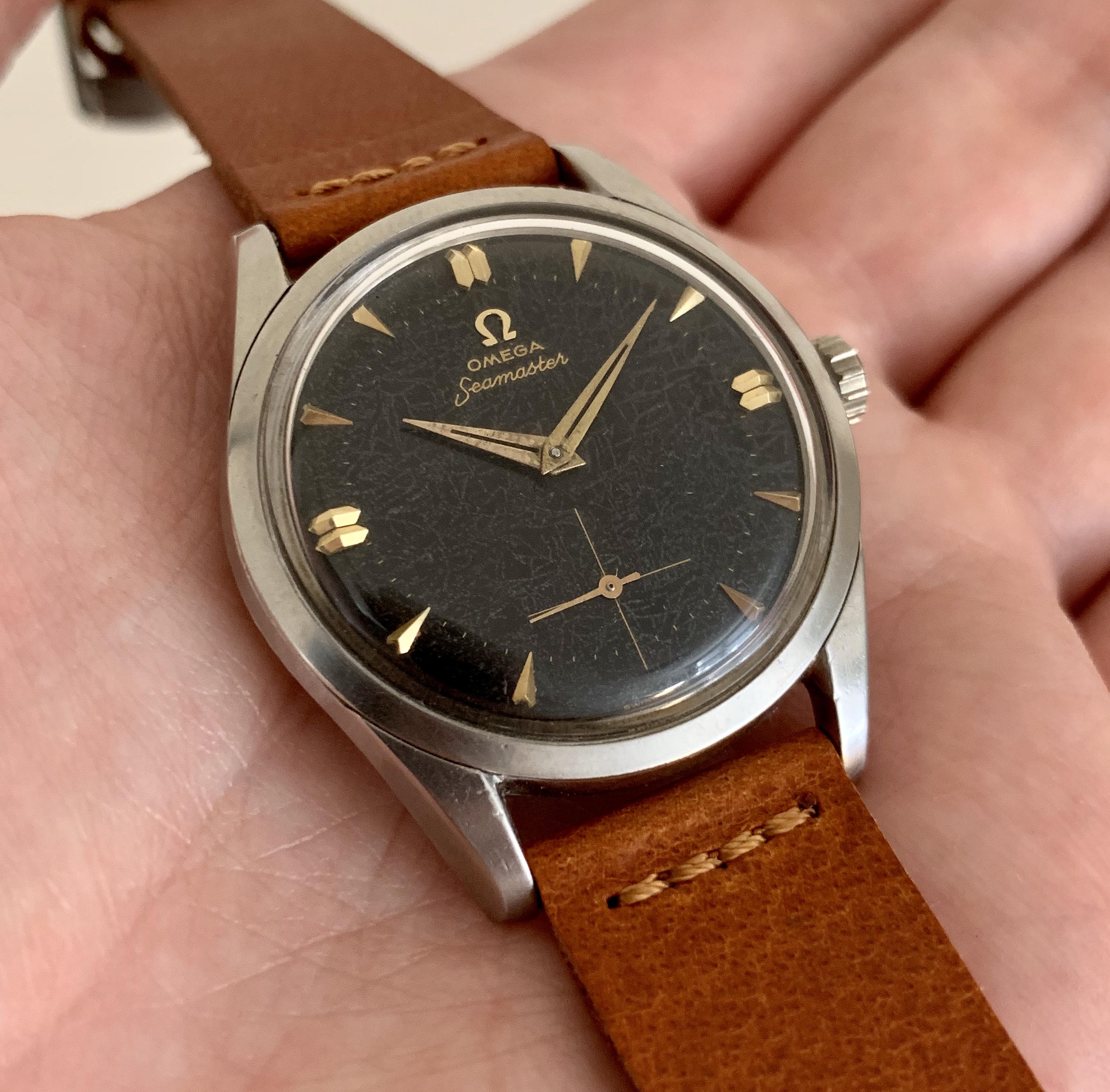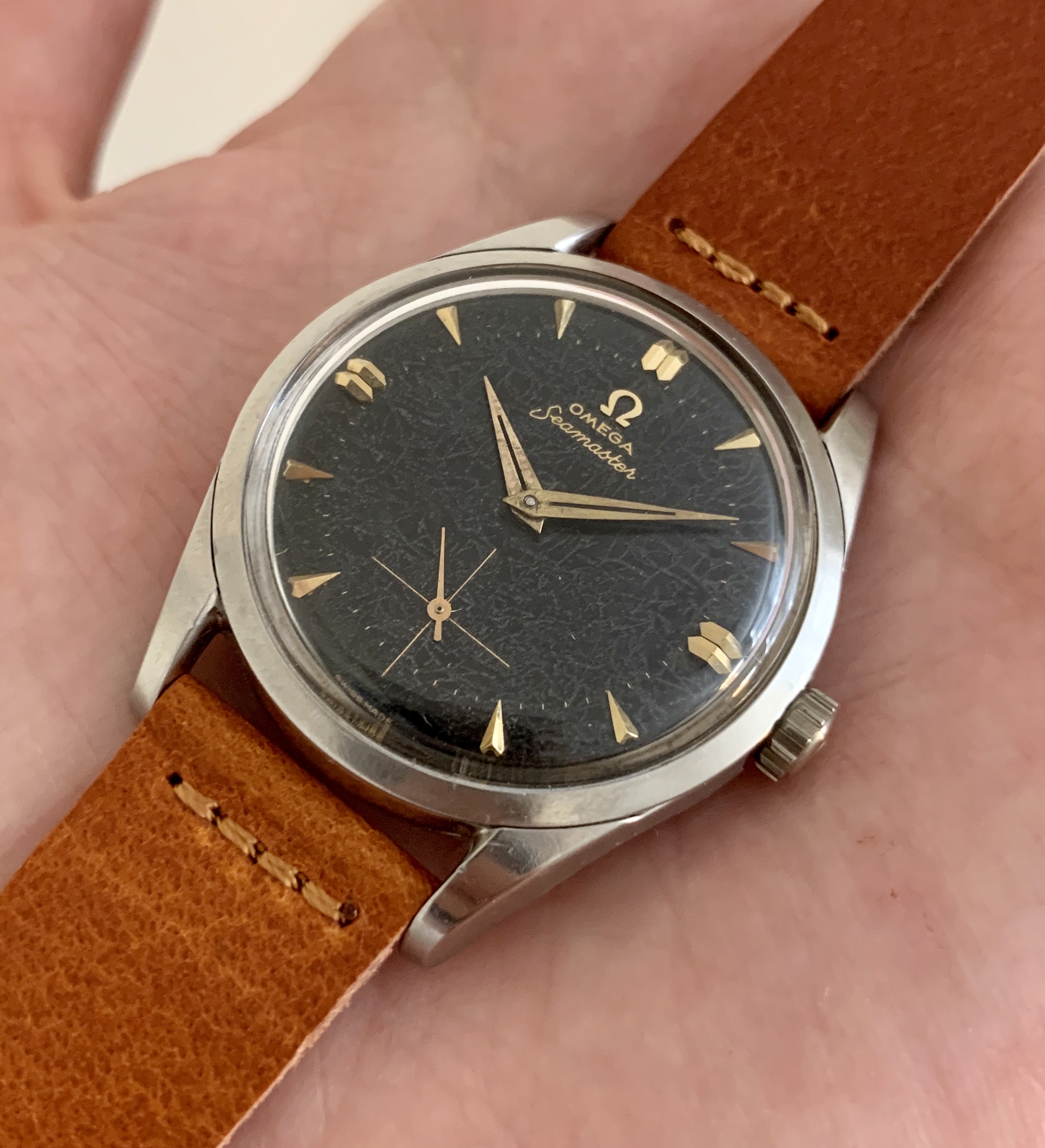 Fantastic original, unrefinished dial with sunken subseconds at 6 o’clock. Applied Omega sign and dagger markers. The dial has developed an awesome spiderweb type patina that gives the watch a very unique look.