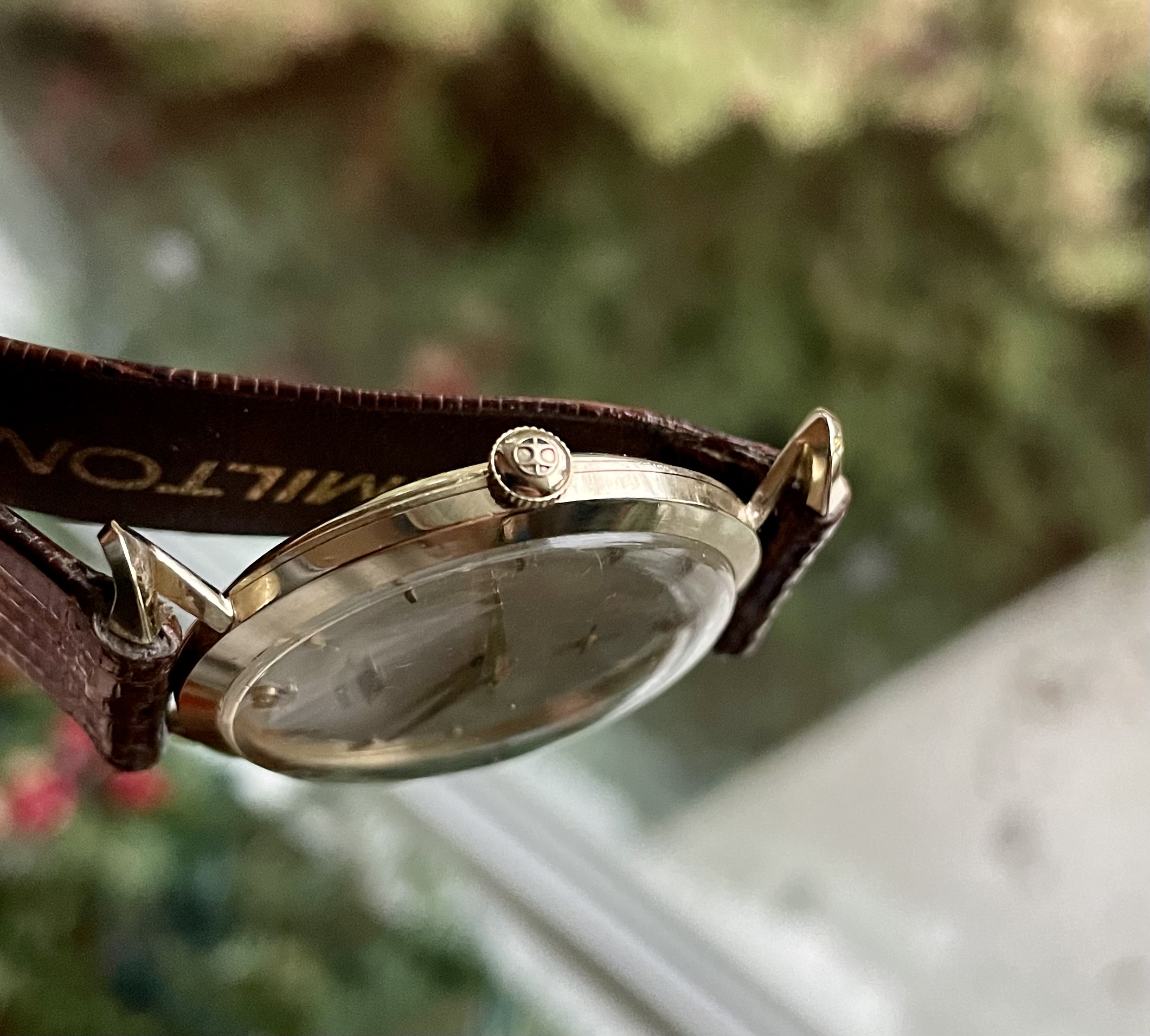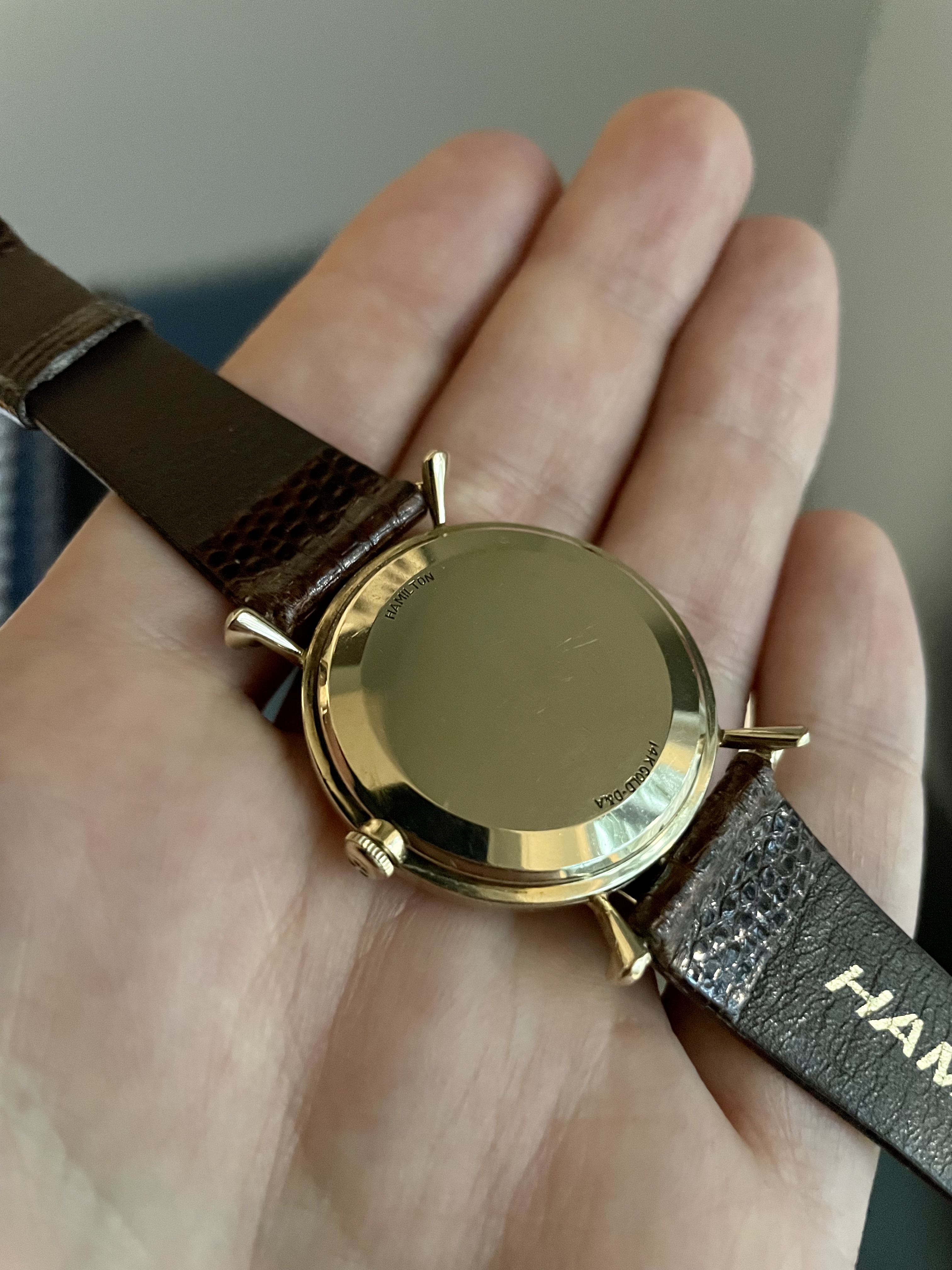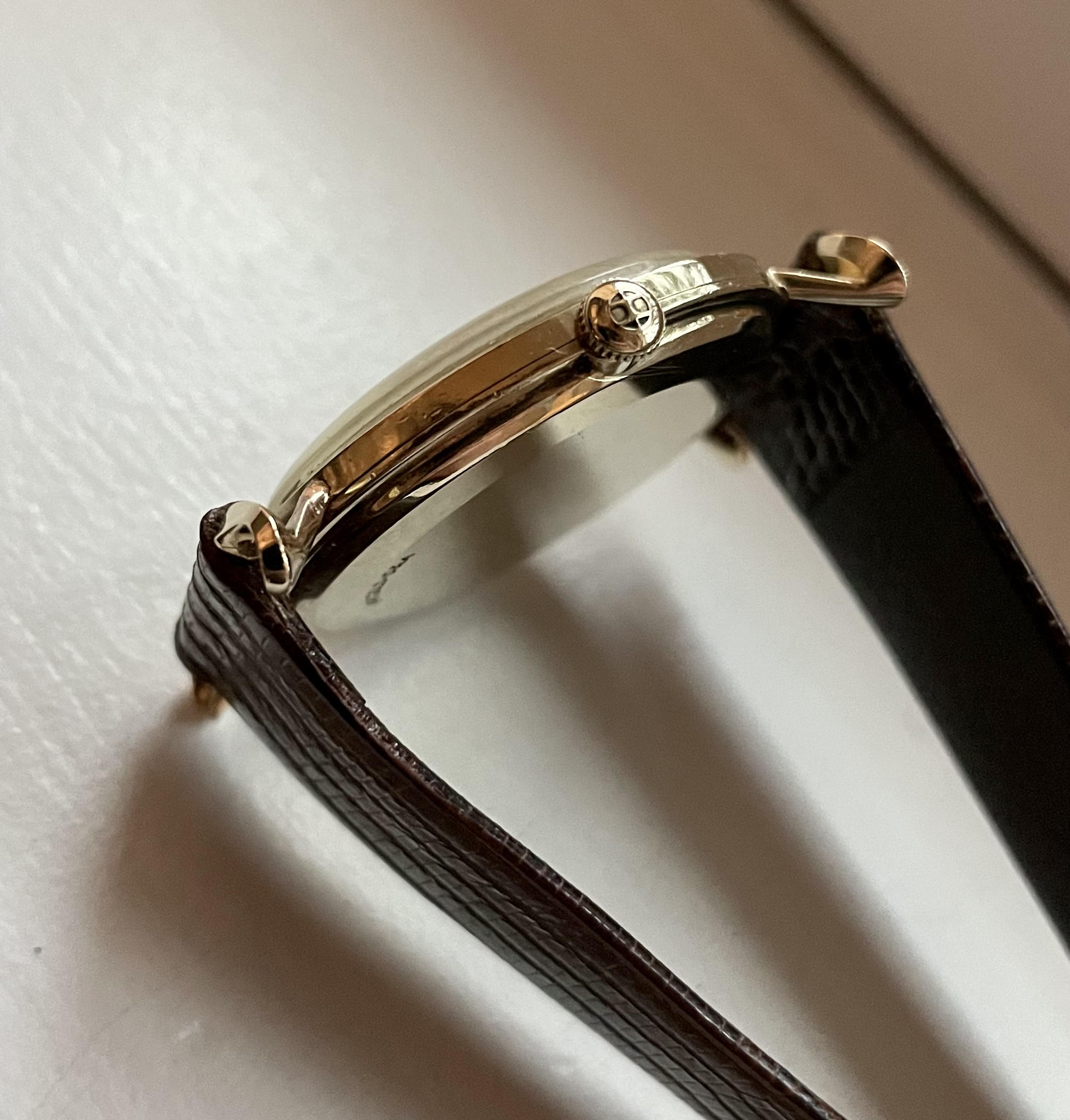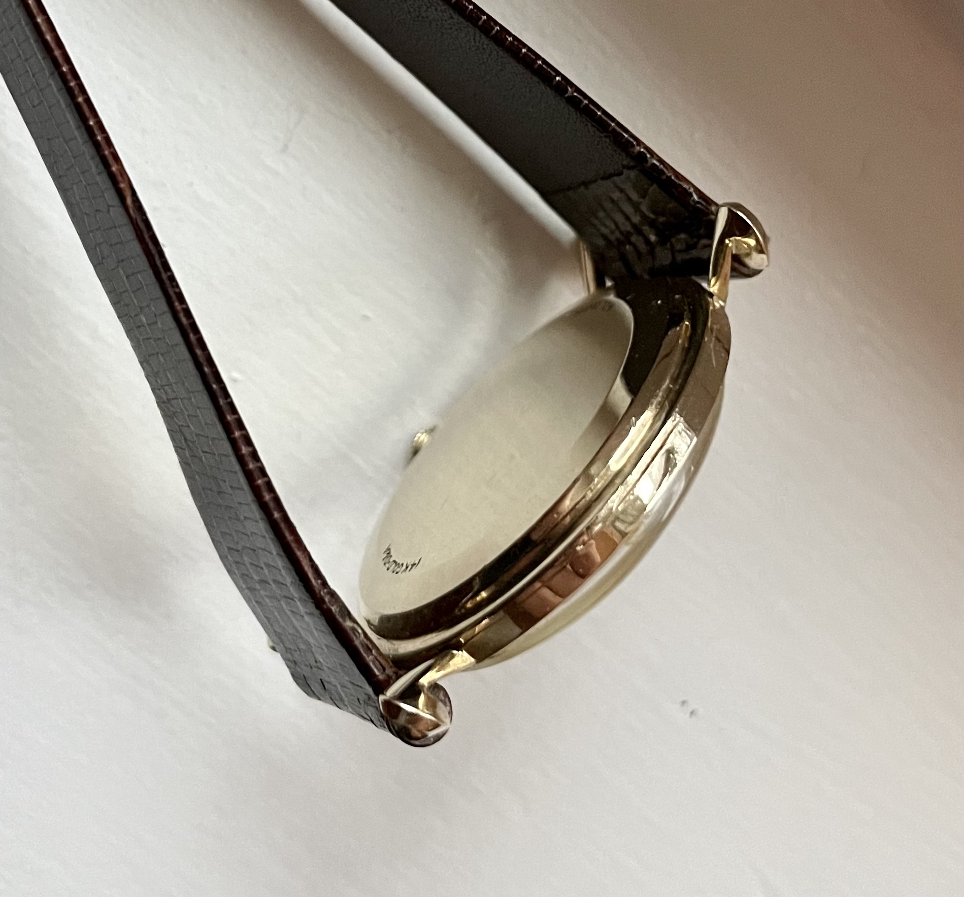 Based on the vintage catalogues, I’m fairly certain that this particular watch was manufactured in 1959. Earlier models had dot markers at 12 and 6 o’clock and later models did not have the rhombus shaped marker below the 12 o’clock marker.
