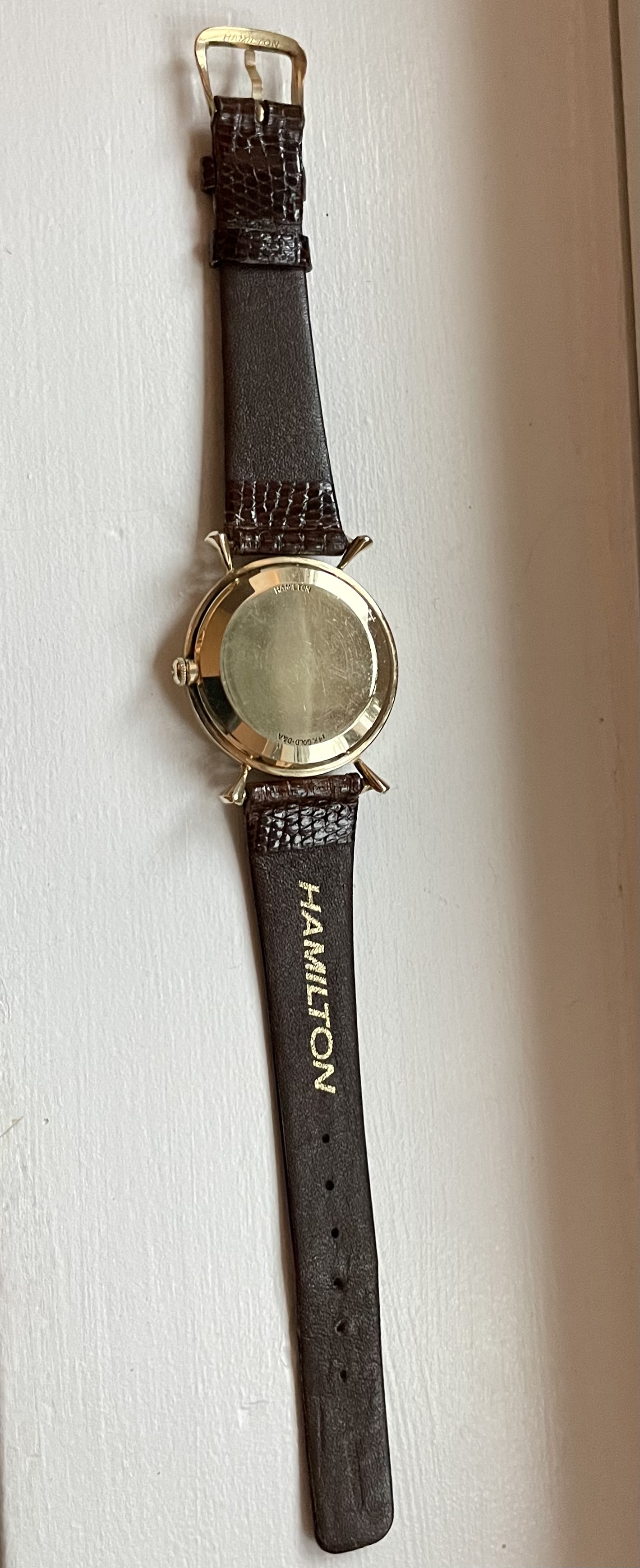 Inside is one of best and most reliable movements manufactured by Hamilton, the 22 jewel manually wound grade 770. I’ve owned the watch for about a year and it has kept good time. Service history is not known.