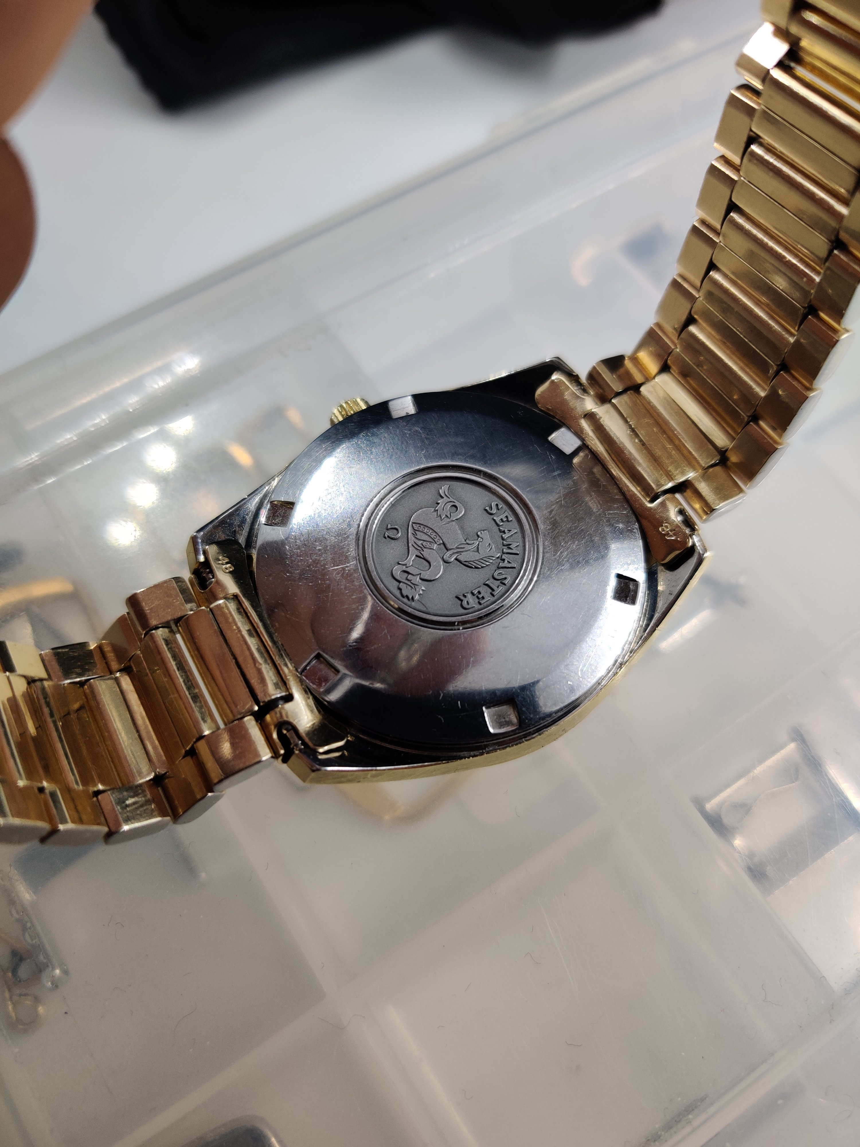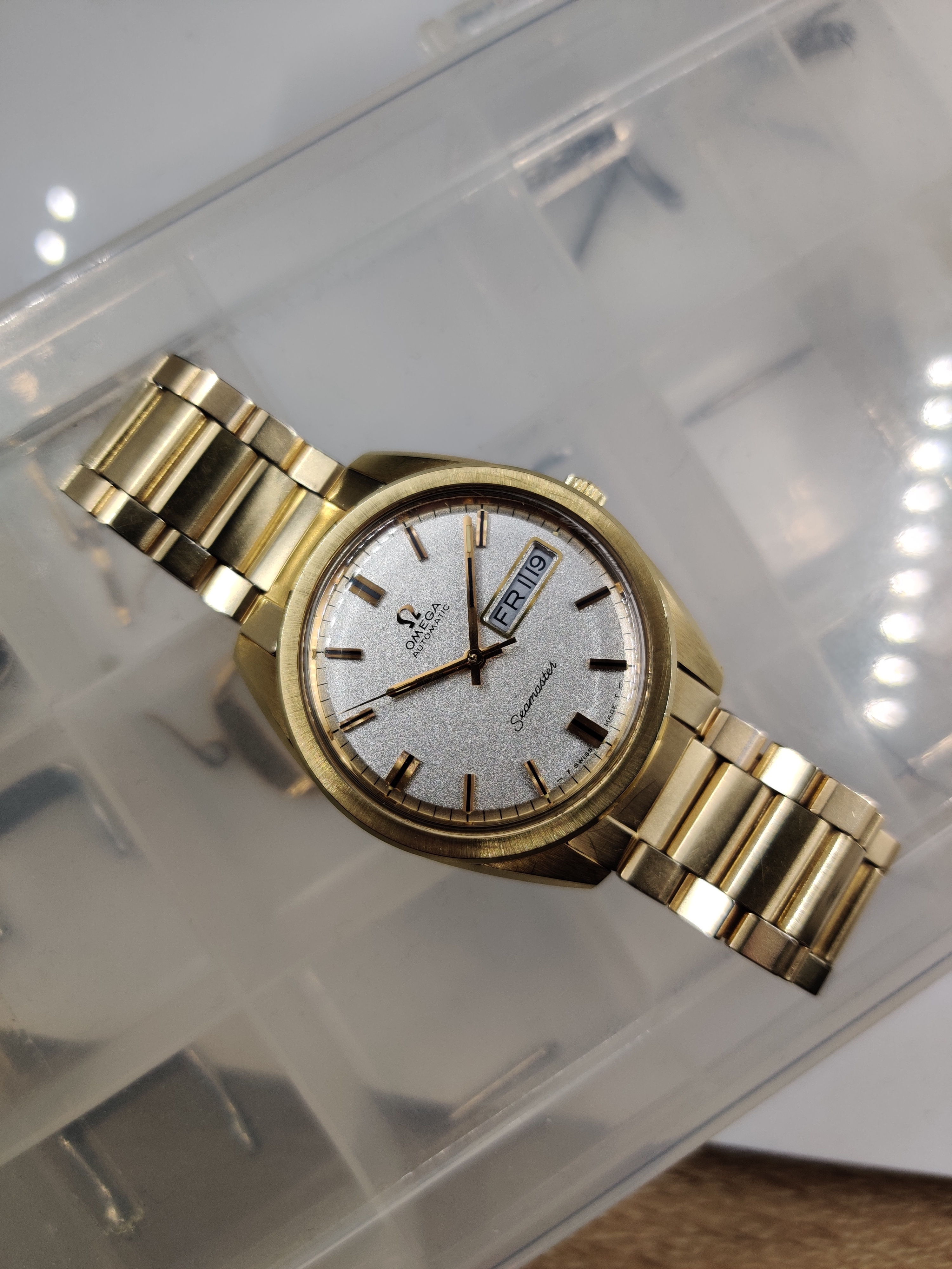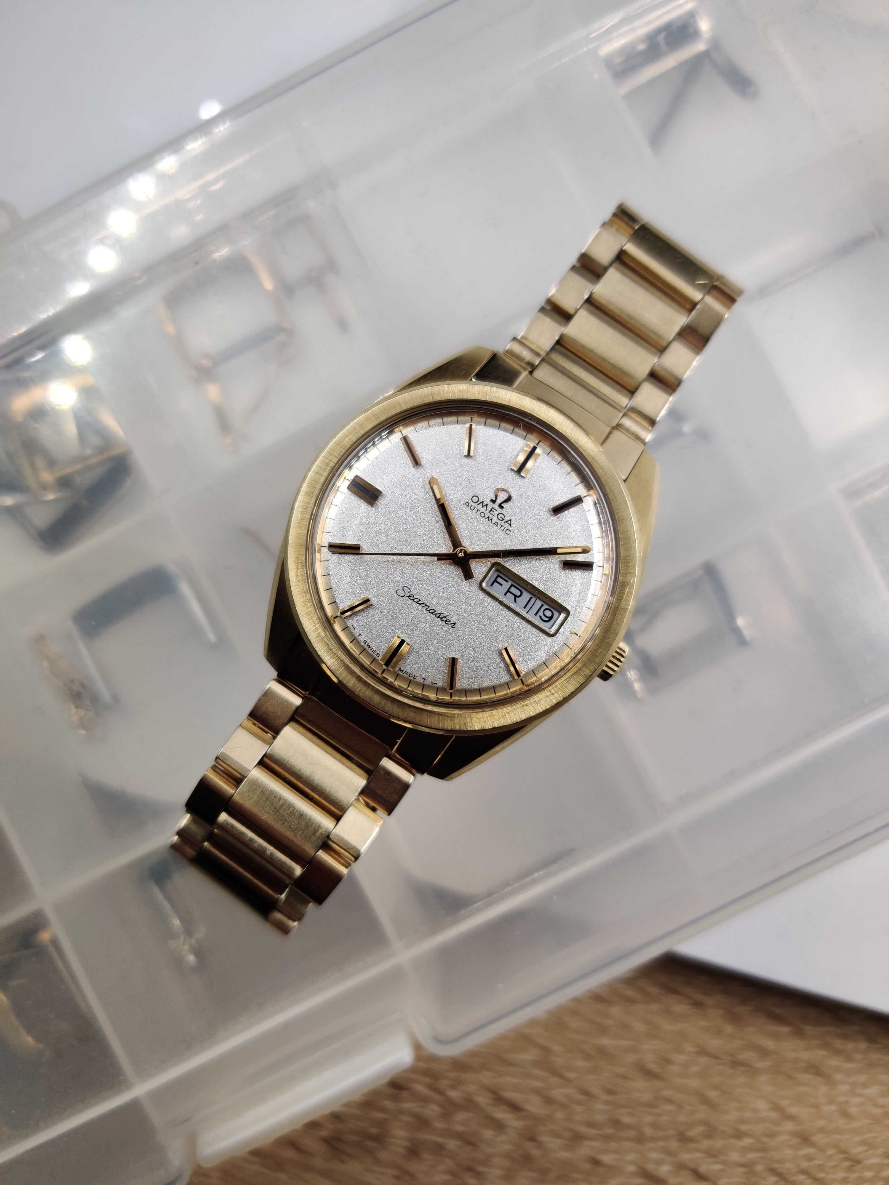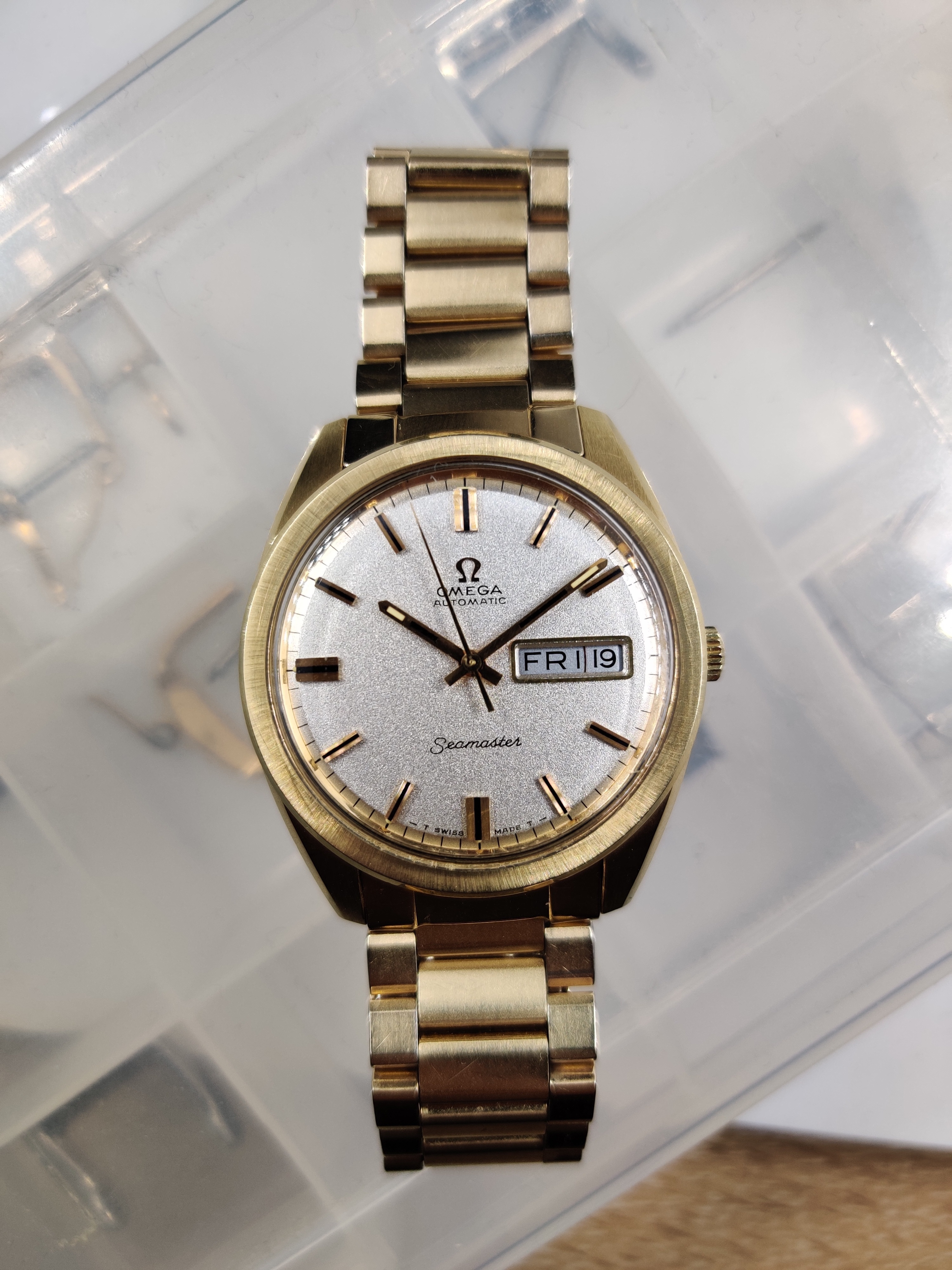 Up for sale is a very nice example of a 60s Seamaster Day-Date 168.032 with Cal.750. It is gold capped, but the gold cap is in good condition with very little wear. There are some very small spots on the bracelet, but overall the finishing on the watch head itself is nice with brushing still evident on the lugs and bezel. The dial and hands are in excellent condition. The watch runs but has not been serviced. I would recommend a service if to be used daily. If you have any questions, please let me know!