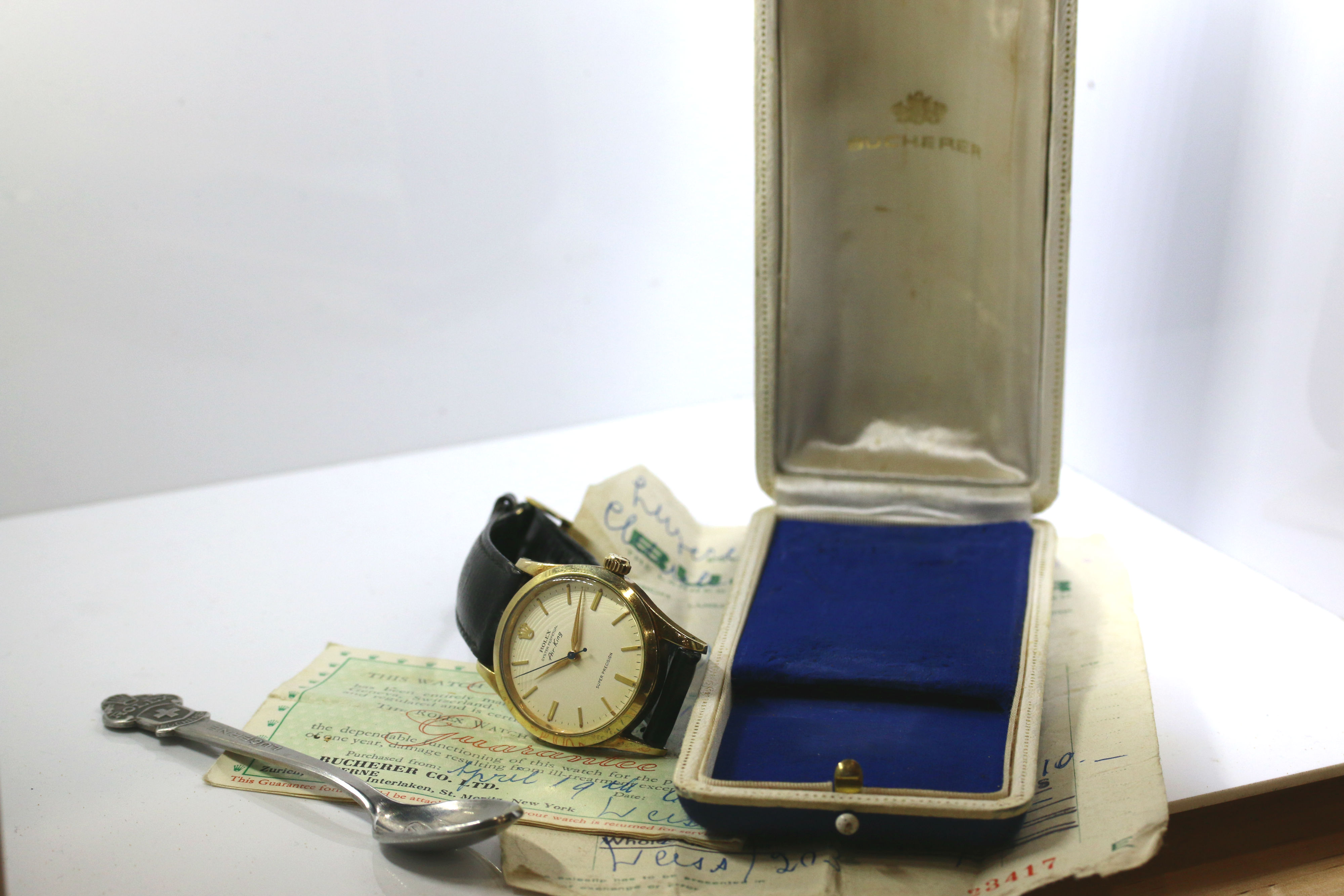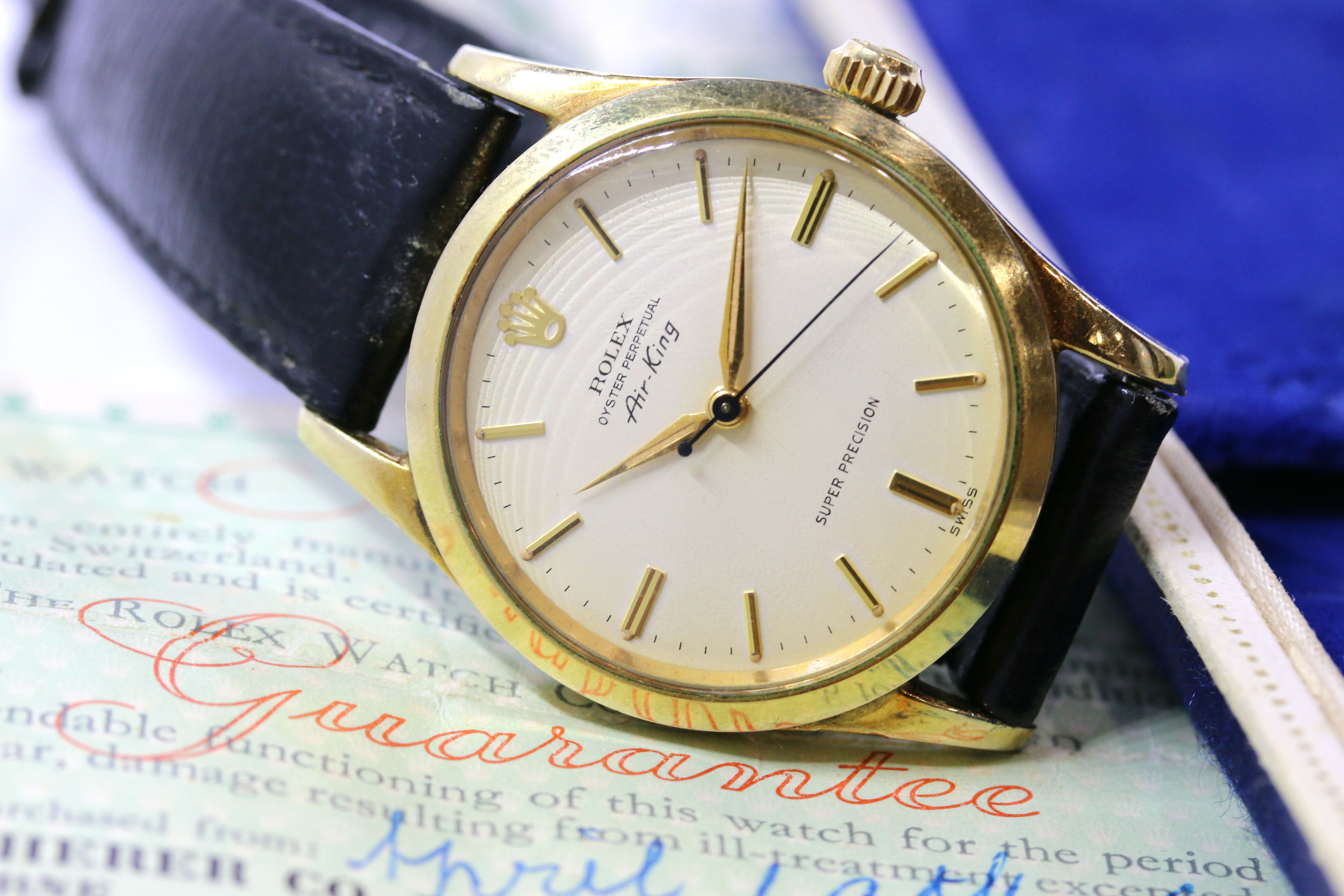 Up for sale is a nice example of a vintage Air-King. Gold filled case is in nice original condition with some marks. The dial and hands are in very good condition and are original. It comes with a Bucherer Box, receipt, Rolex guarantee, Rolex strap & buckle as well as a Rolex spoon. Movement appears very clean but has not been serviced in my possession. If you have any questions, please feel free to pm me!