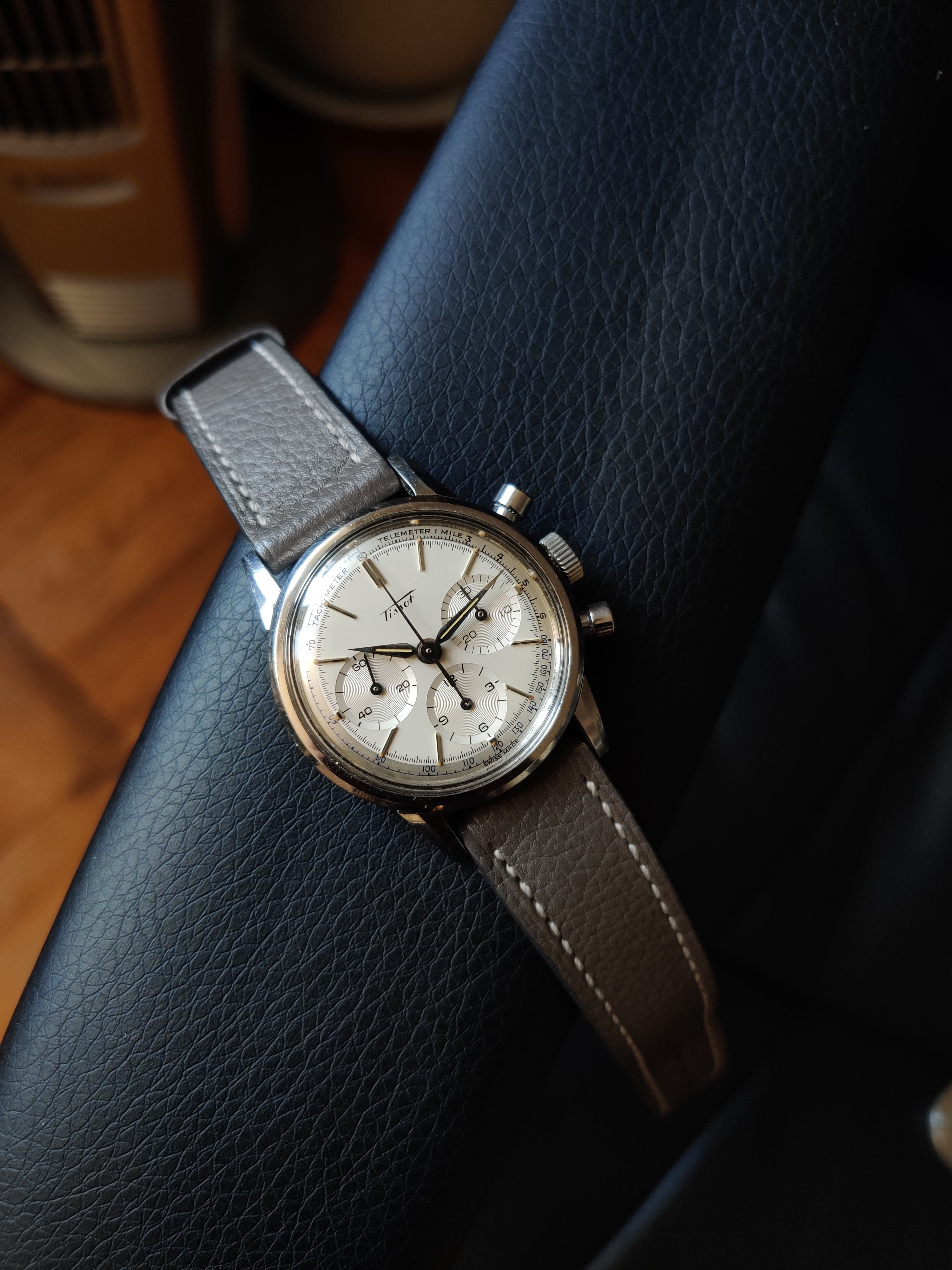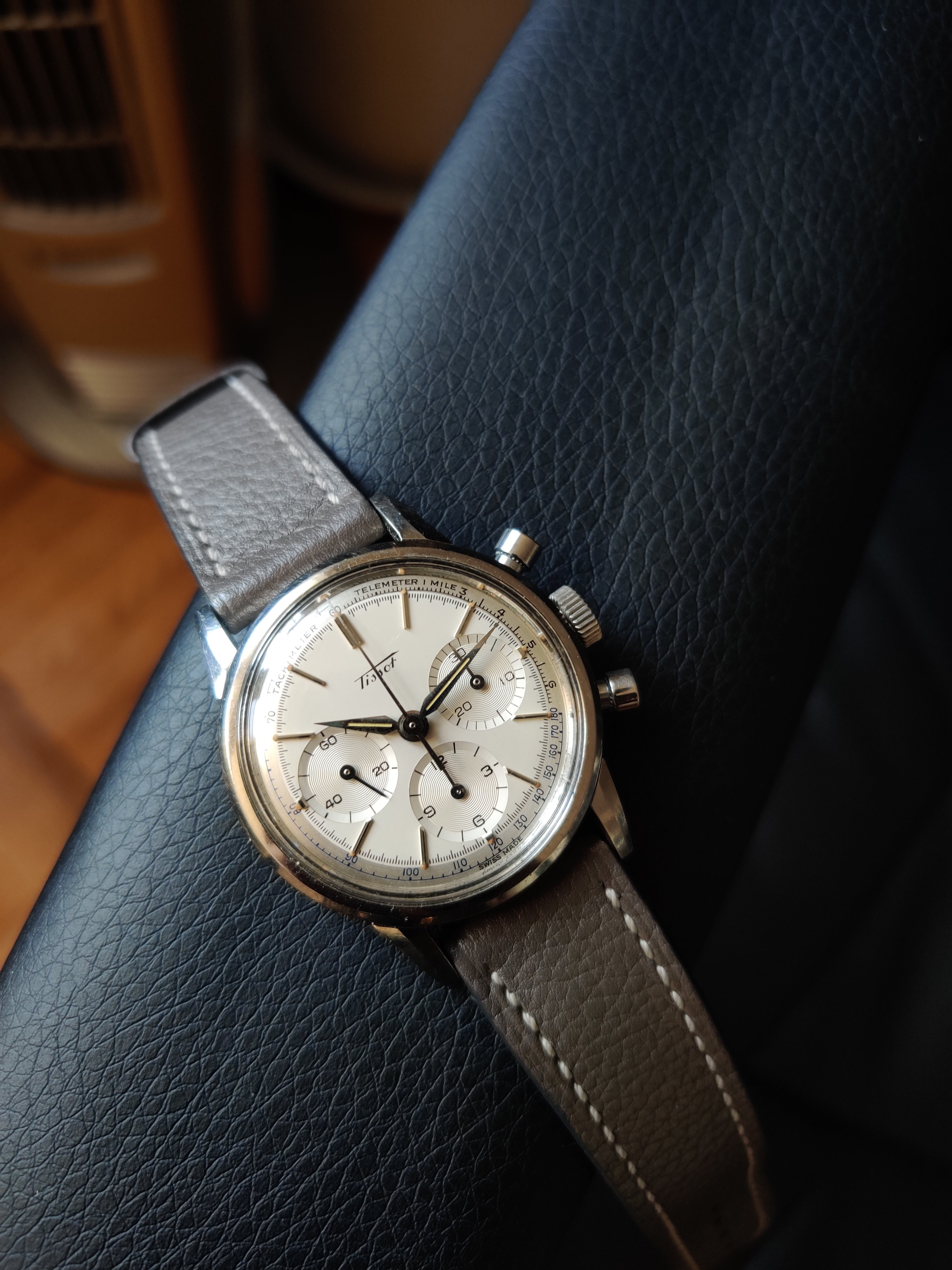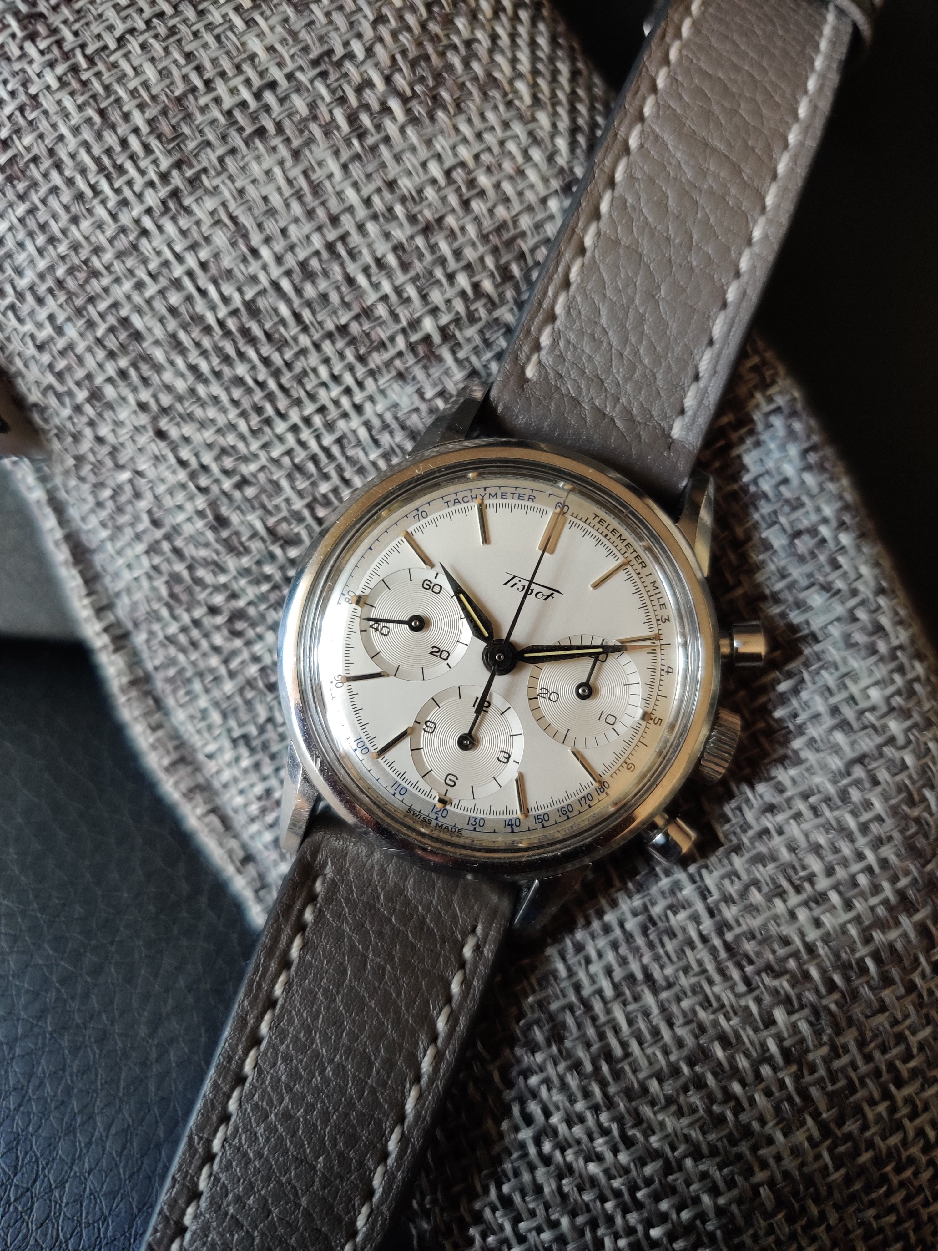 Up for sale is a minty Tissot Chronograph from the 60s. It has a Lemania 1281 recently serviced. Case measures about 34mm with 17mm lugs. Will be shipped on a different strap. The dial and hands are in very good condition with no blemishes. Watch comes with a display back and the original caseback. If you have any questions, feel free to pm me!