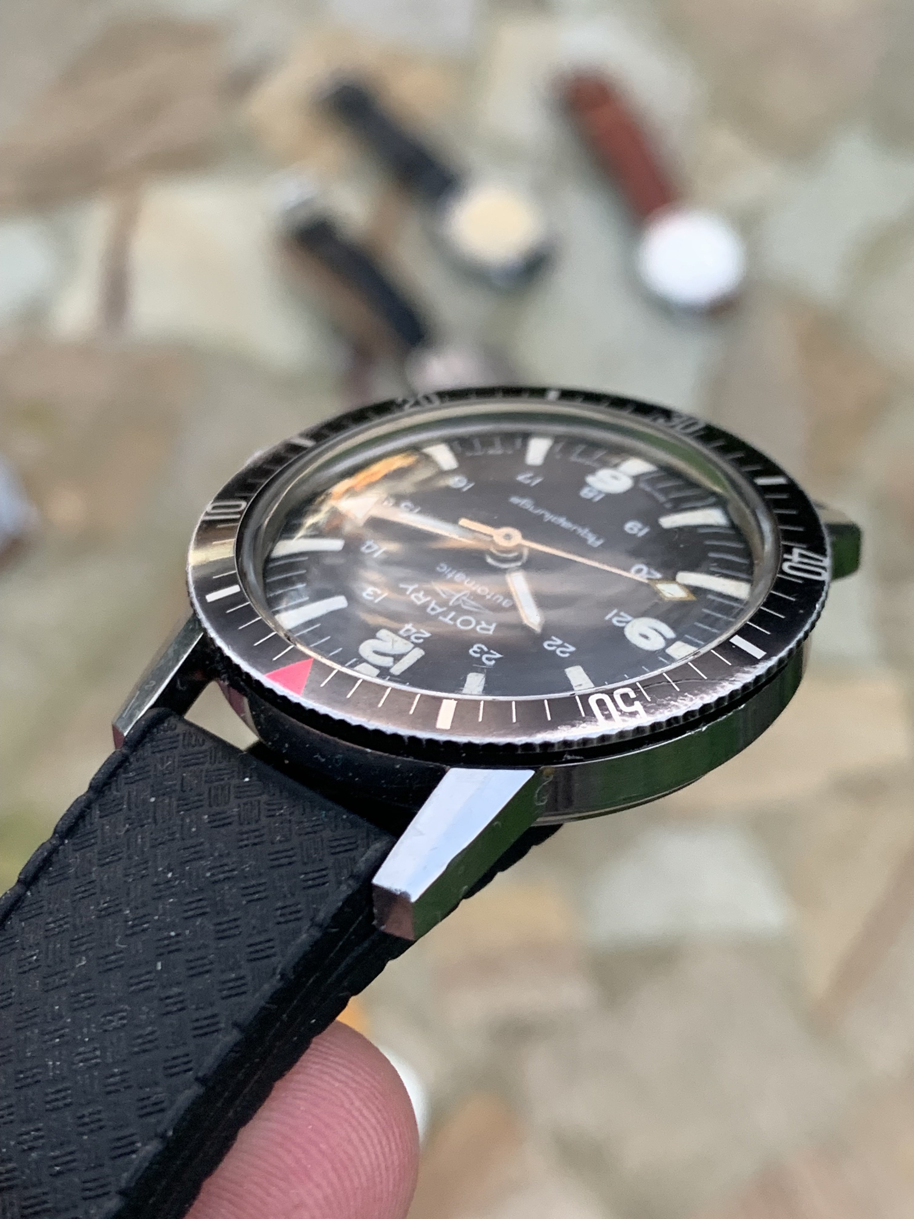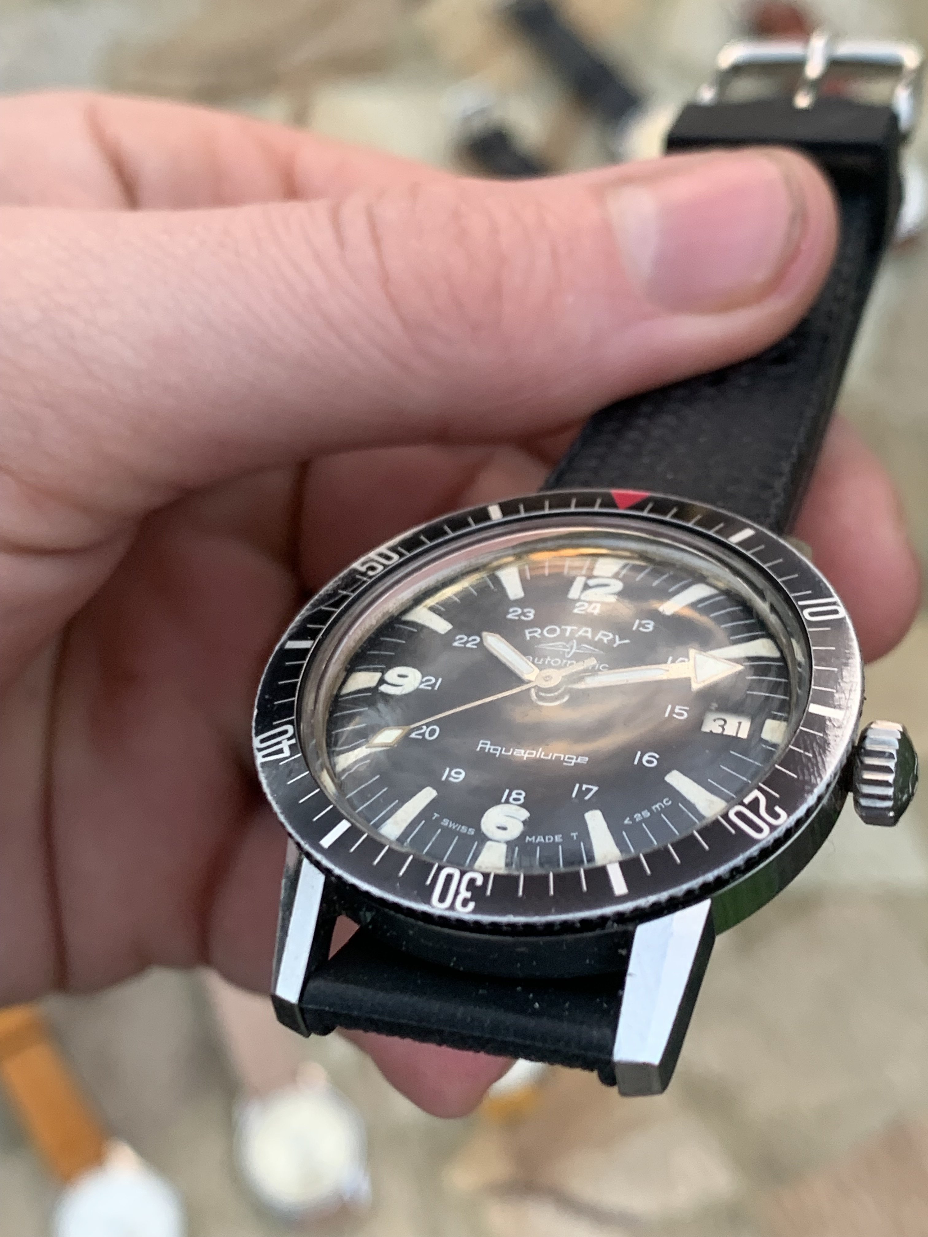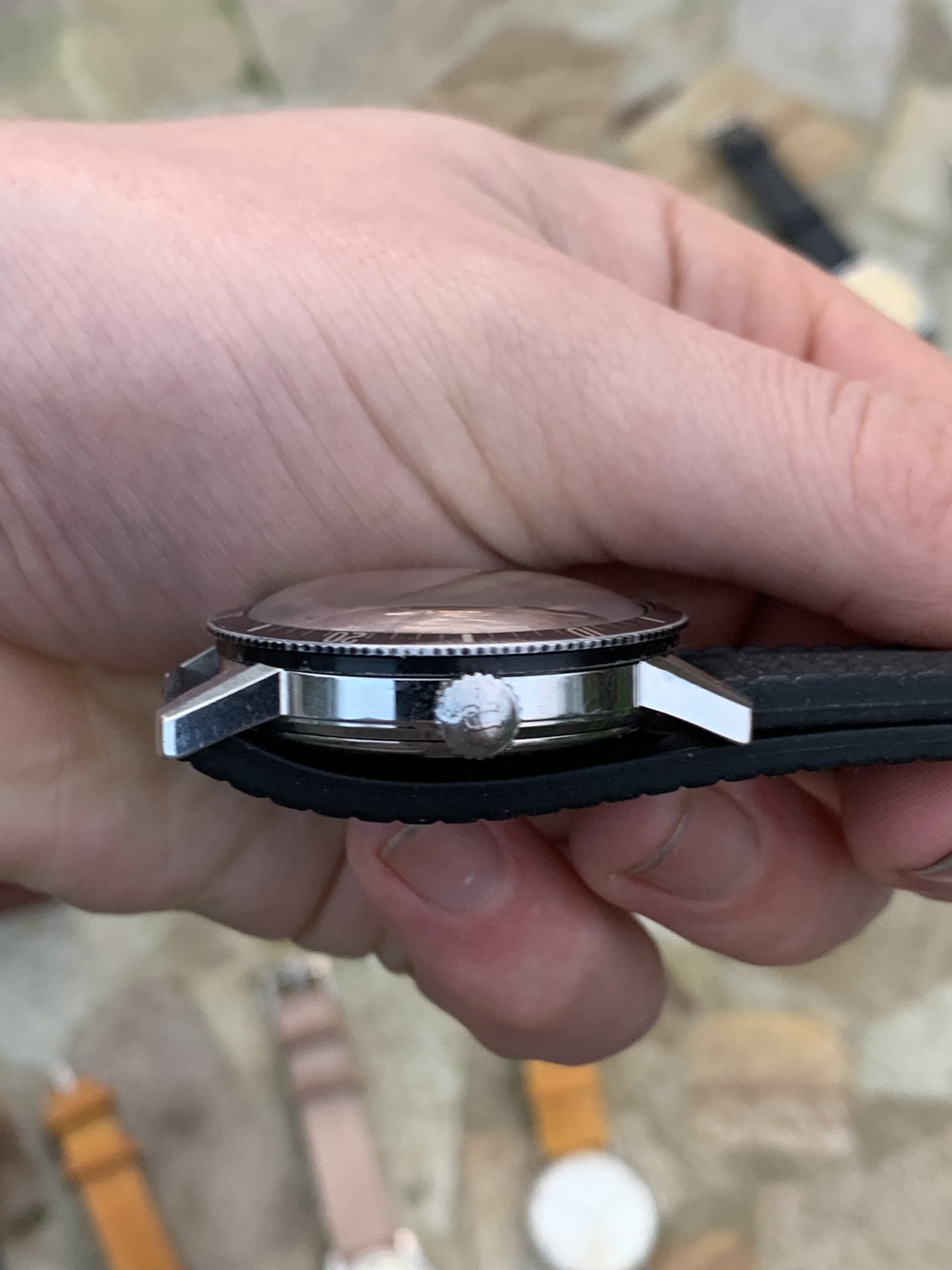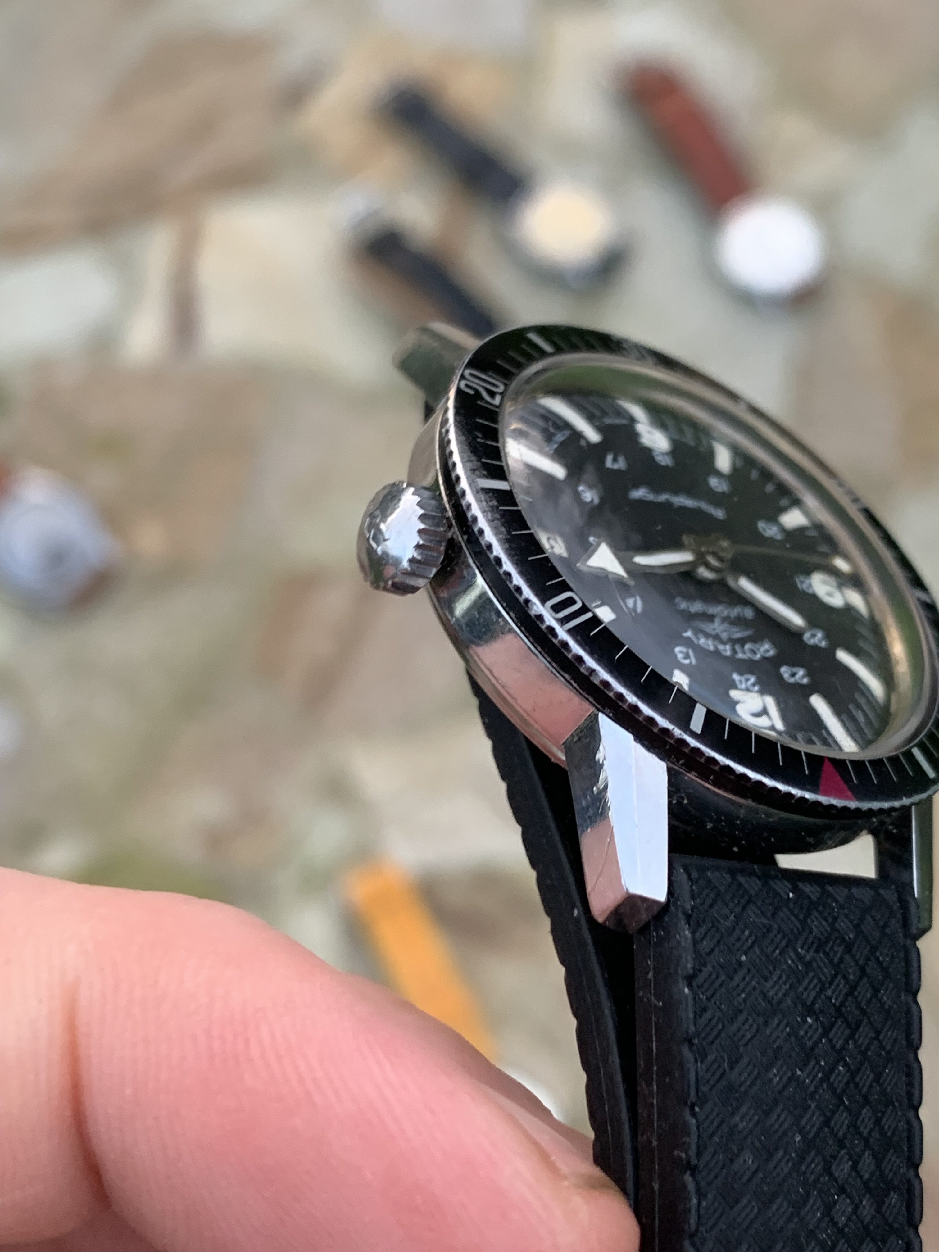 Case: The stainless steel case is in very good condition. All chamfers are very sharp, whilst it does have the odd knock here and there, it appears unpolished. The bezel has some wear which is commonplace on divers from this era, particularly at 3 o'clock, likely the user winding the crown - so it has certainly been well loved in it's 60 years. I find it absolutely charming, it is a used and loved timepiece, but in remarkable condition. It measure approximately 36mm in diameter without crown and the crown appears to be original.