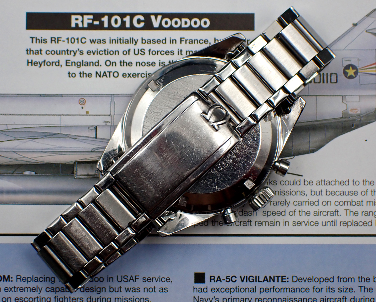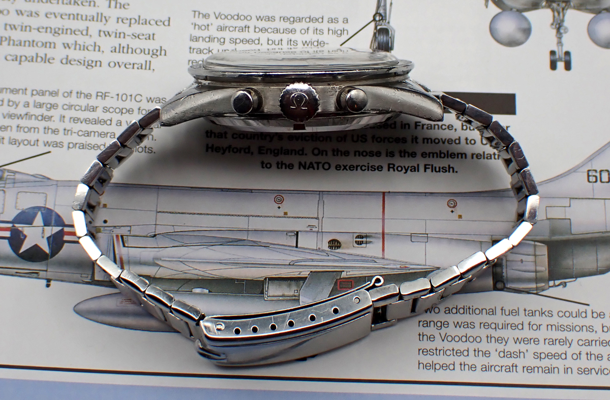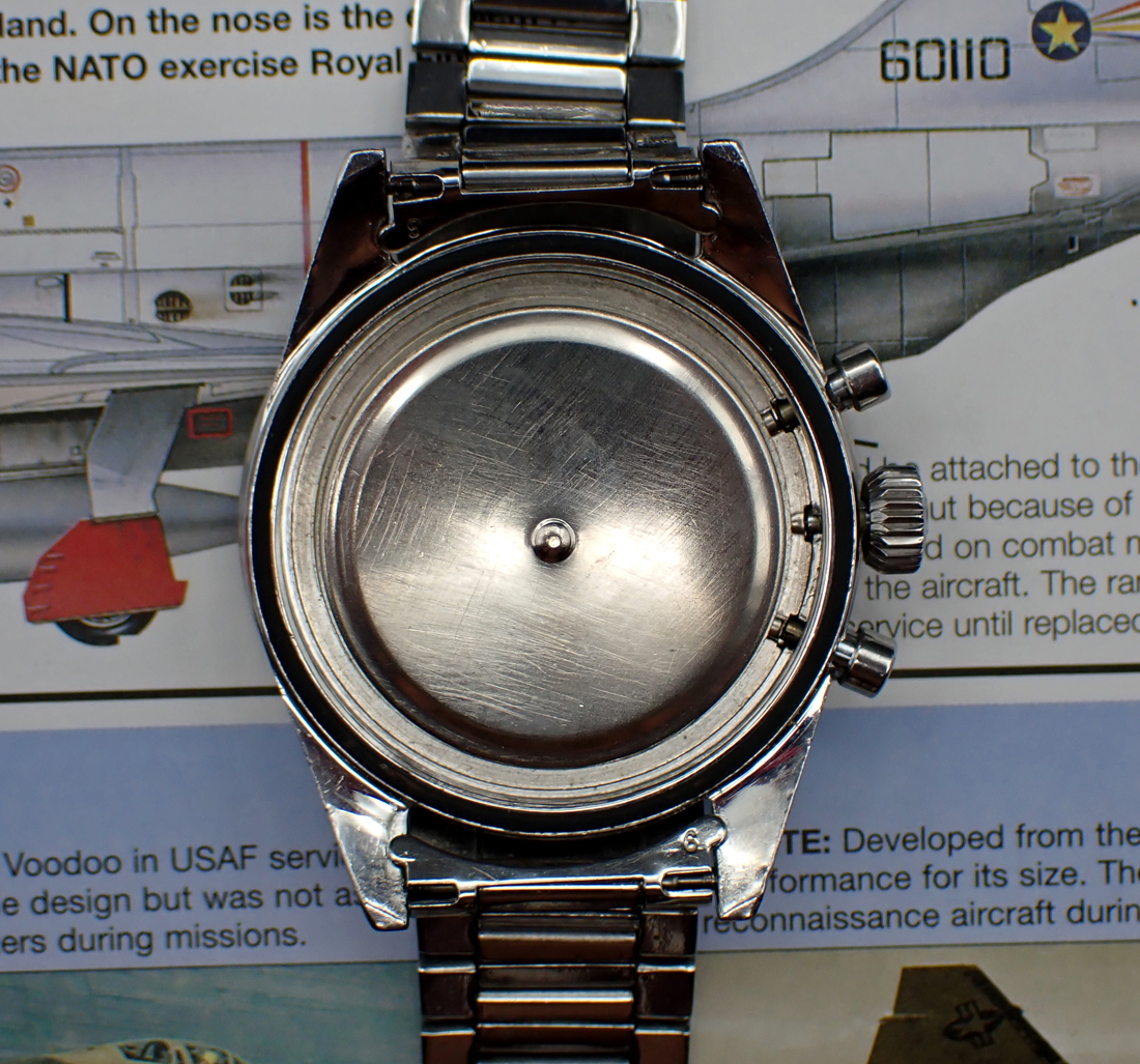 Overall, the watch is in Very Good vintage condition and it comes on a slightly later (1963) 7912 flat-link bracelet with very hard to come by number 6 end links, correct for the 19mm lug width of this straight, no-crown guards case. (If for some reason you don’t want the bracelet, I’m sure we can work out an appropriate discount for the head onIy.) I have also just had the movement preemptively overhauled for the enjoyment of the next owner, so it is ready to wear with all timekeeping and chronograph functions operating well.