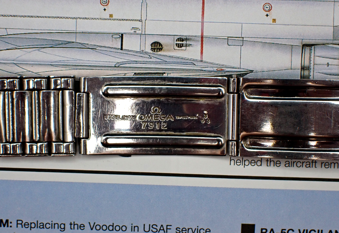 BRACELET: Period & model correct ref. 7912 flat-link stretch bracelet dated 3/63 in Excellent condition, with only light stretch and good, tight expansion links and just some light scratches here and there and to the big logo clasp. End pieces are the rare & matching genuine OEM Omega 19mm #6s, a significant value in their own right and pretty hard to source these days. The bracelet is not the longest but should still fit up to around a 7 1/2” wrist at maximum adjustment, albeit a little snugly perhaps. As mentioned above, if for some reason you don’t want this nice 7912 bracelet with matching 6 end pieces I’m sure we can work out an appropriate discount.