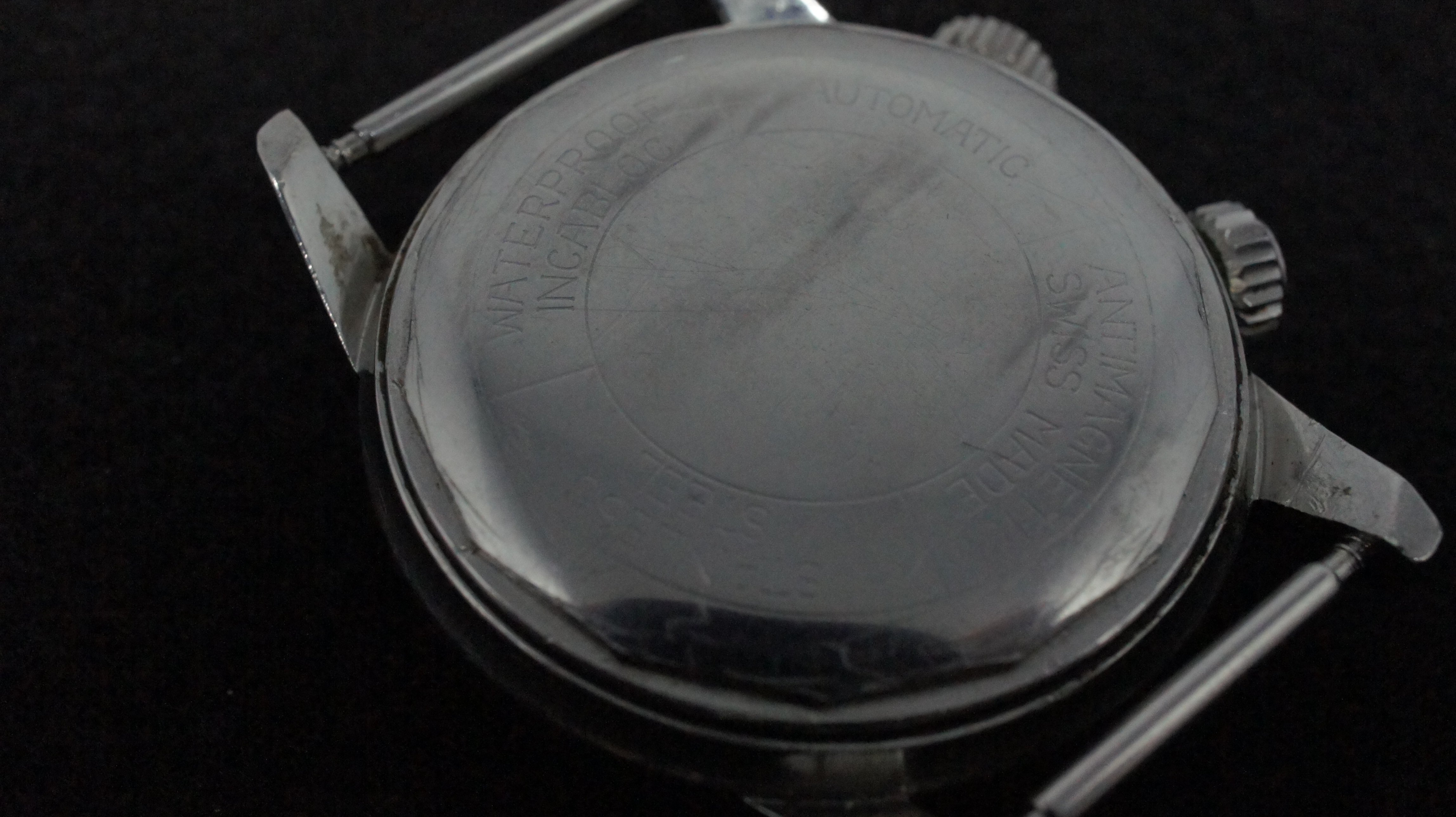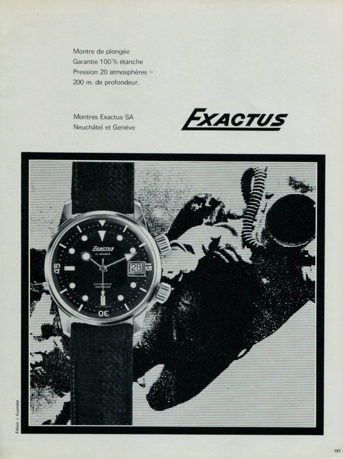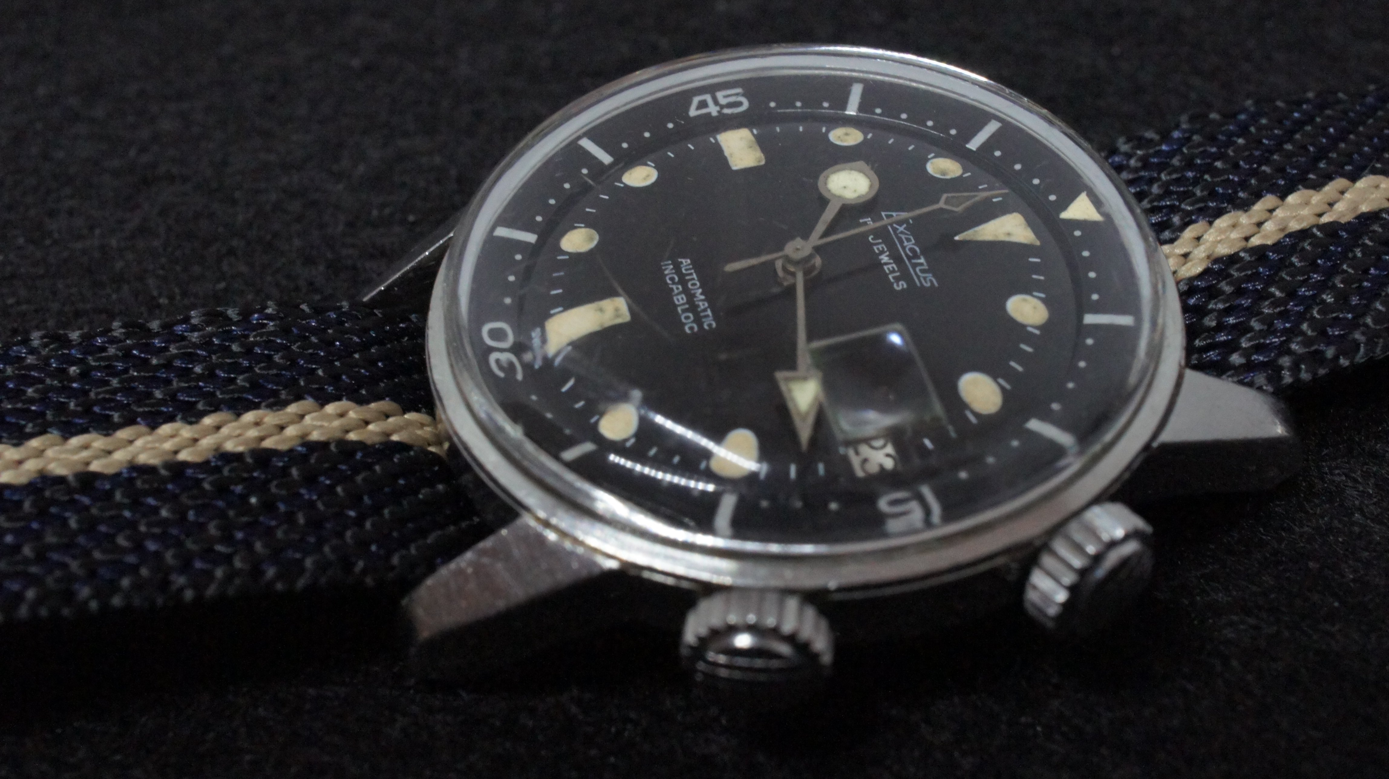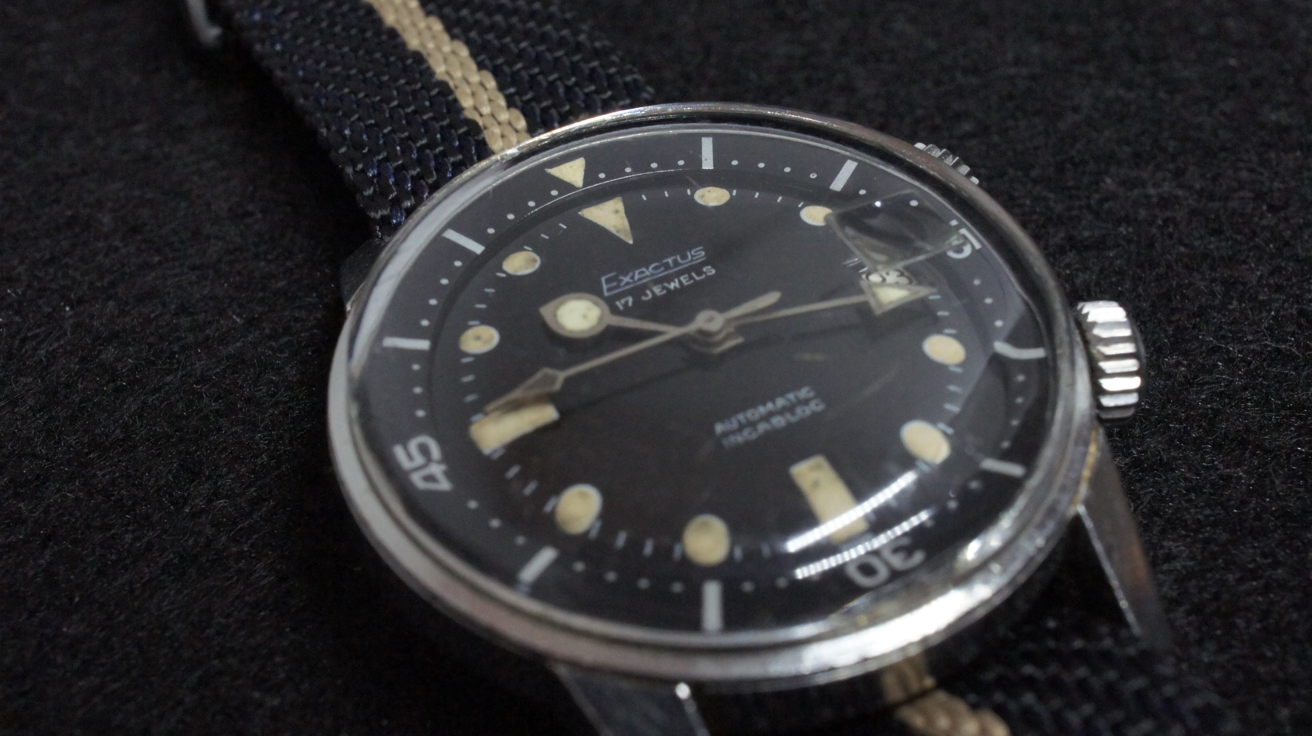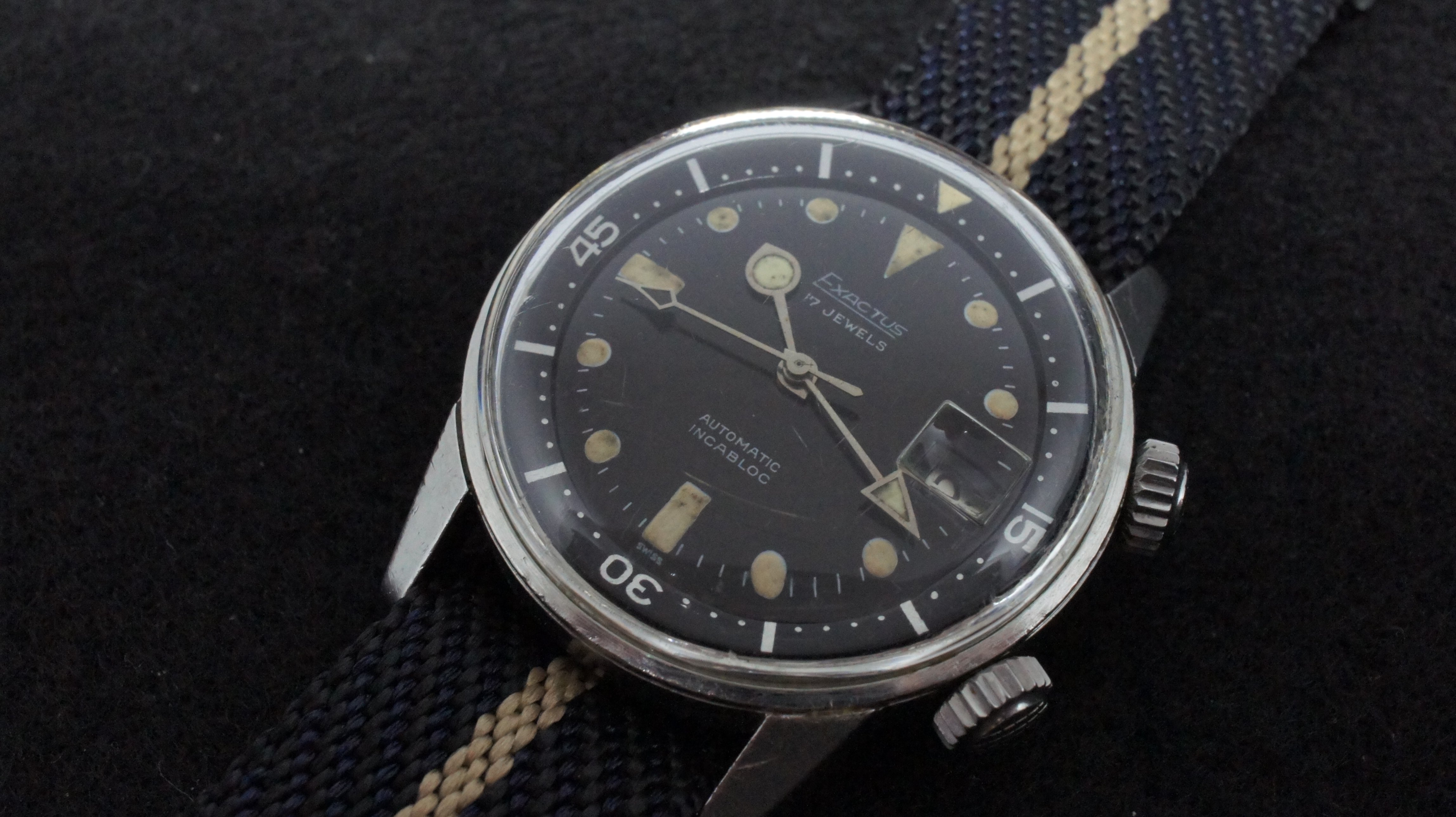 ·This vintage Exactus Super Compressor dates to October, 1962. Watch is all original condition, featuring cross-hatched crowns, original thick diver crystal and AS 1700 17 jewel automatic Incabloc movement. Of special note are the wonderful and unique hands that make this a standout classic 1960's EPSA Super Compressor. Nicely aged lume. Rotating inner bezel functions. The last movement service is unknown, but it functions and is keeping reasonable time. Included in the images is a 1967 Exactus ad for this watch. REDUCED US$825 includes paypal/shipping Canada/US.