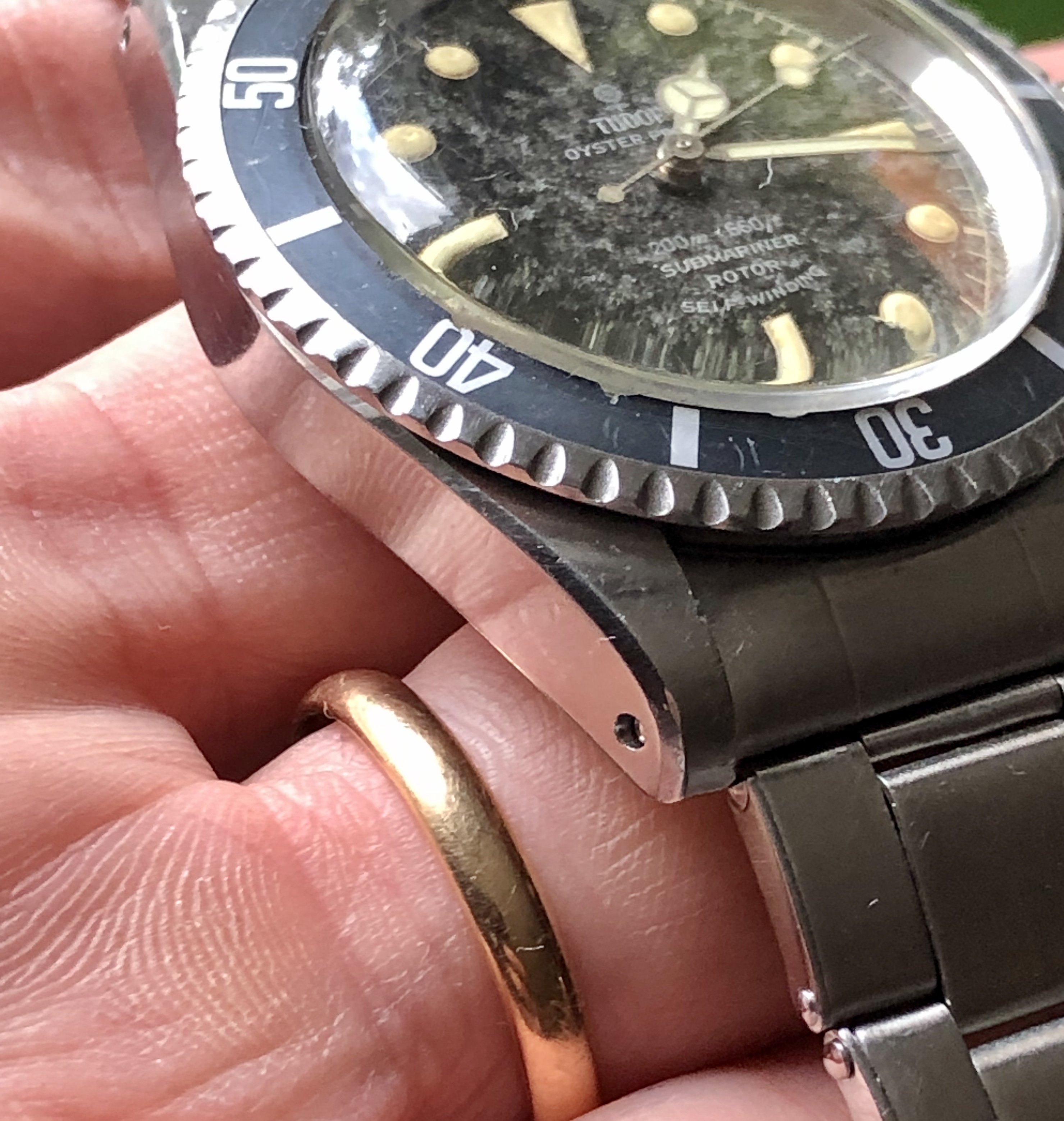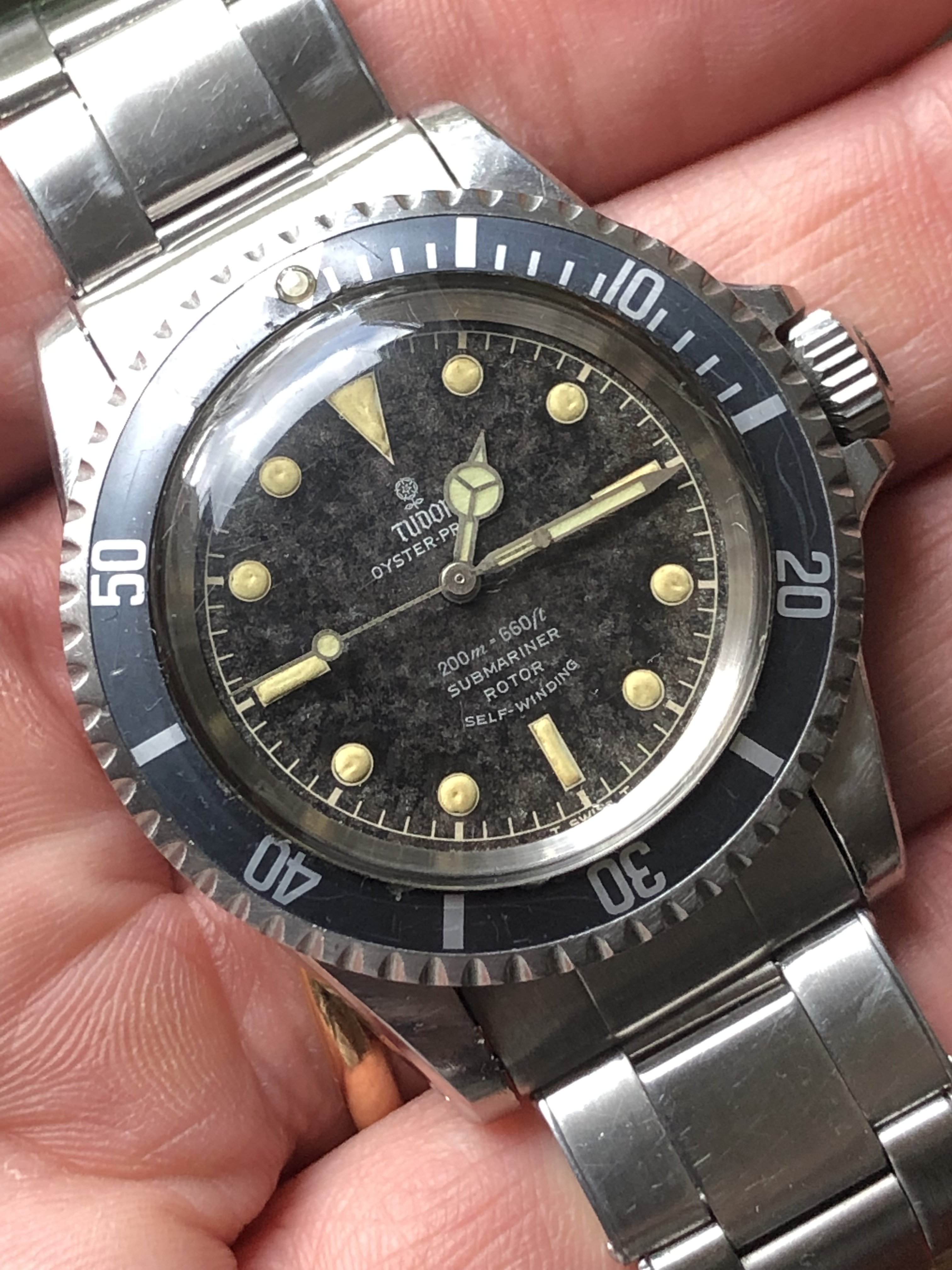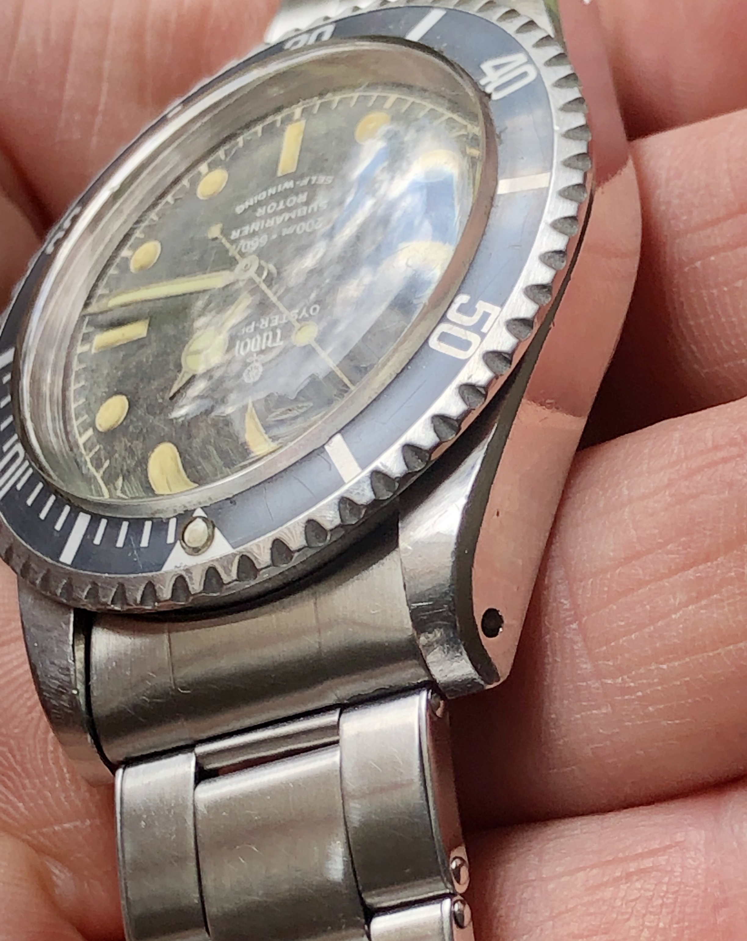 Excellent chapter ring T SWISS T dial with silver print and patina from age. The dial has faded to a dark spotty gray, almost marble looking. The Tritium luminous material on hands and markers has aged to a creamy yellow and still glows briefly when put under light.