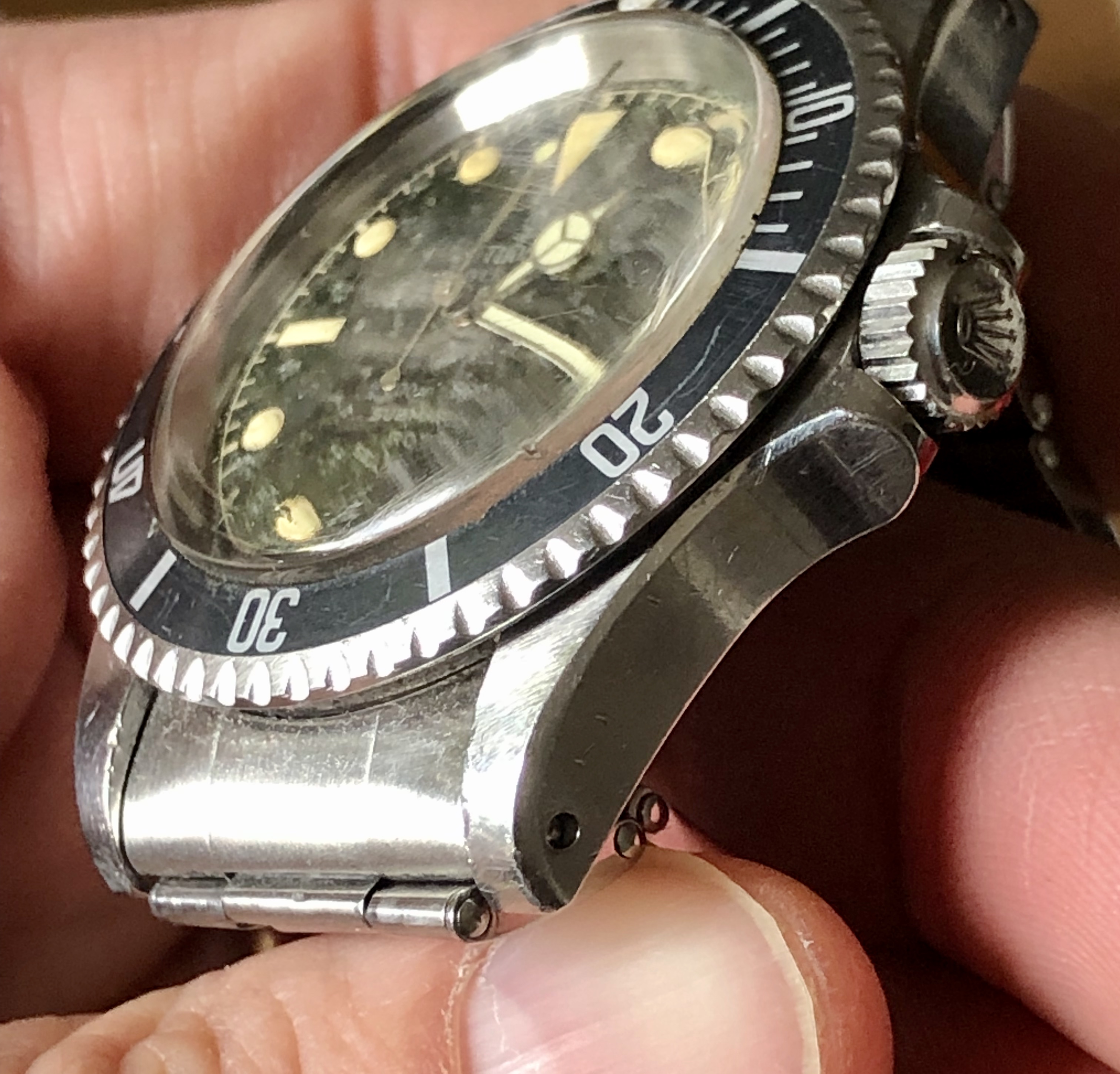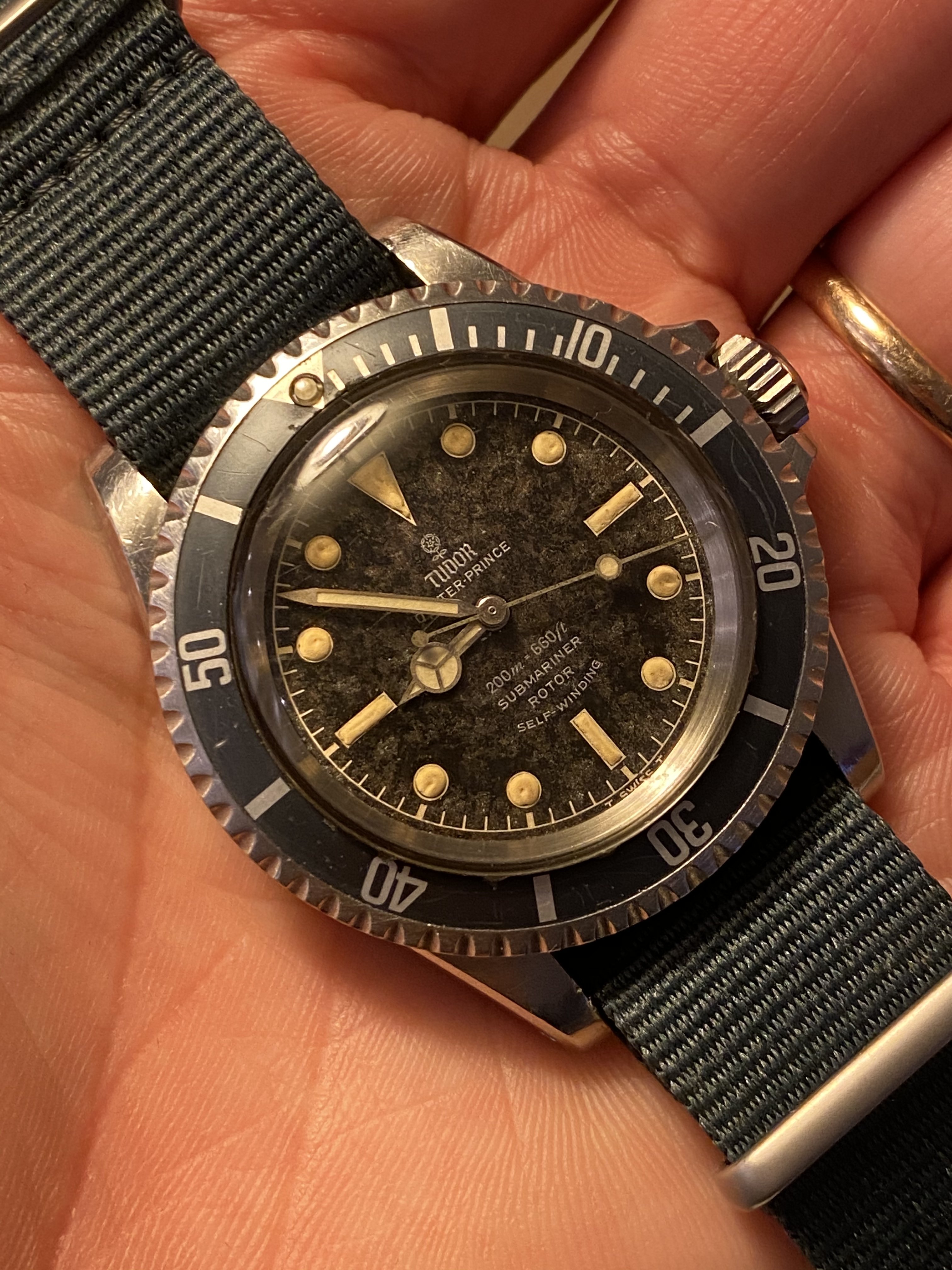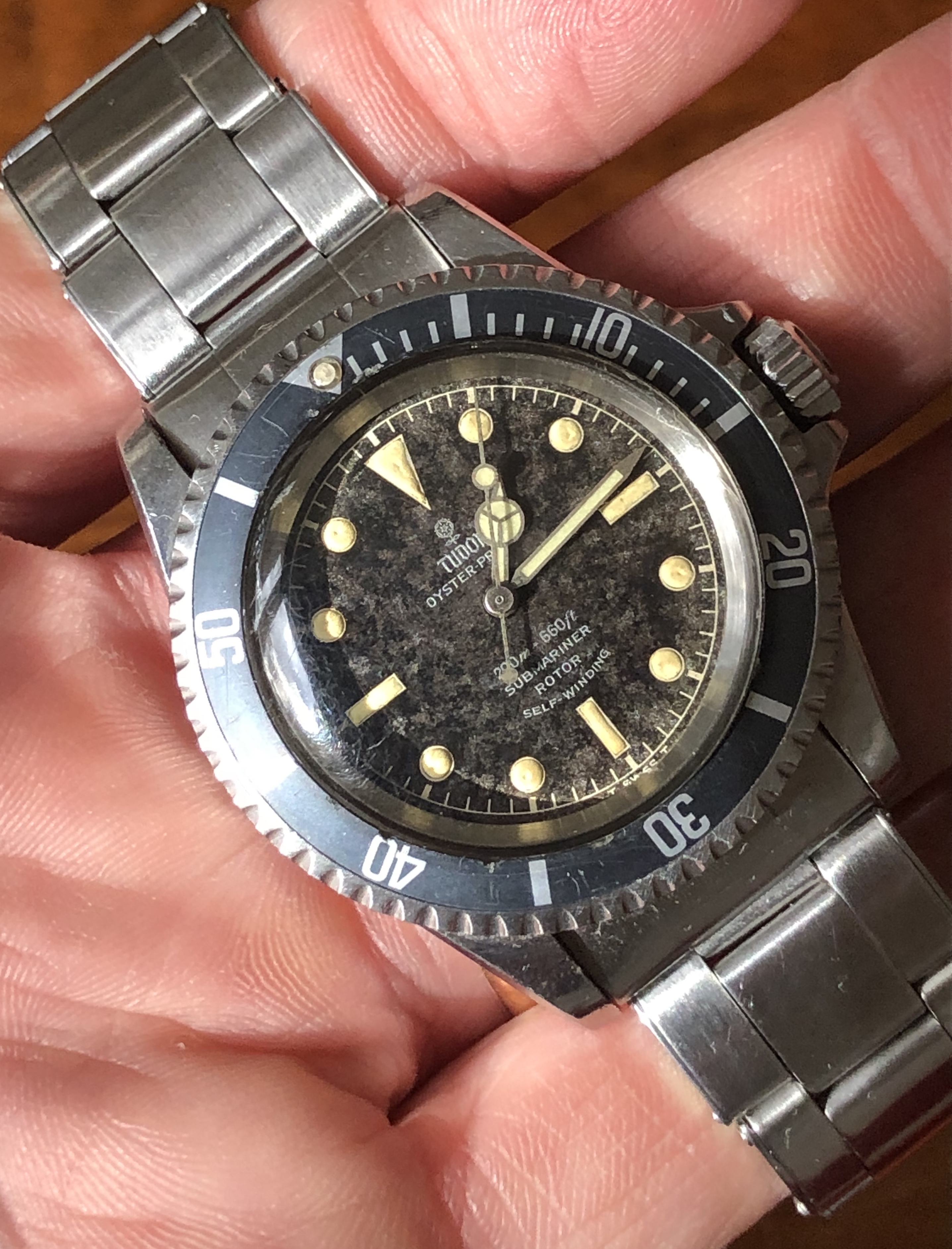 Excellent chapter ring T SWISS T dial with silver print and patina from age. The dial has faded to a dark spotty gray, almost marble looking. The Tritium luminous material on hands and markers has aged to a creamy yellow and still glows briefly when put under light.