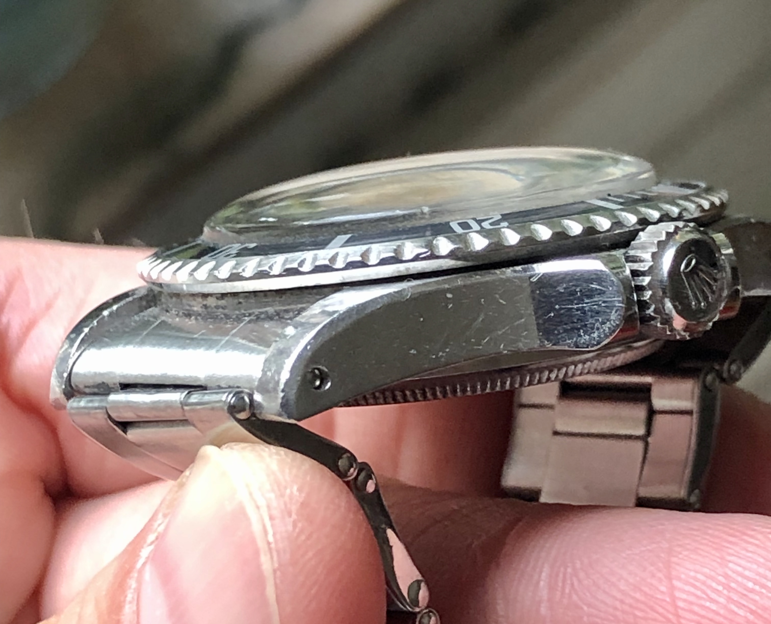 Excellent thick case that has original bevels with some wear from use. One of the best cases I ever had. Long 5 insert with blue/gray fade with light wear The case back is stamped 7928 III. 65