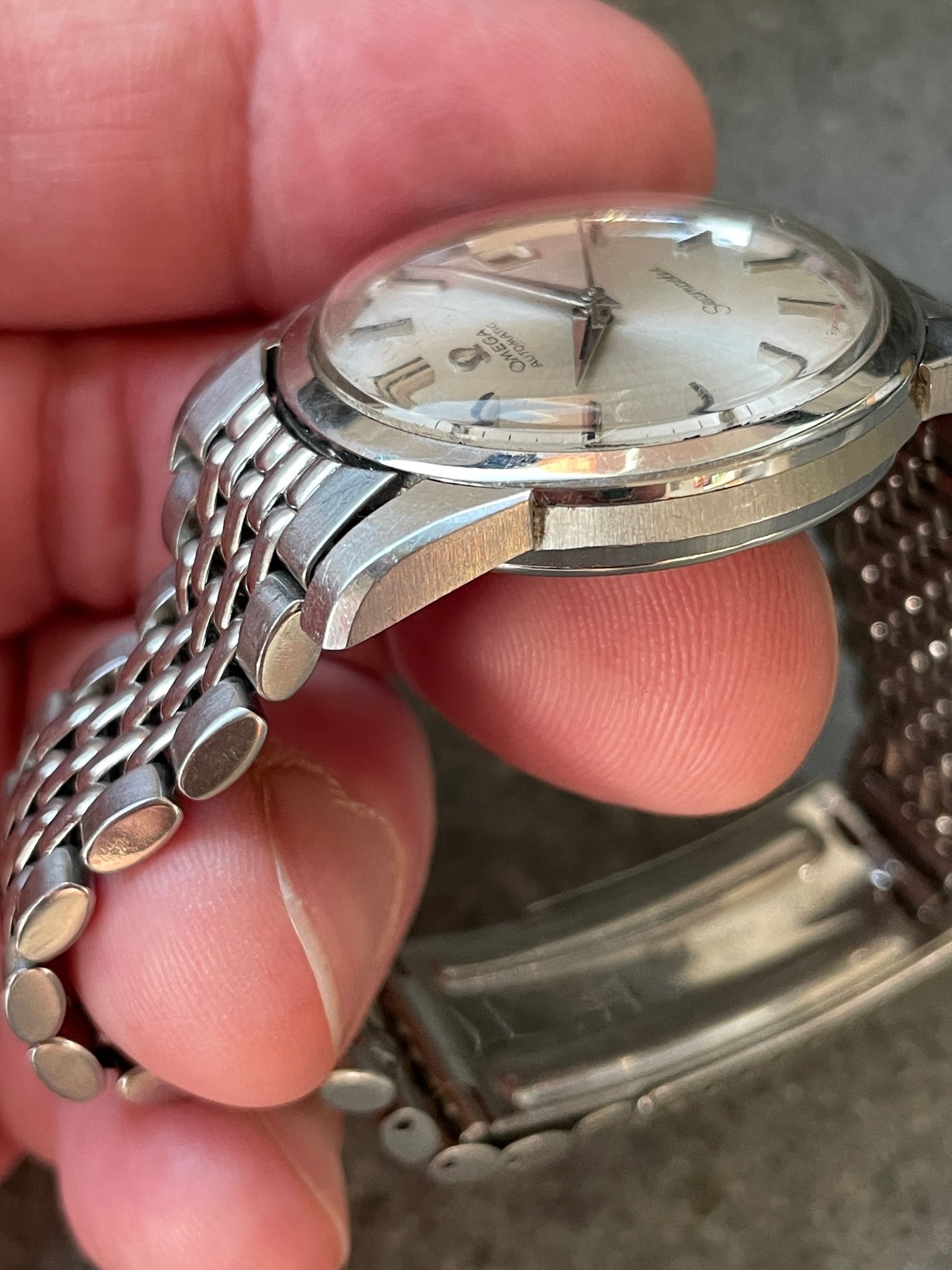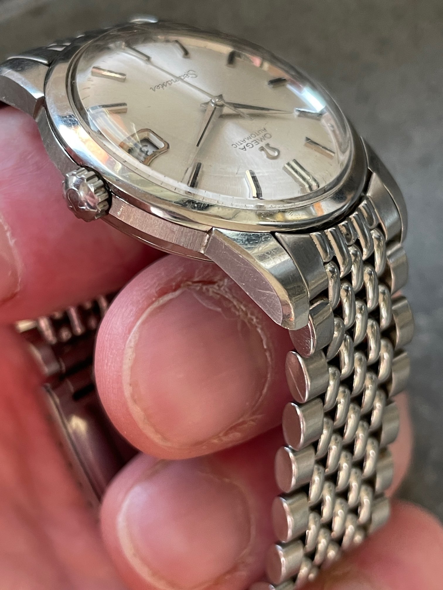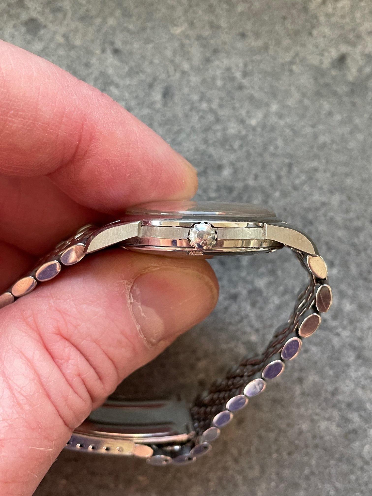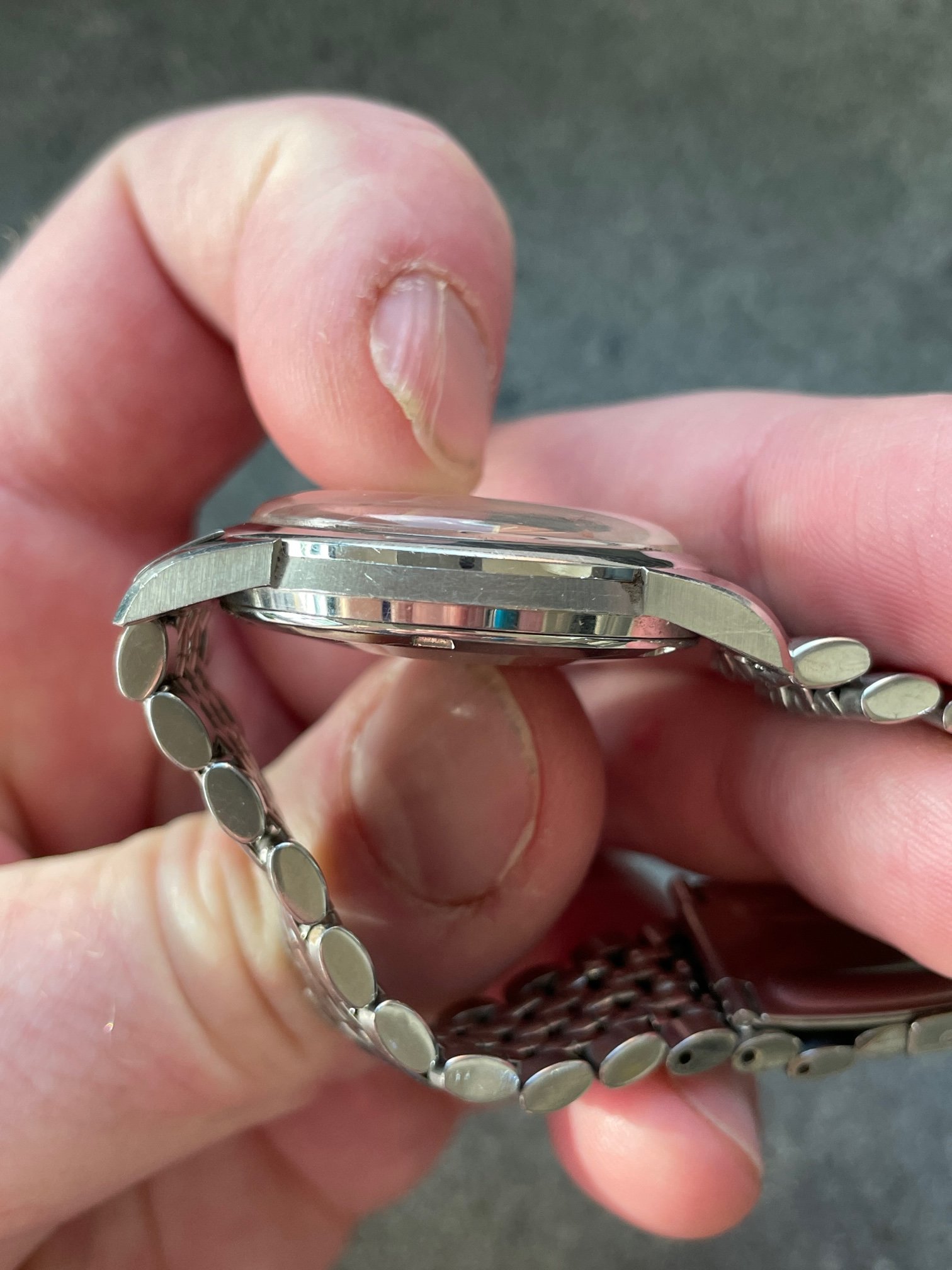 ·This seduced me because of its condition. I'm not sure how much it got worn, but my word—look at the brushing on the sides, the bevels on the lugs. Pretty remarkable overall—original scalloped crown, original 1036/512 bracelet is *just* a bit small—it's tight on my 7.25" wrst. I'm not seeing a hippocampus on the crystal, so I presume it's a generic replacement at some point.