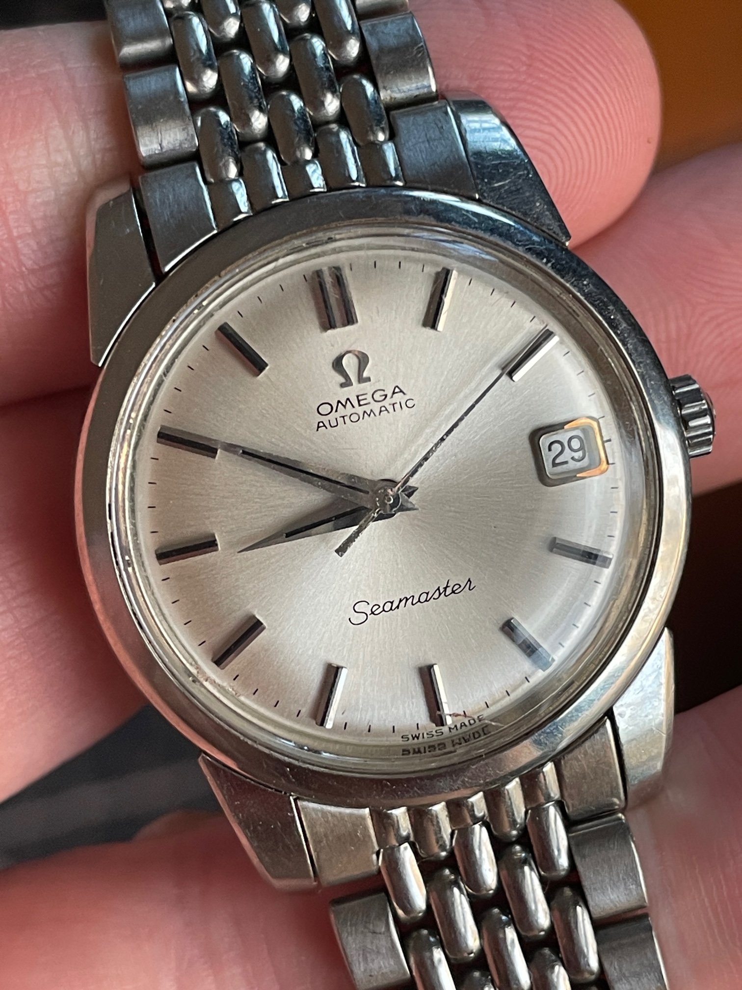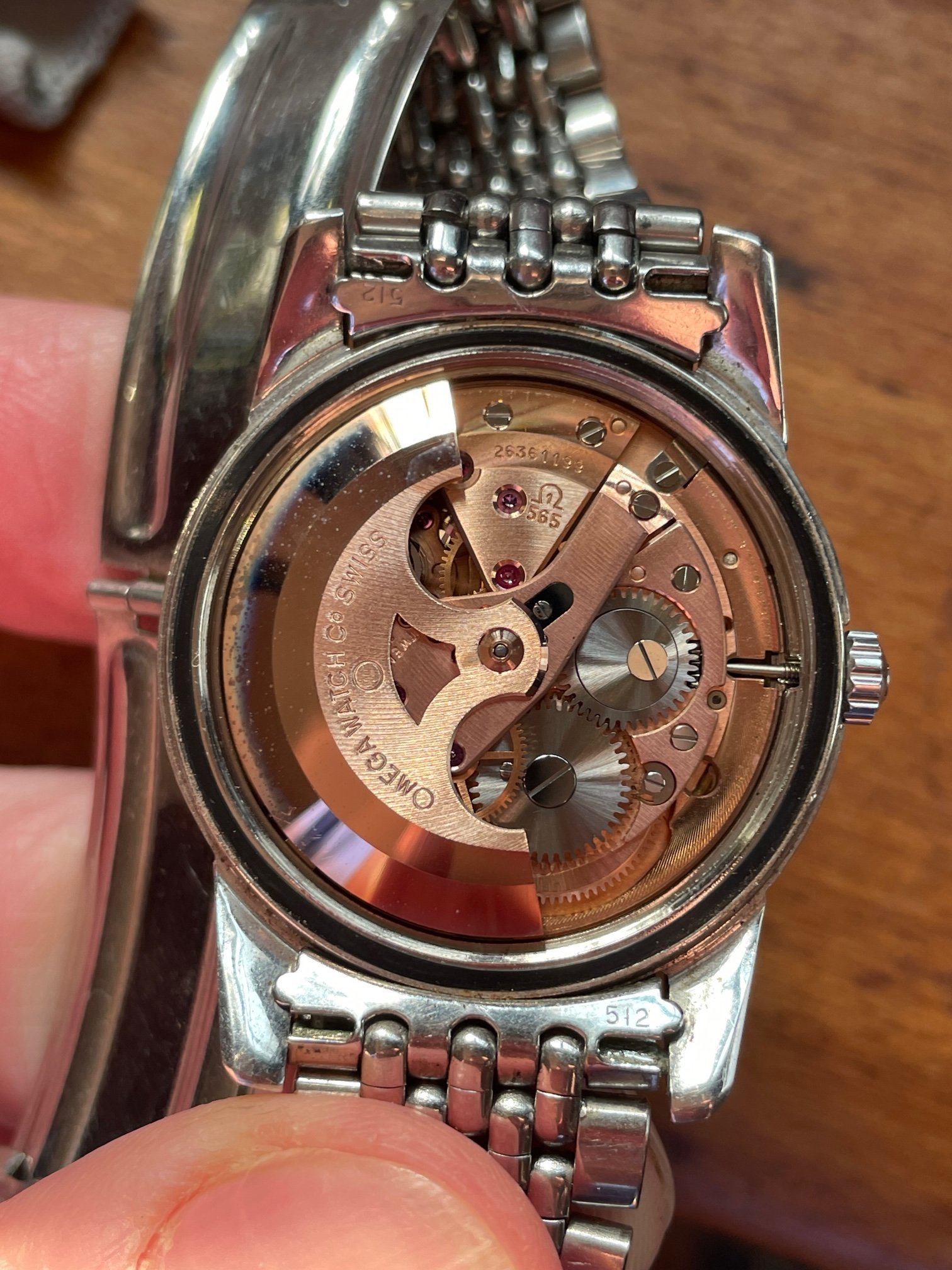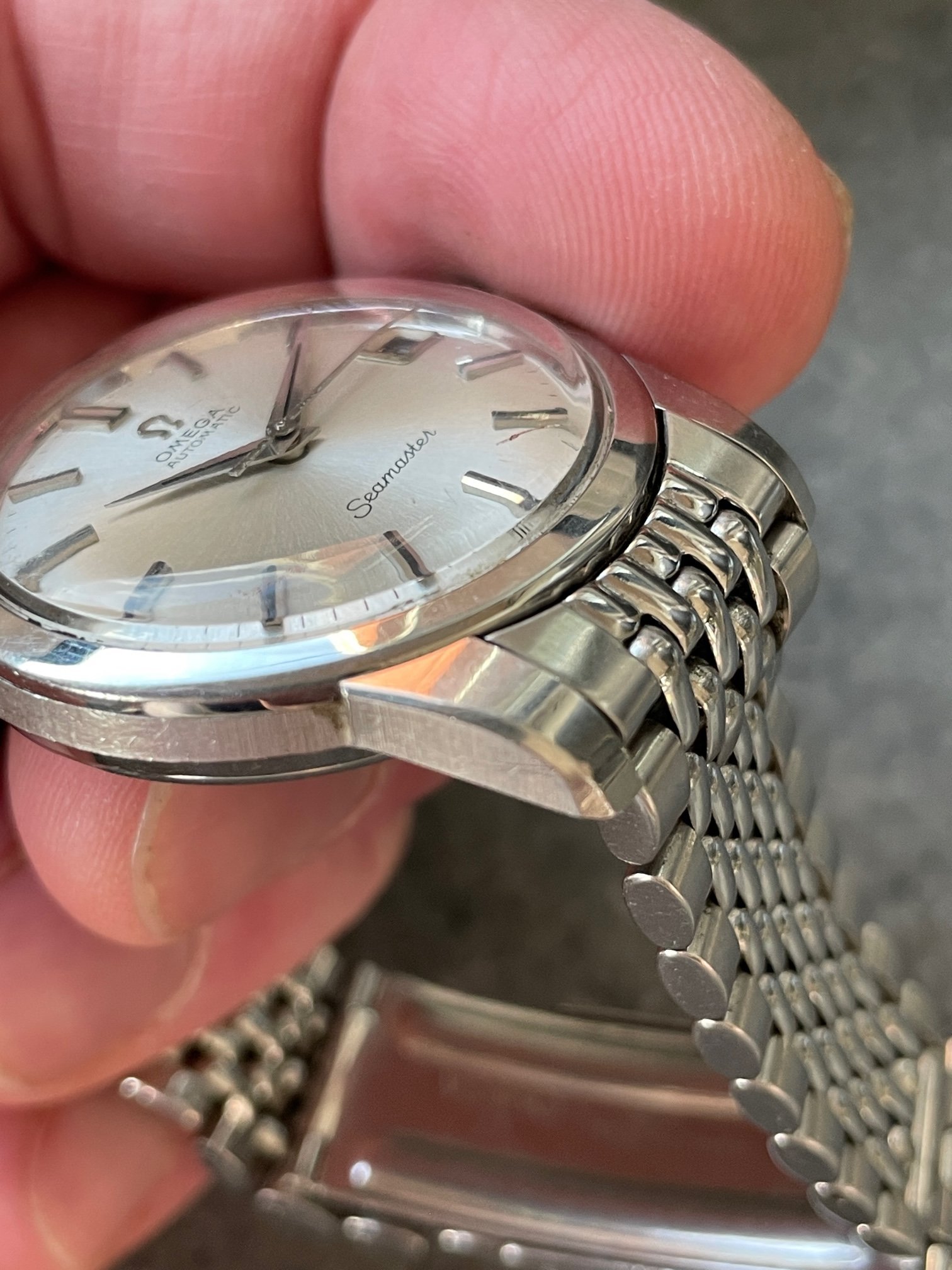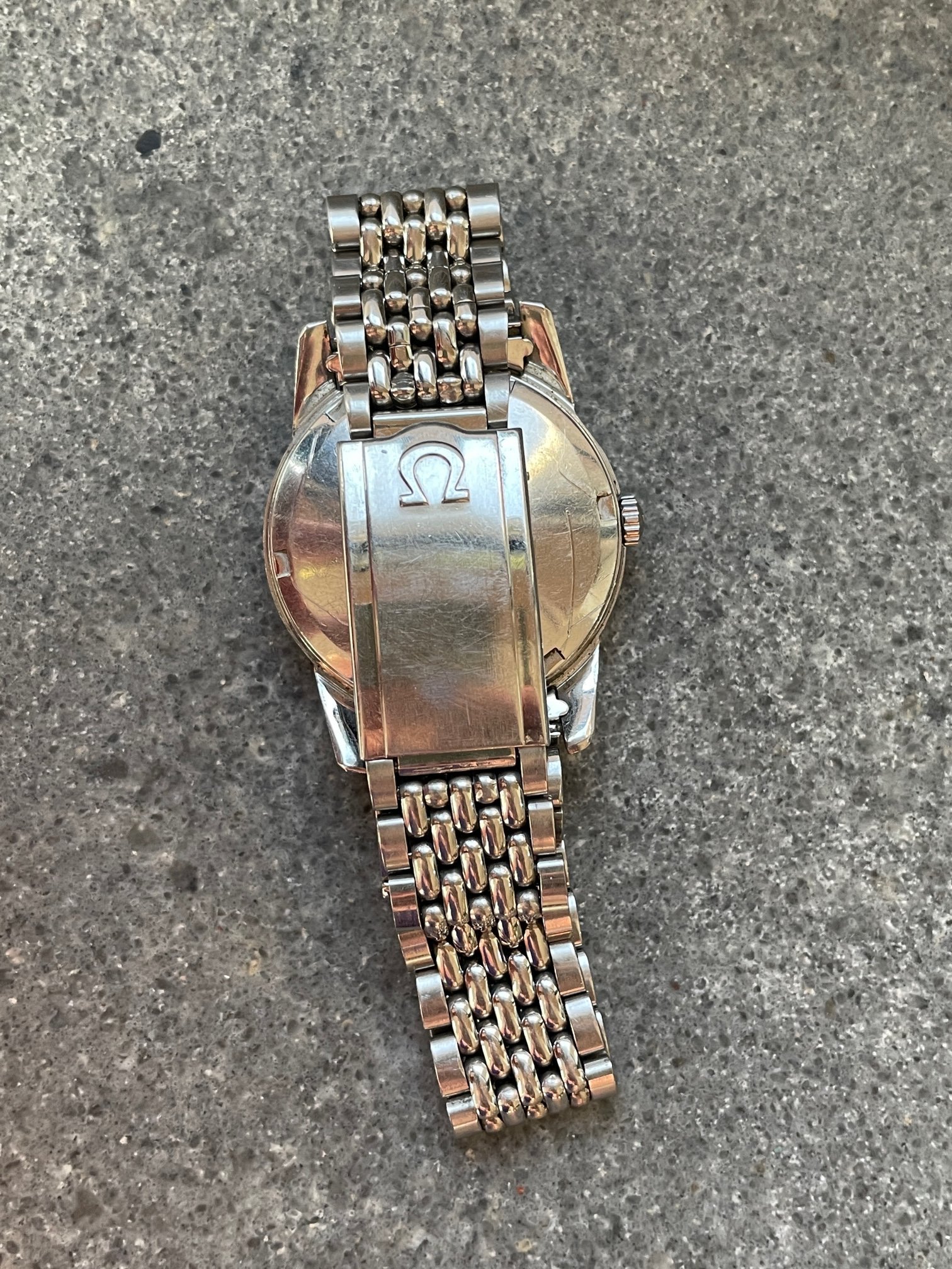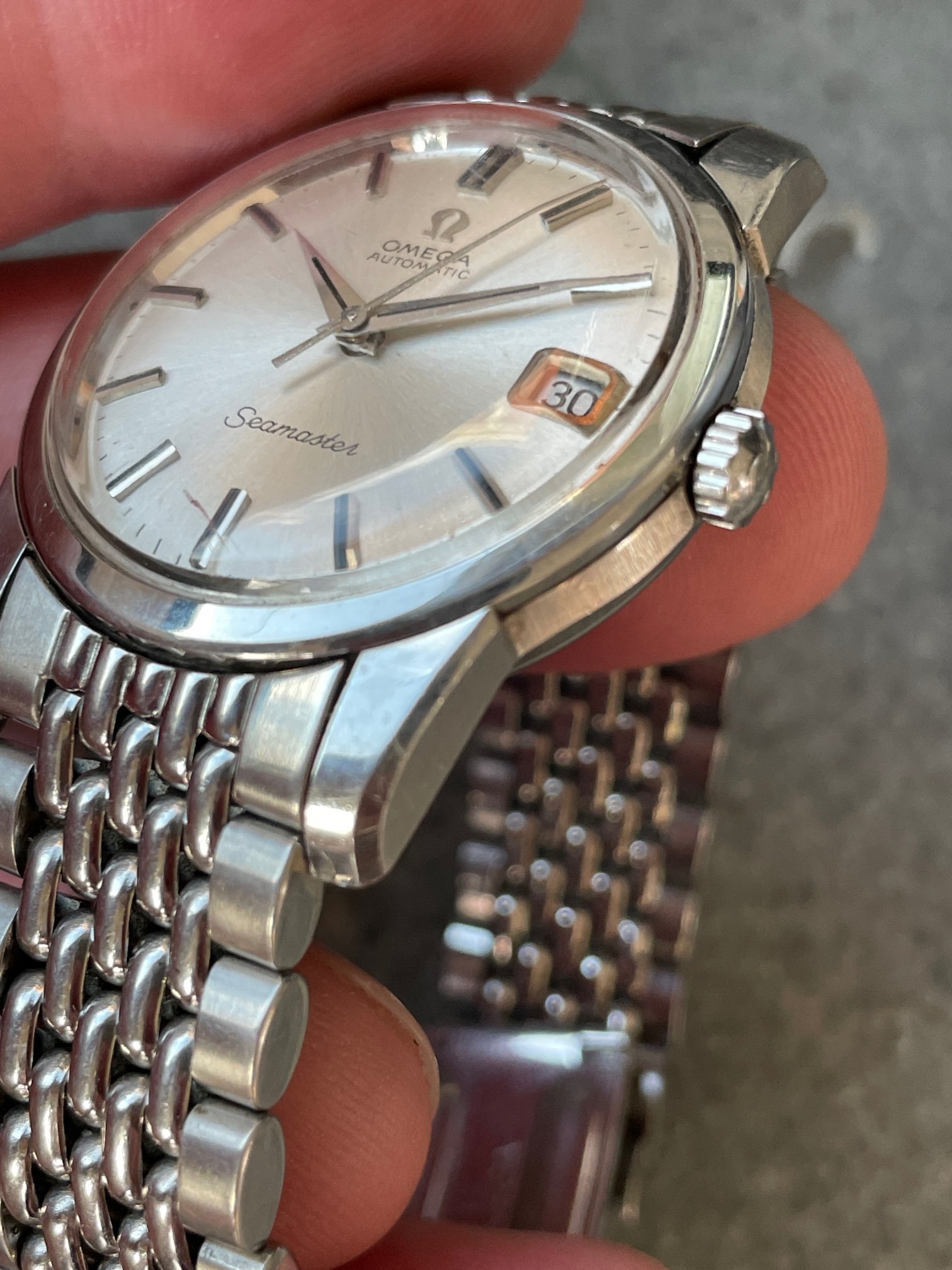 ·This seduced me because of its condition. I'm not sure how much it got worn, but my word—look at the brushing on the sides, the bevels on the lugs. Pretty remarkable overall—original scalloped crown, original 1036/512 bracelet is *just* a bit small—it's tight on my 7.25" wrst. I'm not seeing a hippocampus on the crystal, so I presume it's a generic replacement at some point.