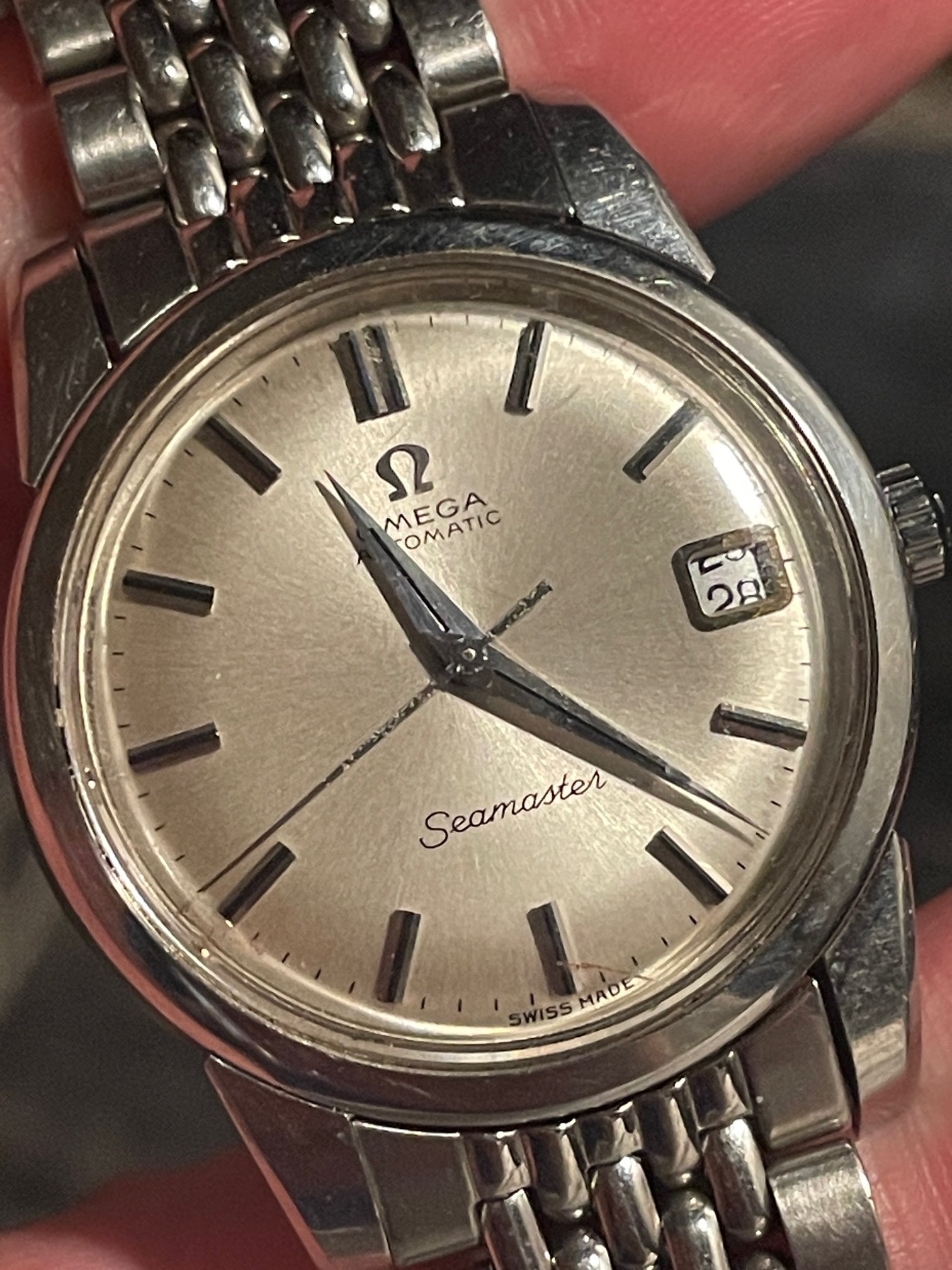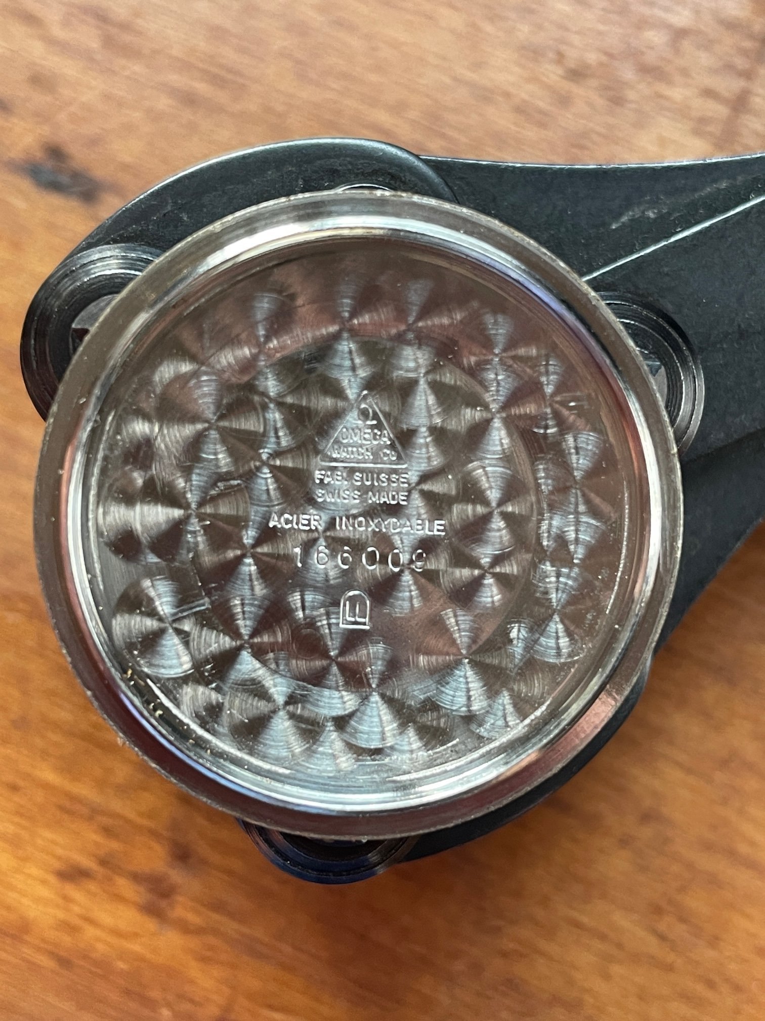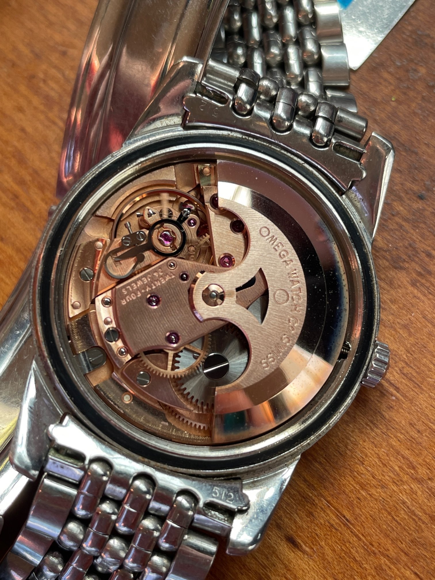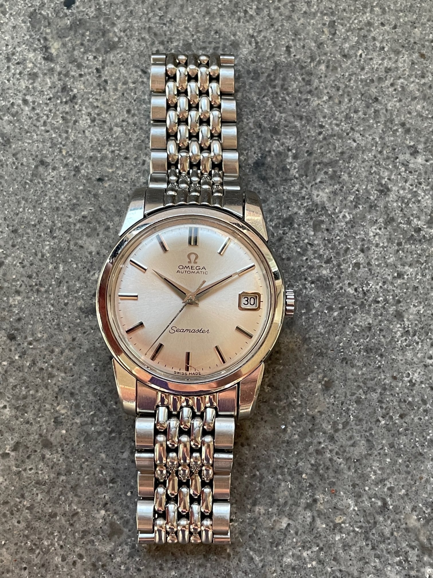 ·This seduced me because of its condition. I'm not sure how much it got worn, but my word—look at the brushing on the sides, the bevels on the lugs. Pretty remarkable overall—original scalloped crown, original 1036/512 bracelet is *just* a bit small—it's tight on my 7.25" wrst. I'm not seeing a hippocampus on the crystal, so I presume it's a generic replacement at some point.