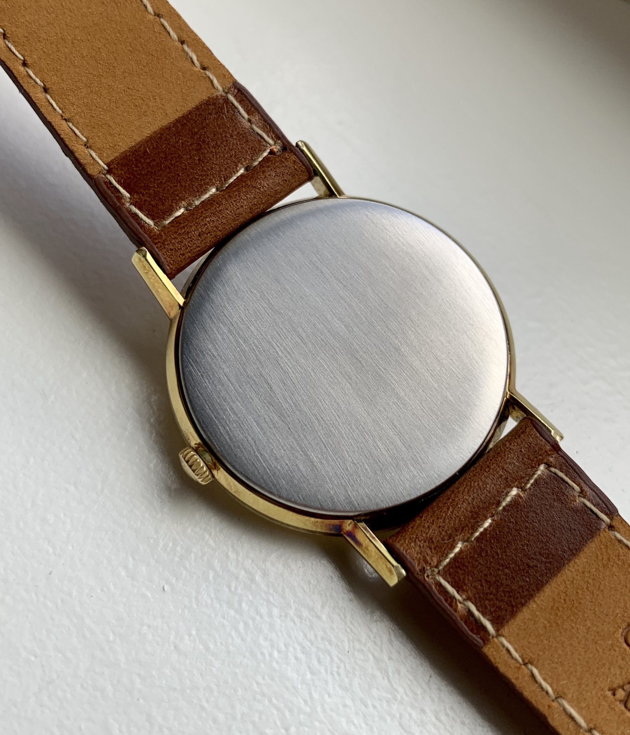 Gold plated bezel and stainless steel back (a faint personalization was removed from the case back during servicing). Nicely sized at approximately 34mm, not including the crown.
