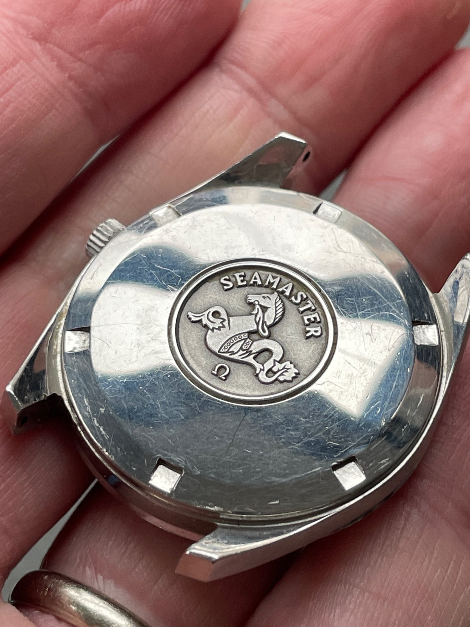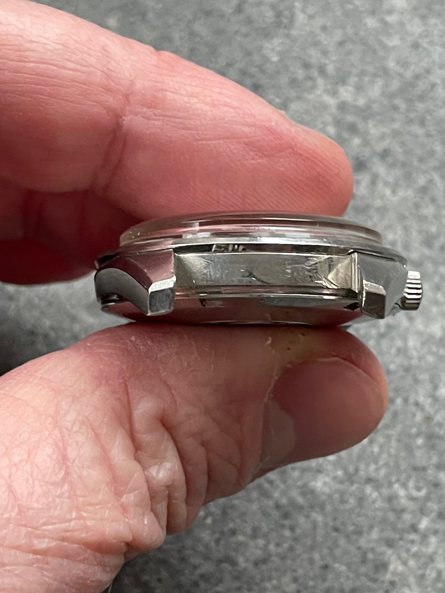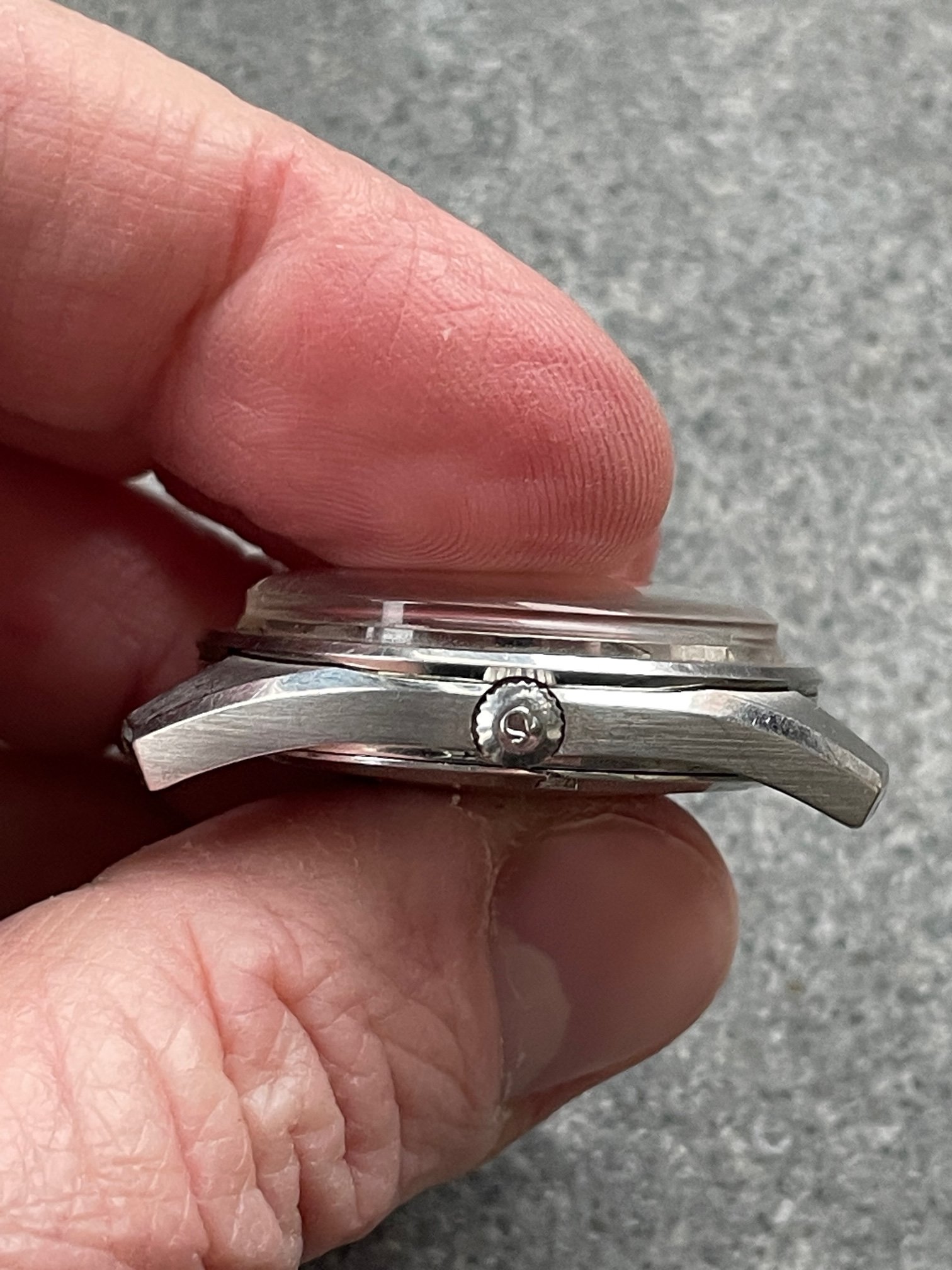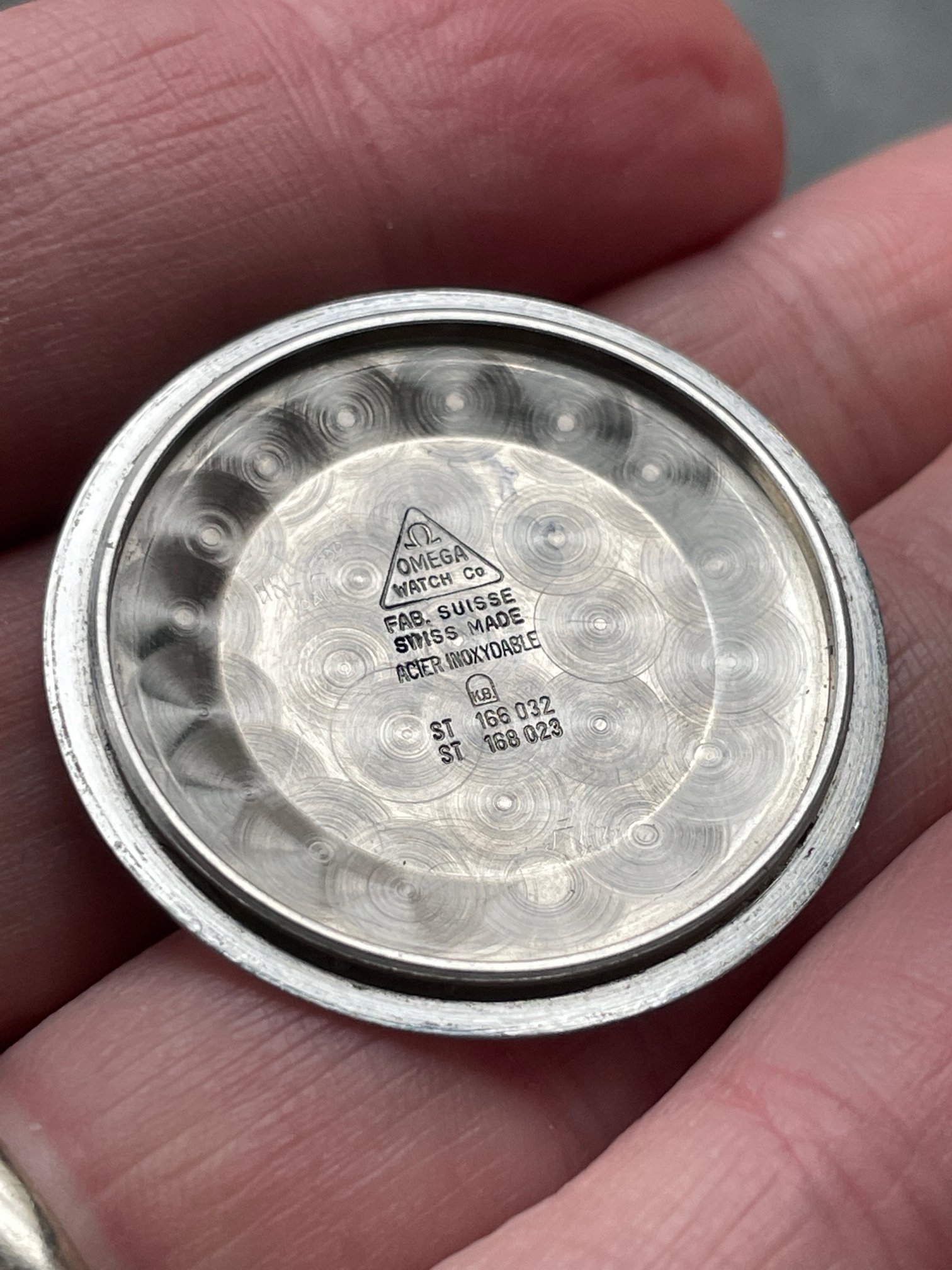 CASE: 37mm jumbo case is in very good original unpolished shape. The original crown functions well, the bevels are sharp, the caseback is clear, but I can't make out an Omega symbol on the acrylic crystal. There's no bracelet.