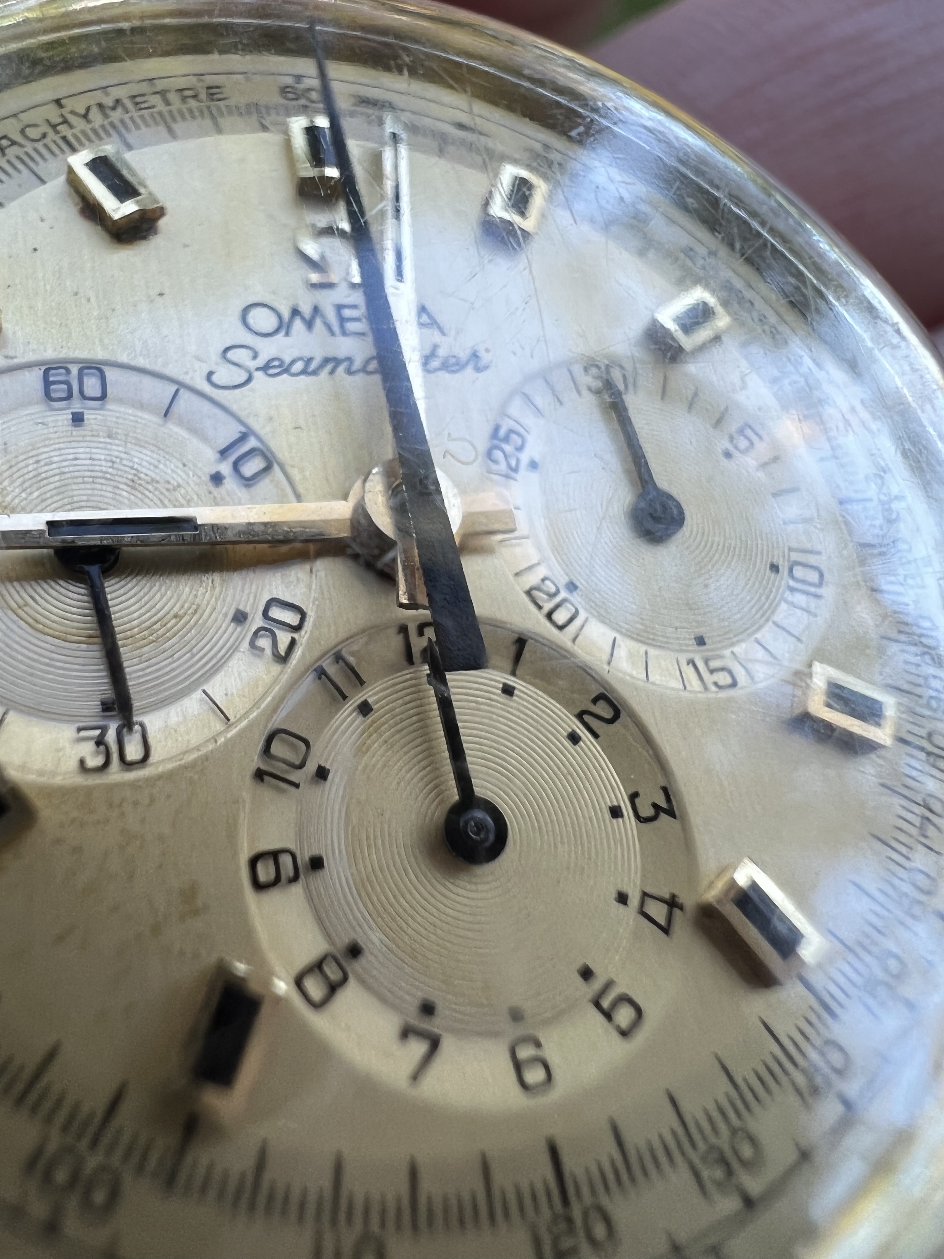 I had it serviced by Joyce's Jewelry's in house Omega watchmaker where a NOS chronograph hand, all new gaskets and a new pusher were installed during. I chose not to have the watch polished as I prefer the original finish but overall its in remarkable shape for being roughly 53 years old! It is on a nice DeLugs brand leather strap with a steel buckle.