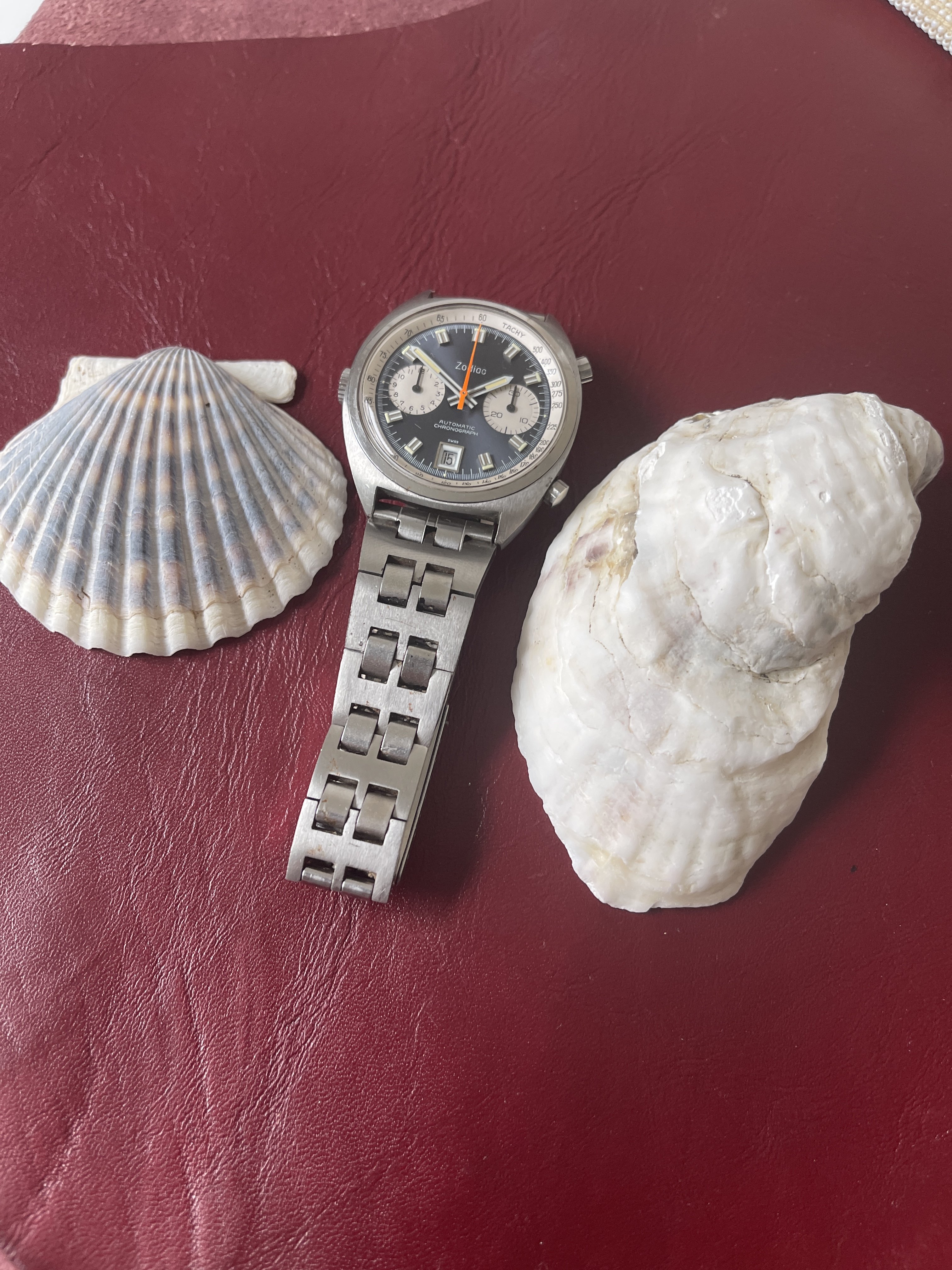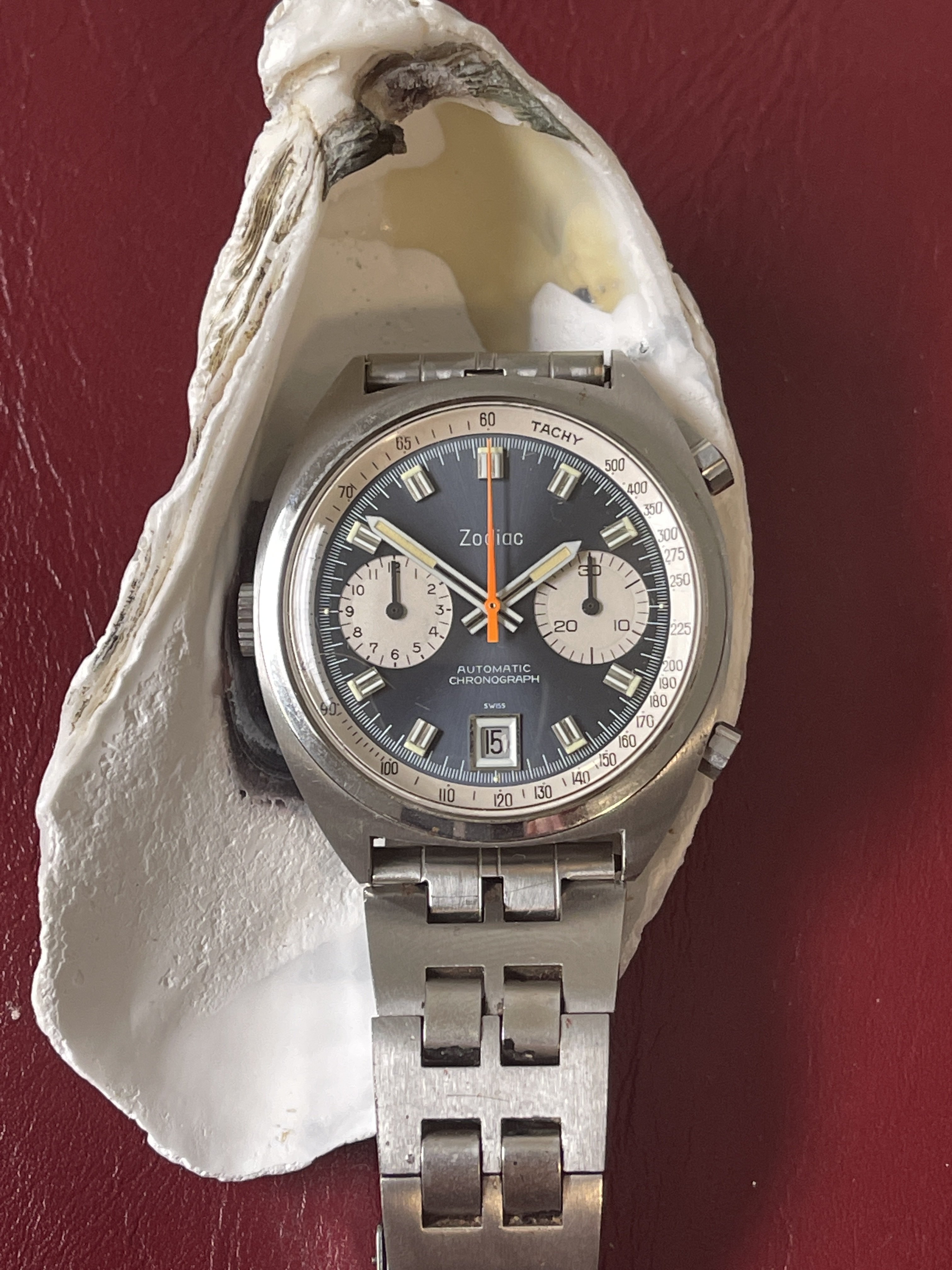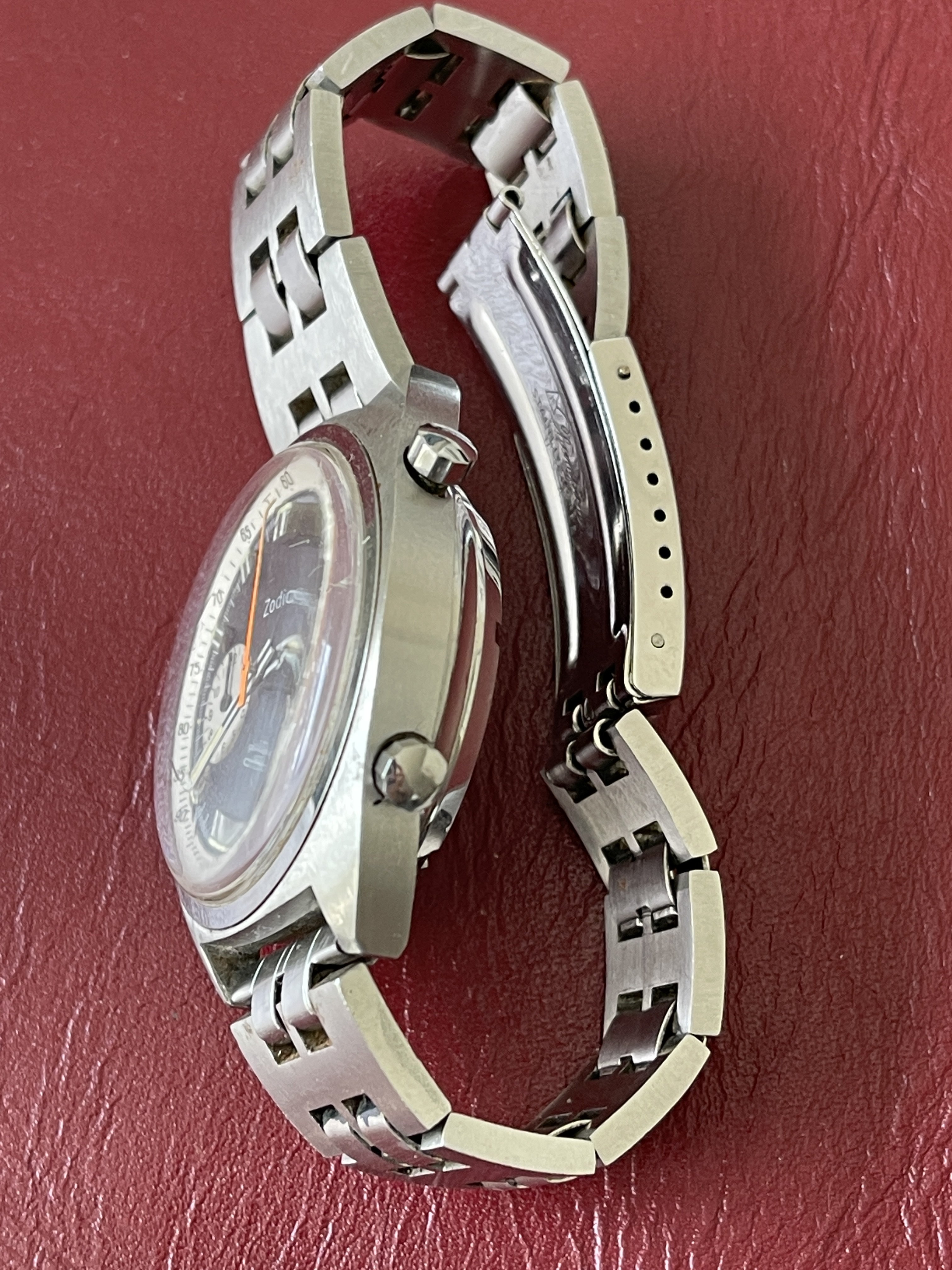Original Zodiac Steel Band missing blue paint with a few small specks of rust from the salty cape cod air