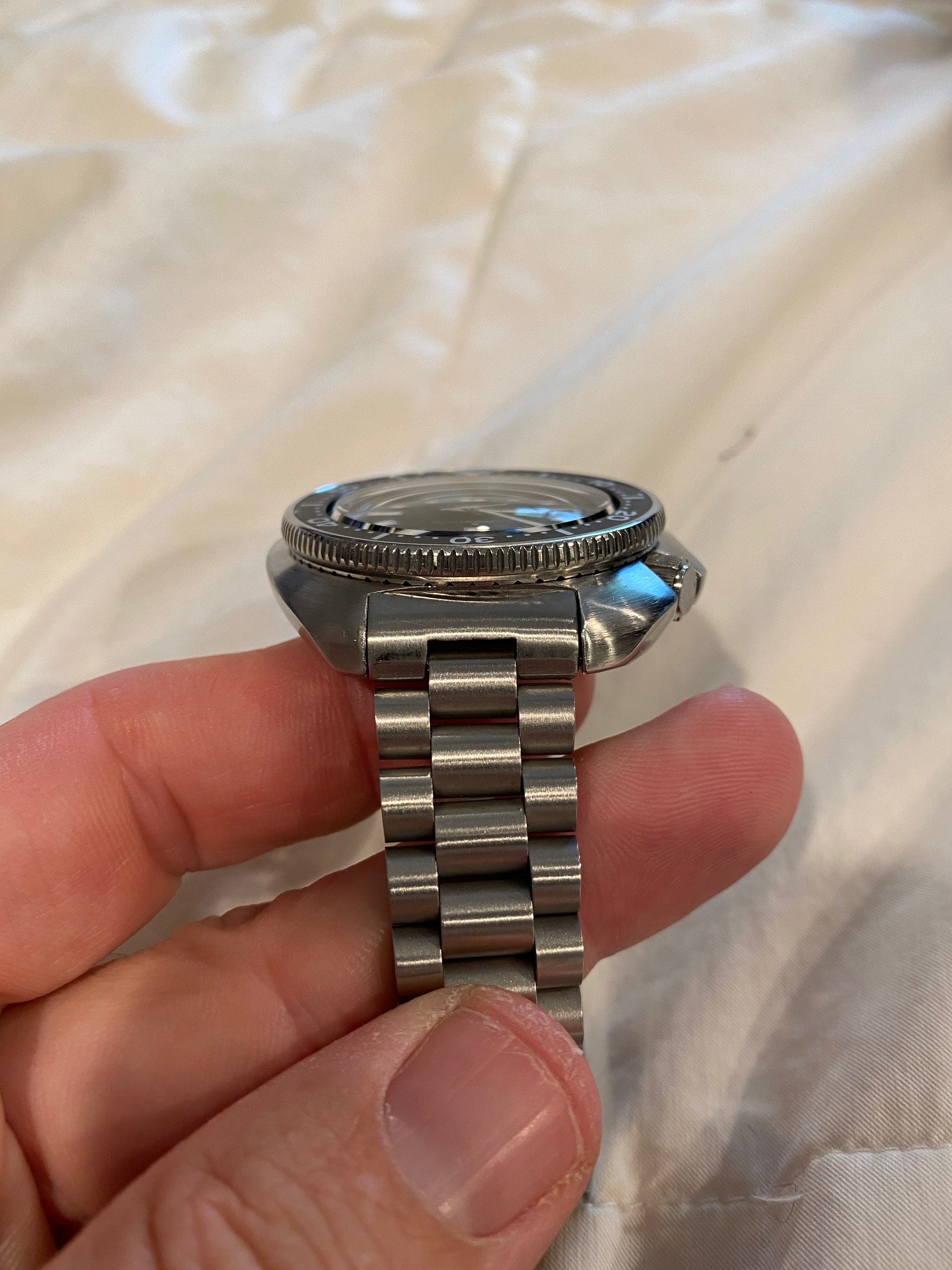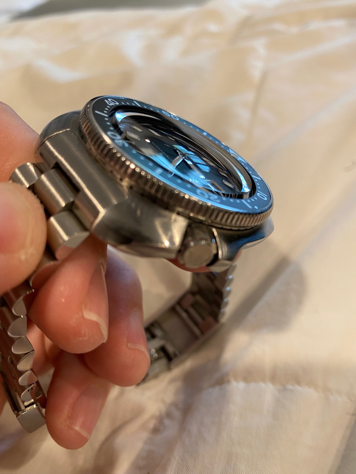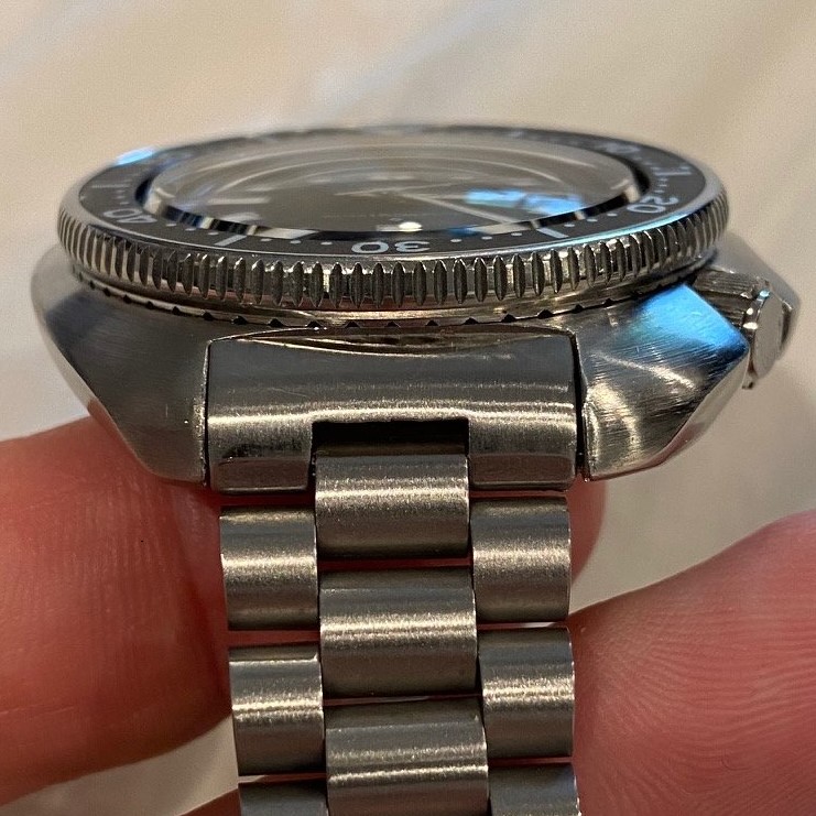 Beautifully curved 44mm case, no pits or deep scratches. No signs of any polishing. Both top and bottom of the case are brushed, the top secular brushed and back straight, all clearly very visible.
