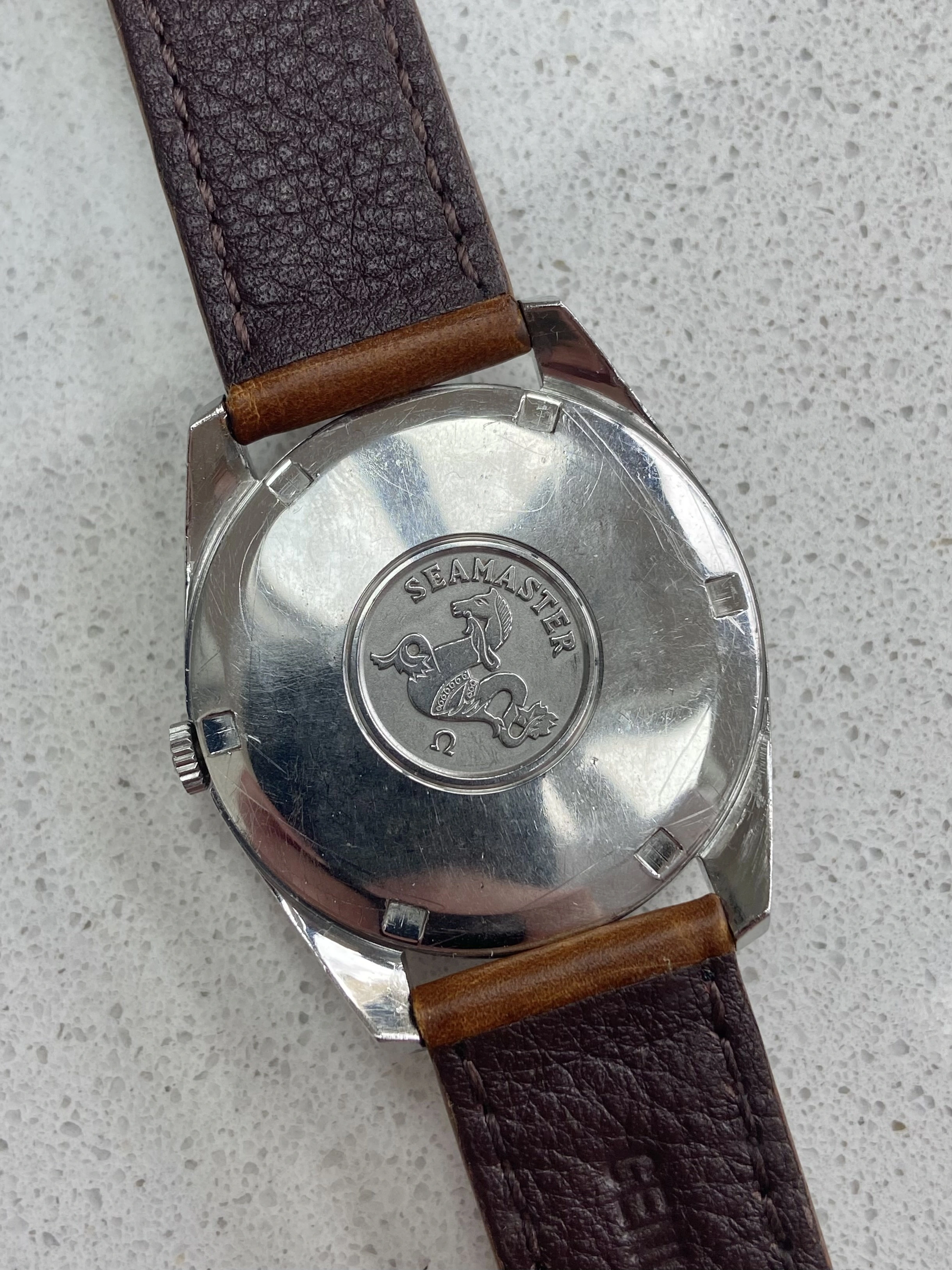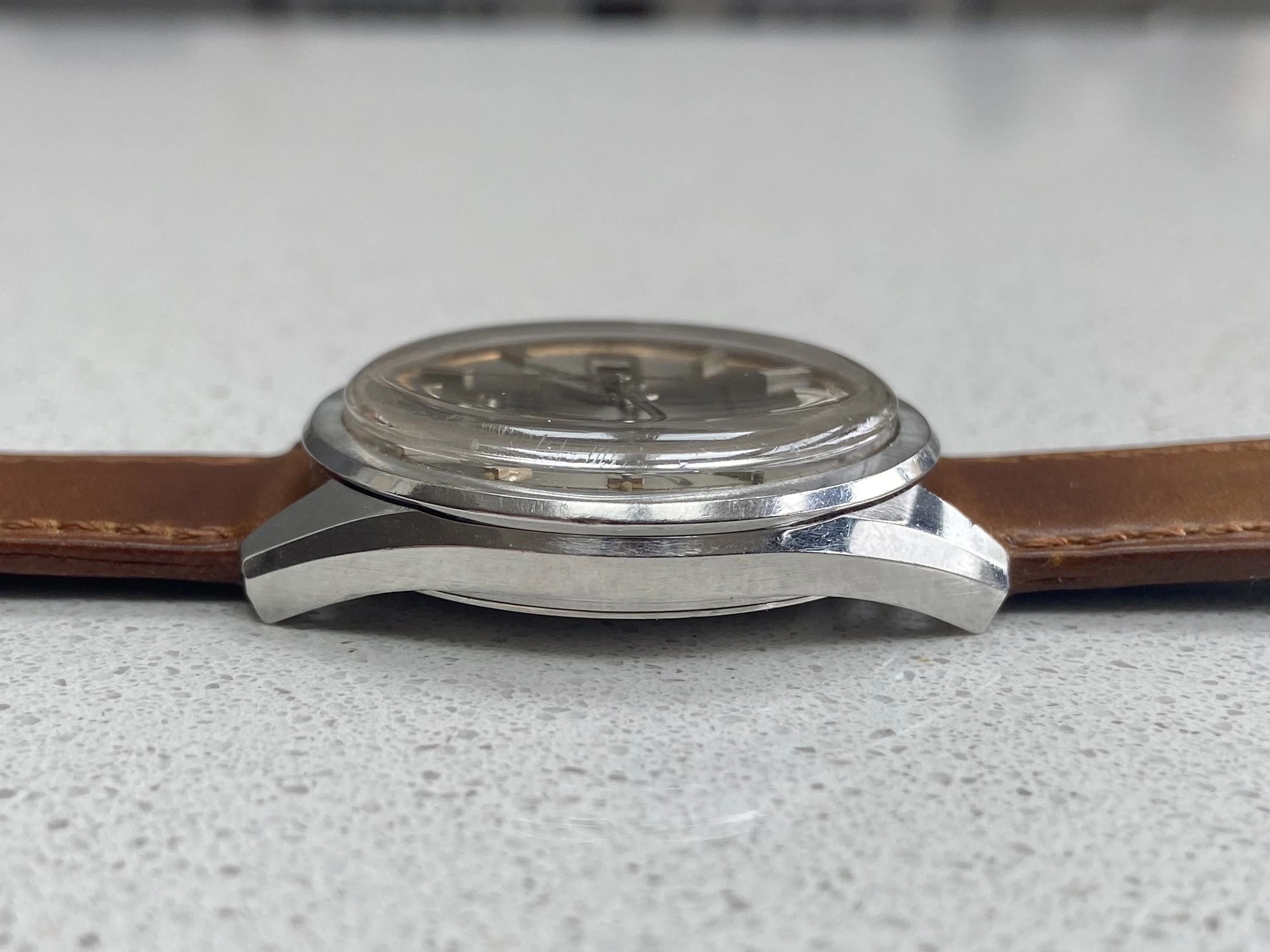 Original 36mm stainless steel case in good condition. Being one of the only 60’ Seamasters that came in 36mm, these wear really well and are notably larger than the usual 34mm Seamasters. Has been lightly polished in the past but the edges and facets are still present, along with the radial brushing to the bezel.