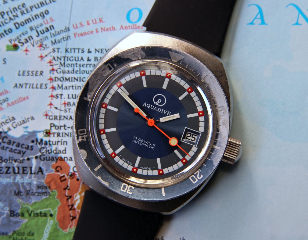 ·Up for sale is this cool and funky vintage 1970s Aquadive 20 ATM diver with gorgeous "Deep Blue"-style pie pan dial in heavy, water resistant screwed stainless steel case. This full size retro diver features a screw down crown and the redoubtable ETA 2873 full rotor automatic movement, which has just been fully overhauled by my NYC Master Watchmaker. It is in overall Very Good unpolished vintage condition with a gorgeous Mint dial with Tritium luminous dots and a cool Trit handset featuring a big lollipop orange sweep seconds. This watch represents great retro style as well as bang for the buck and is guaranteed for 6-months for all normal, non-abusive use.