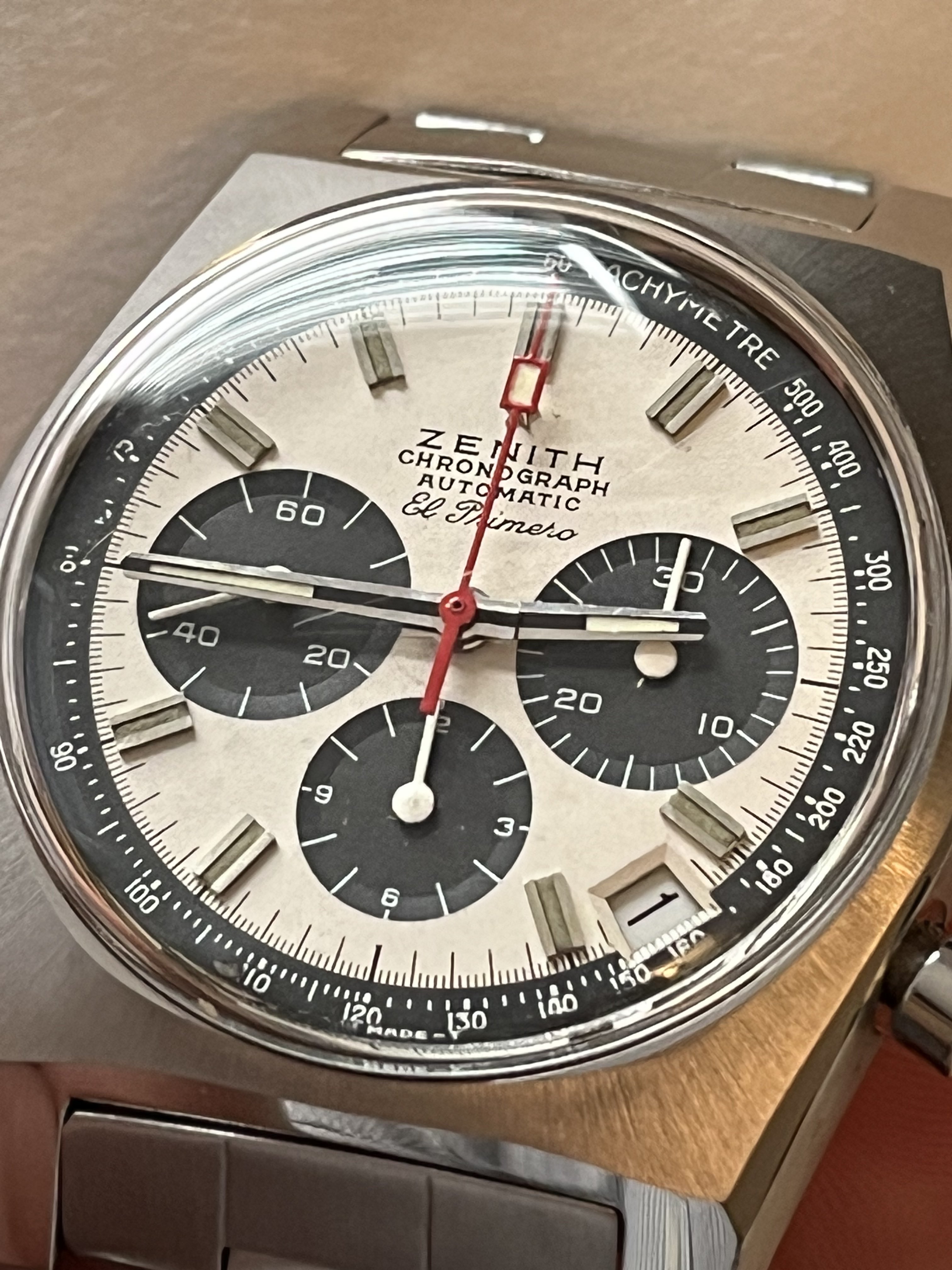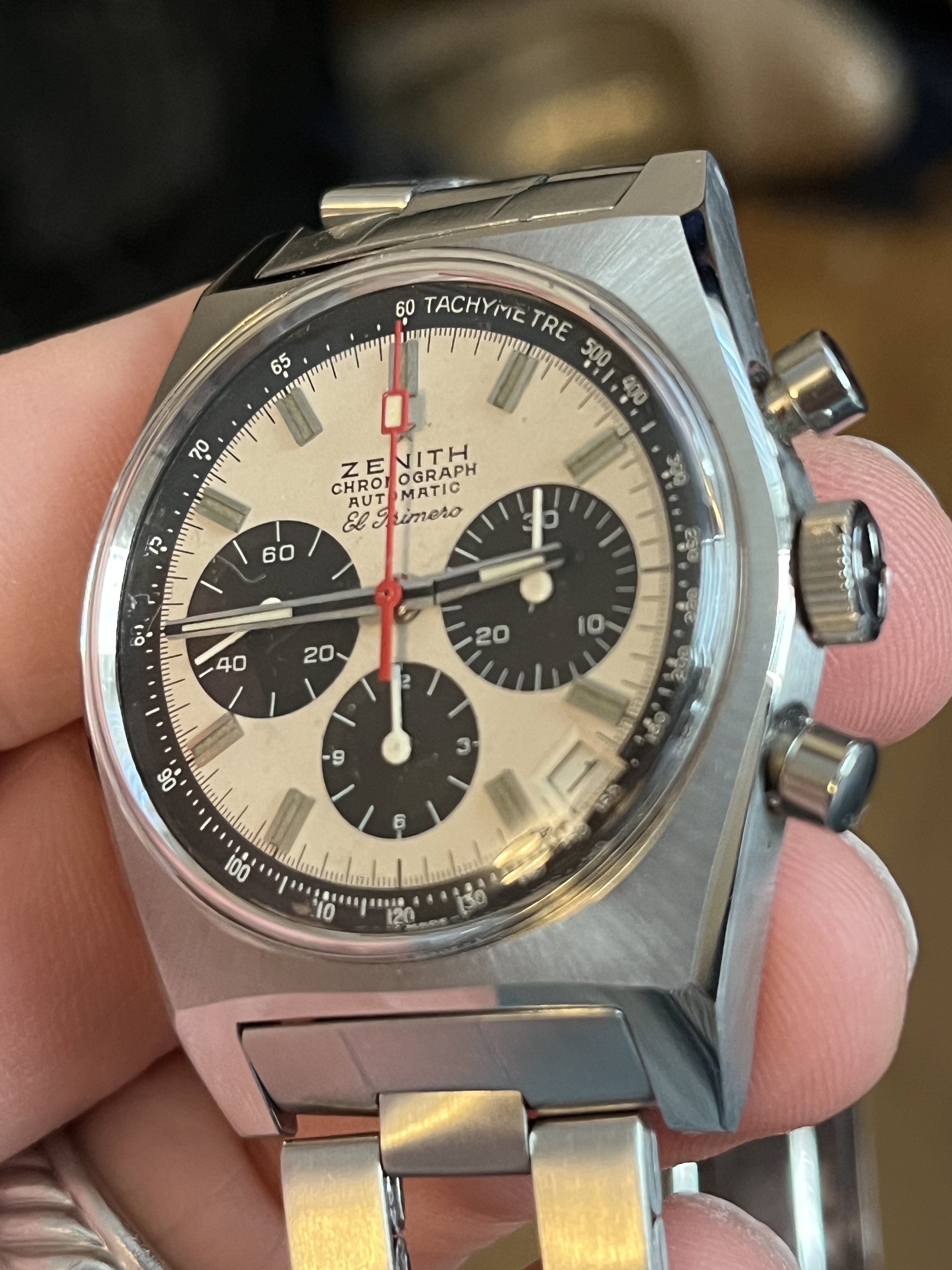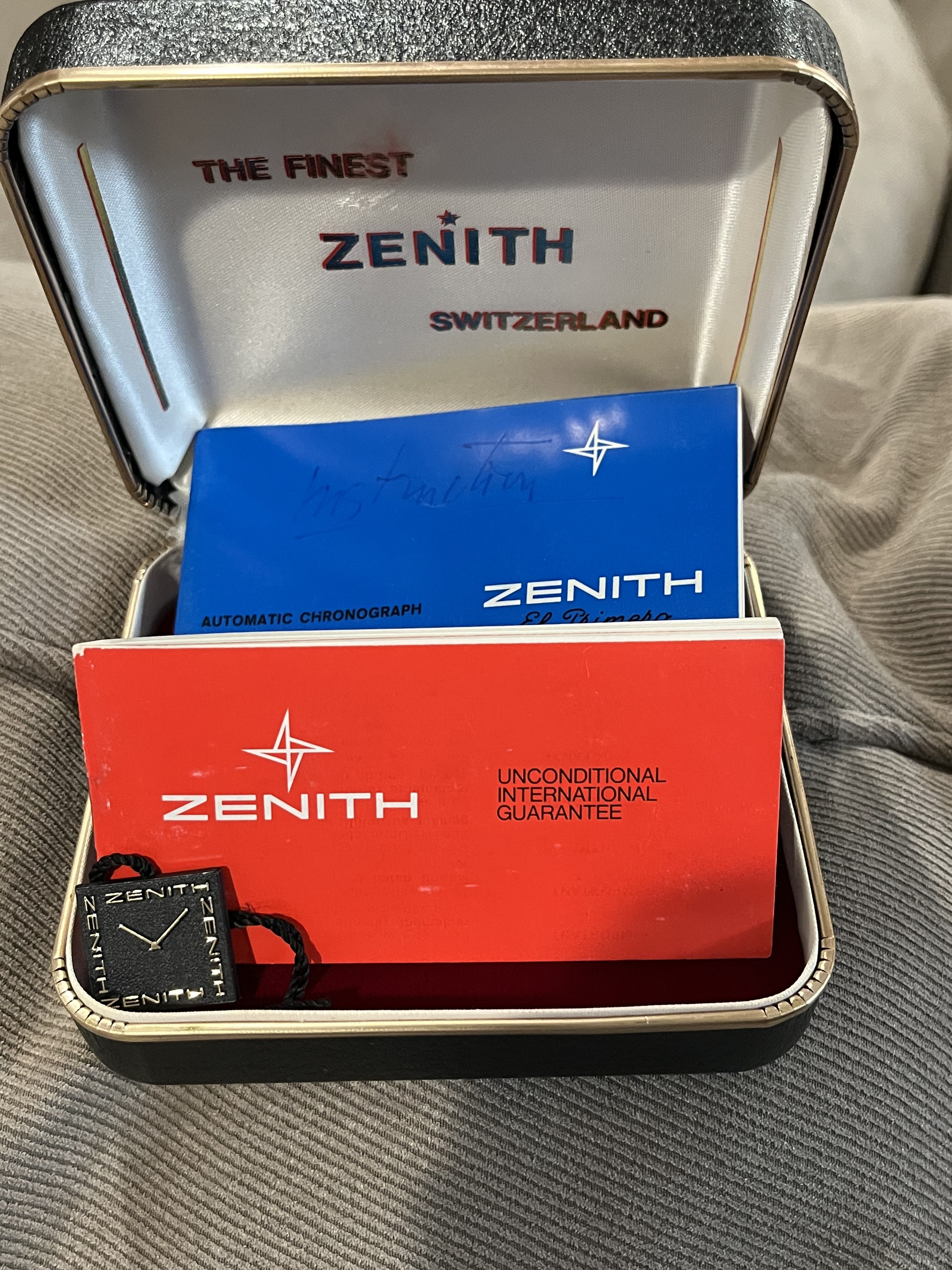 Putting the 1970 a384 up for sale as I eye a grail that’s on the market. Included in the sale is a Zenith box and hang tag (unsure if original to the watch) and unsigned warranty booklet and instruction booklet. I had a full service done on the watch about 4 years ago but I can’t find the receipt. Worn very sparingly maybe 10 days in the past four years. It’s on a ten link gay freres ladder bracelet with zkm end links. Includes Zenith extract (sent to me as a .pdf). I had the top of the case refreshed by LA Watchworks and it looks good but you can see that the lines aren’t perfect. The dial is a beautiful egg shell and the hands are correct but were purchased separately and installed (it originally had a386 hands when I bought it).