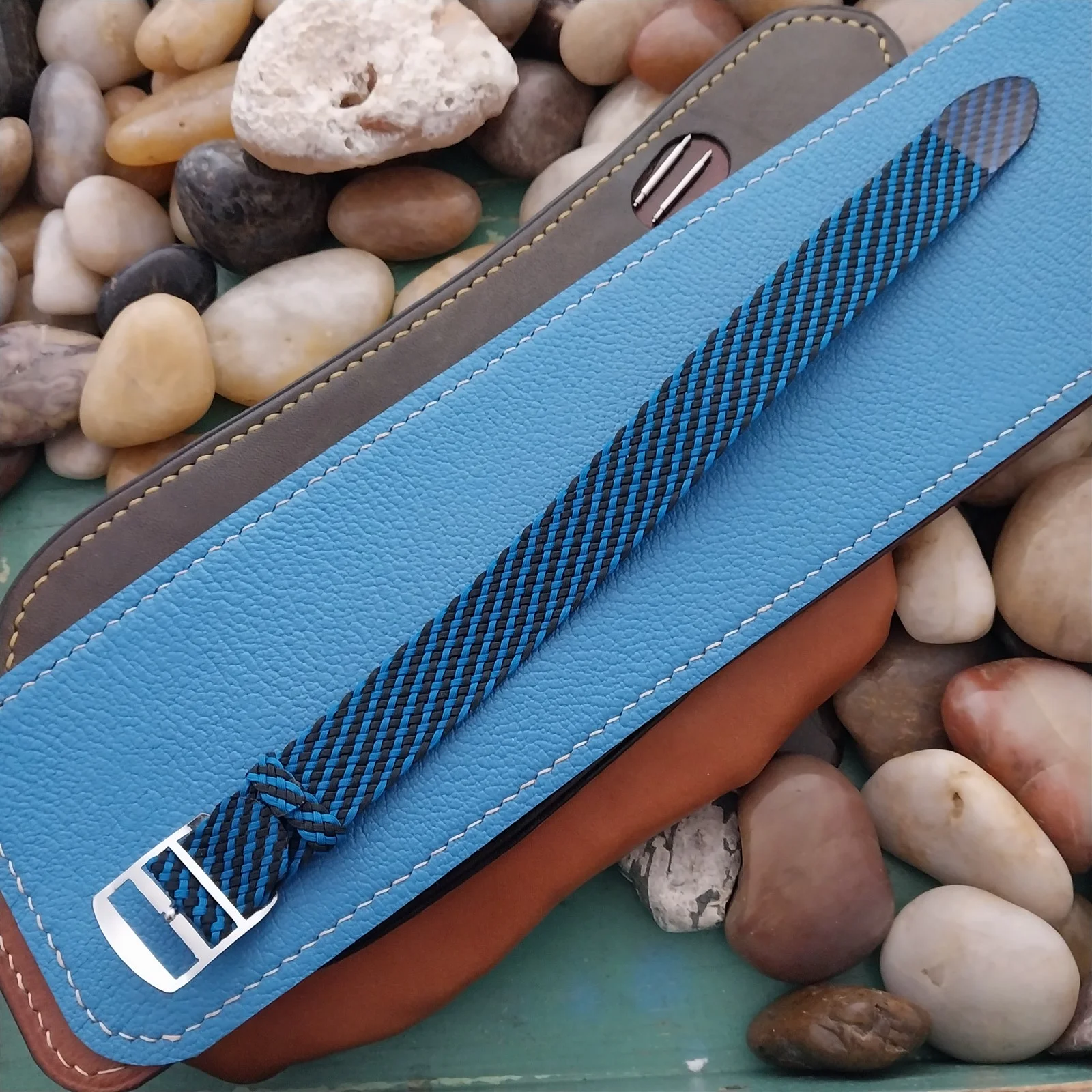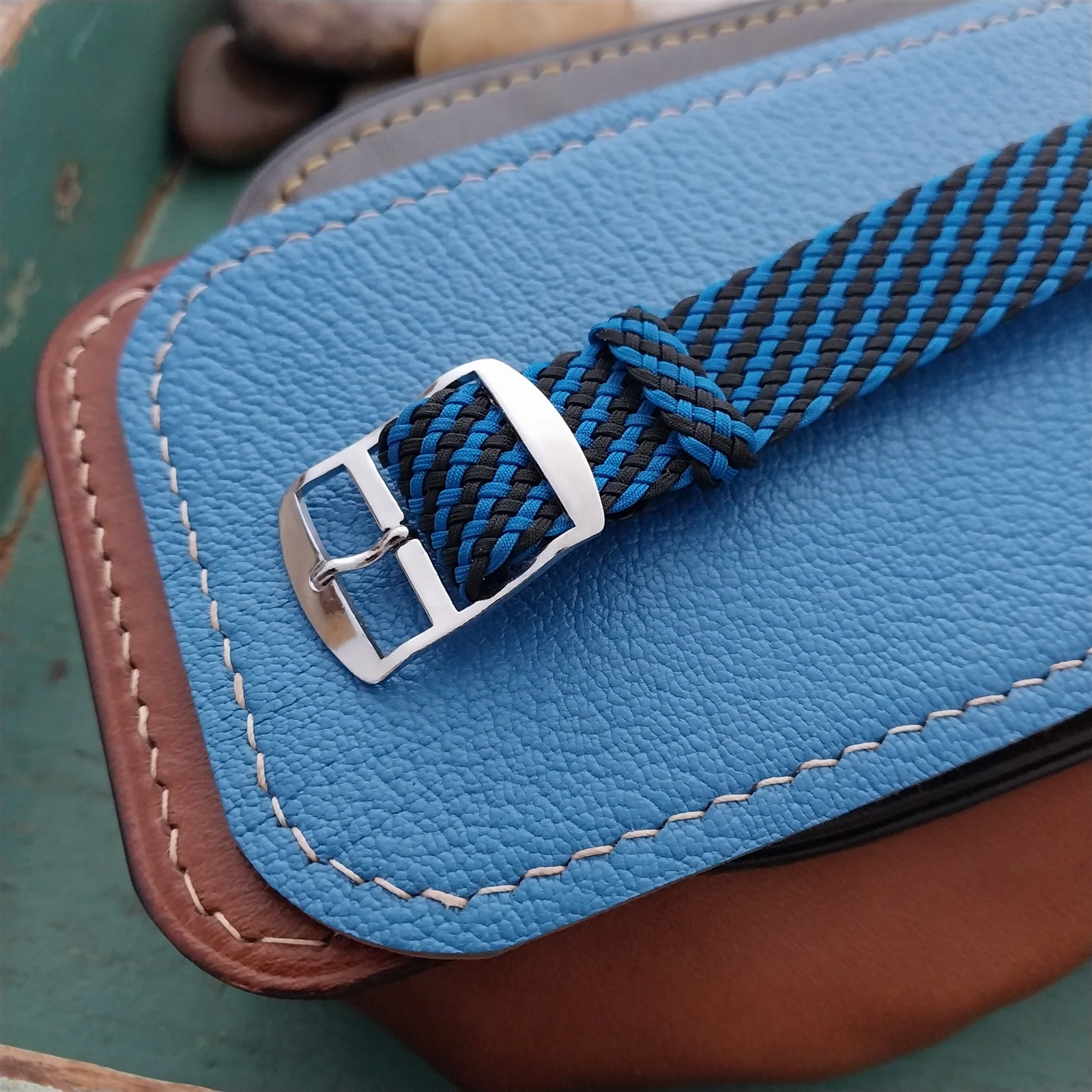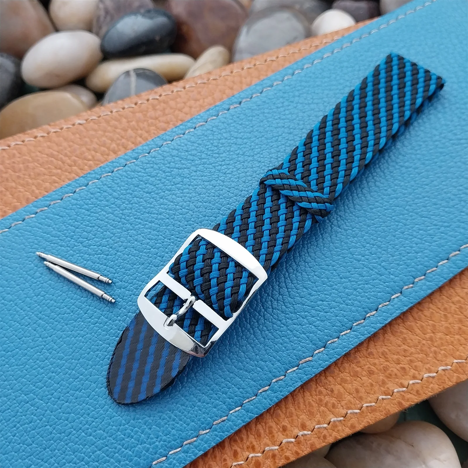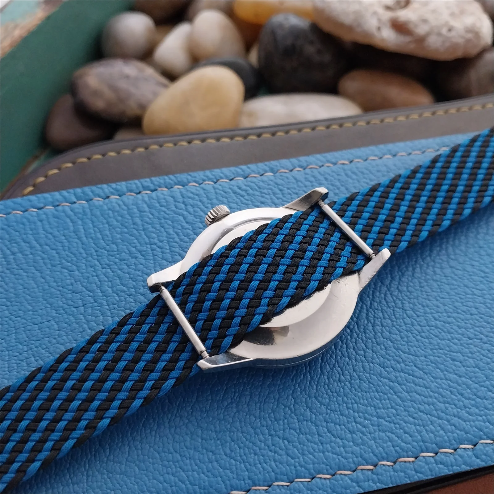 ·NOS unused old-stock West German braided black and blue Perlon field watch strap.