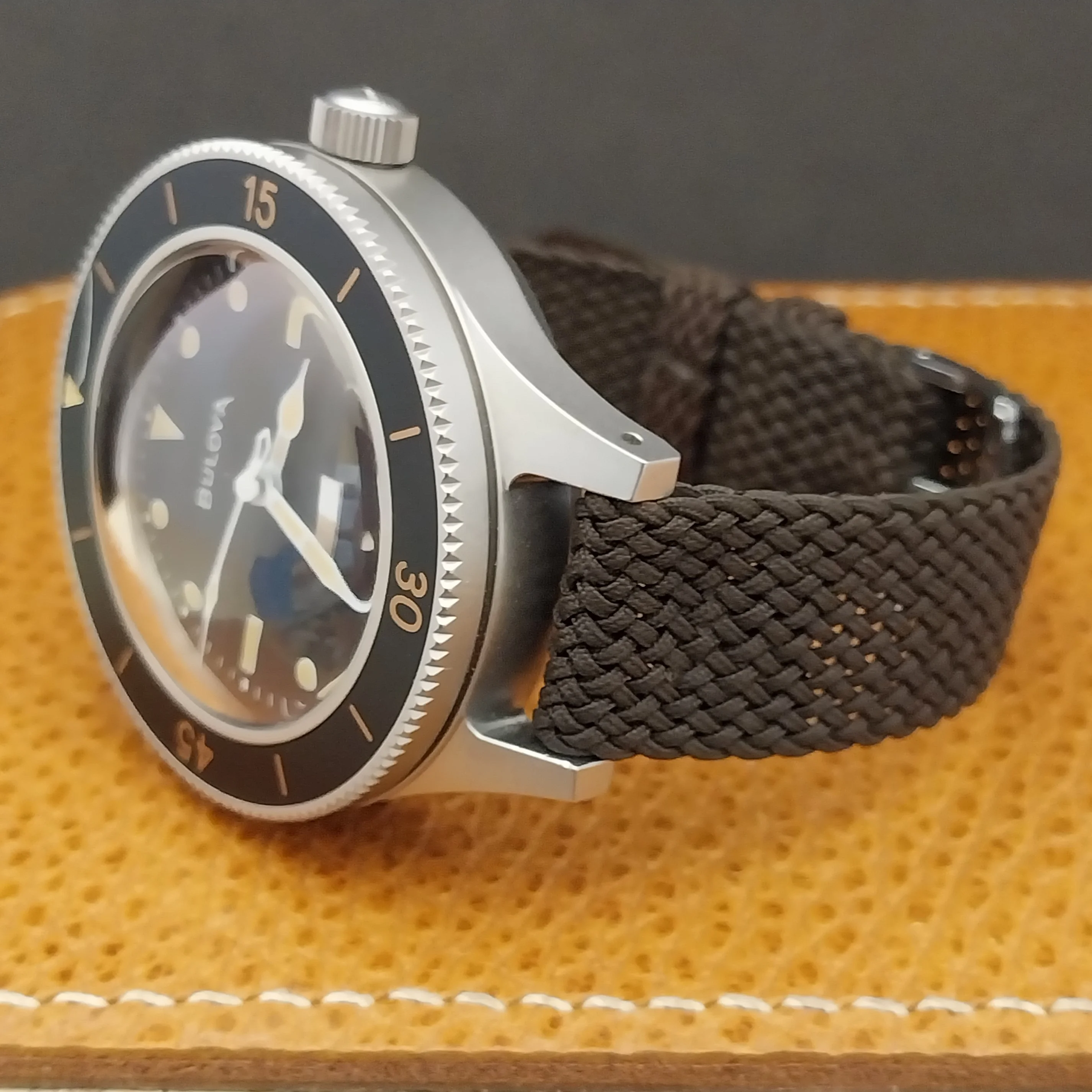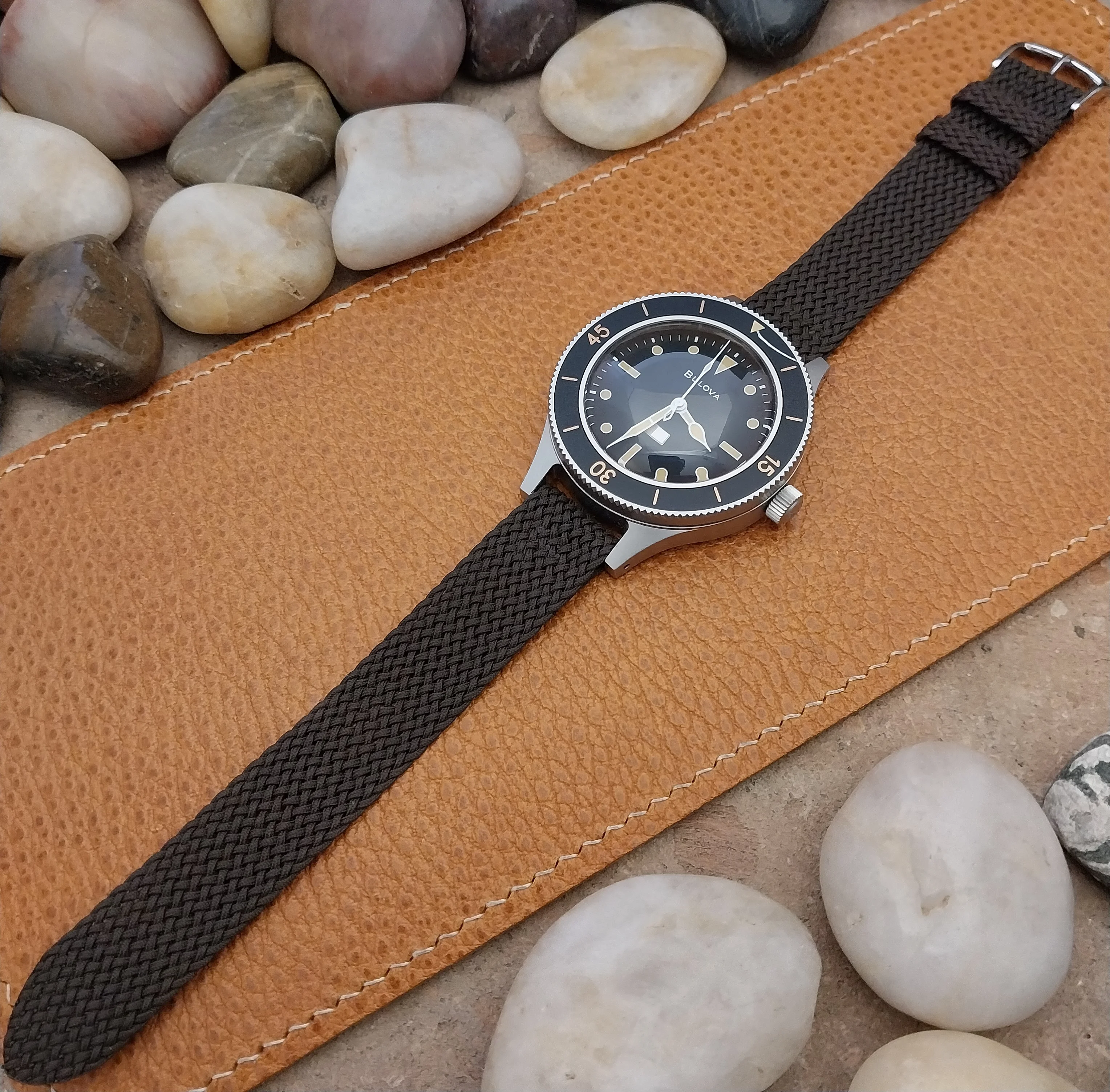 ·NOS unused 1960s old-stock Graf Swiss brown braided Perlon 2-piece watch strap.