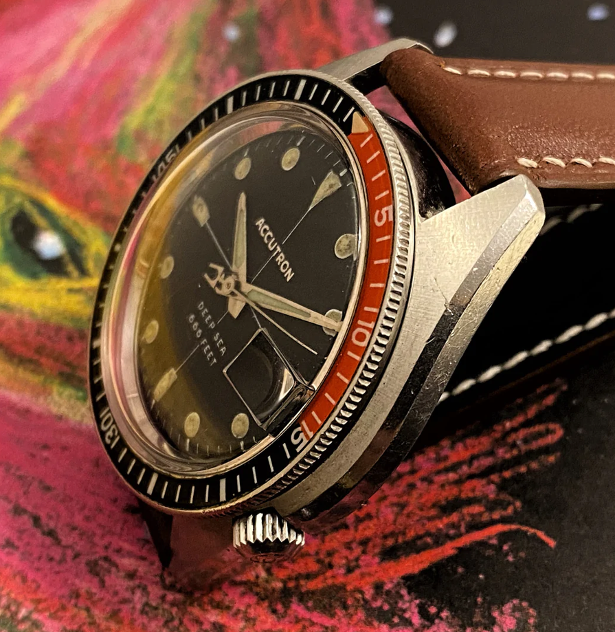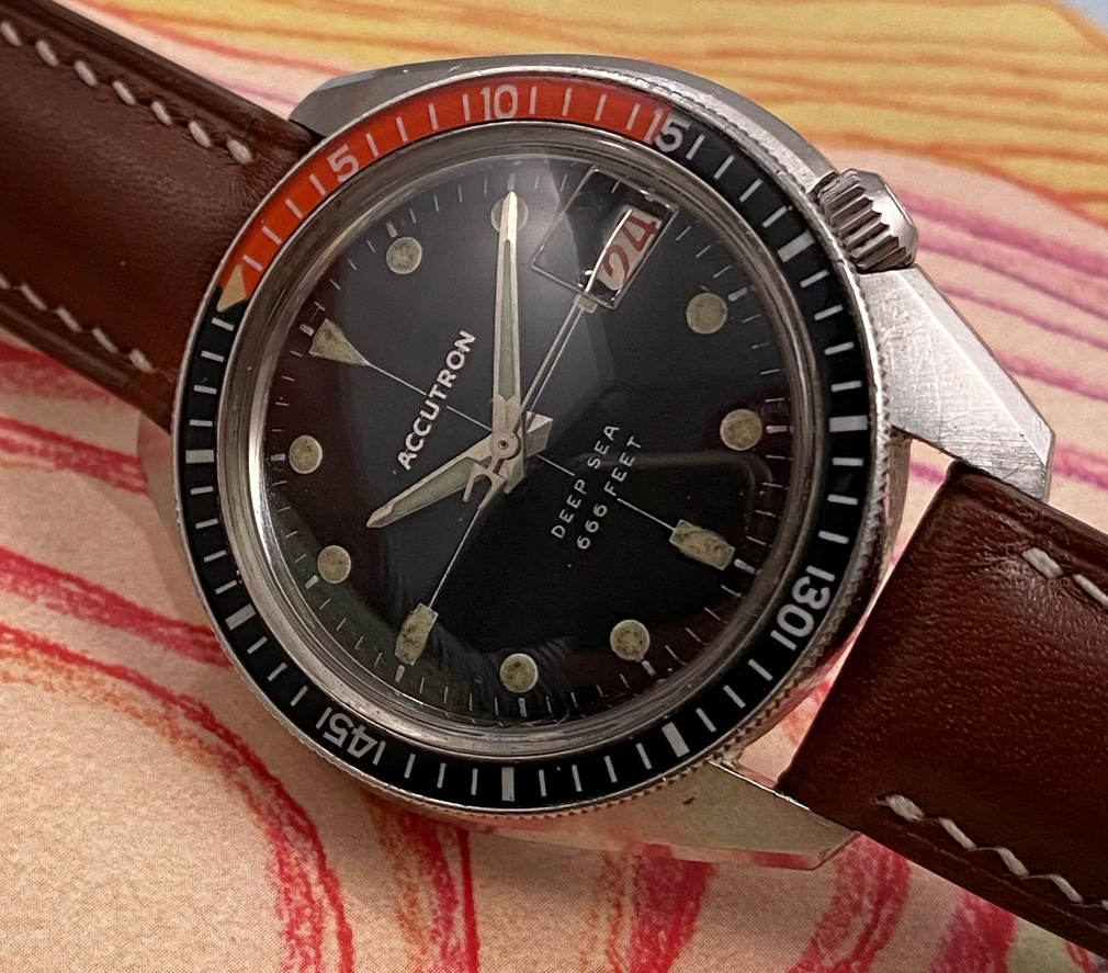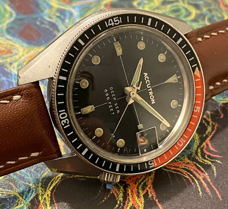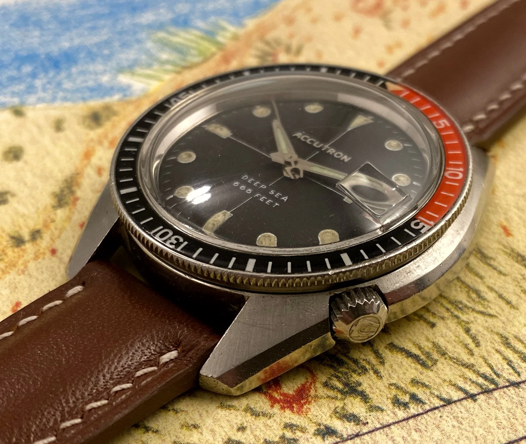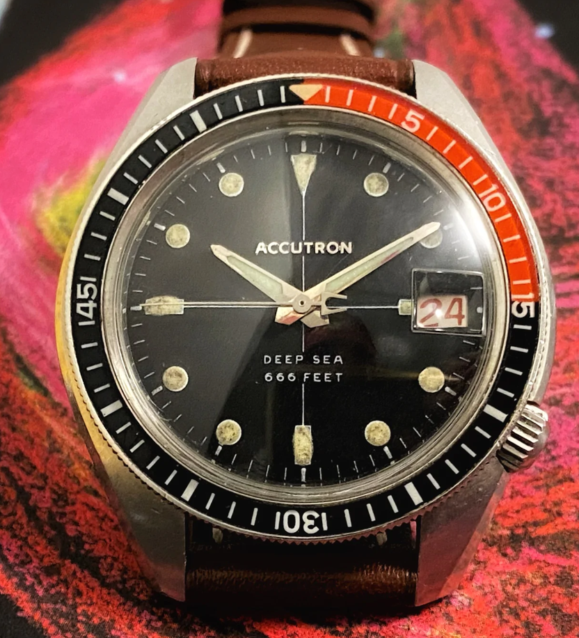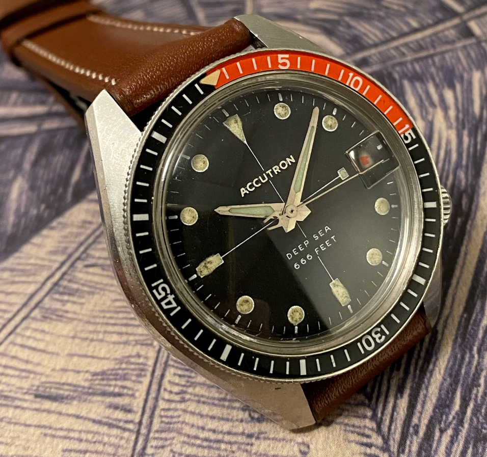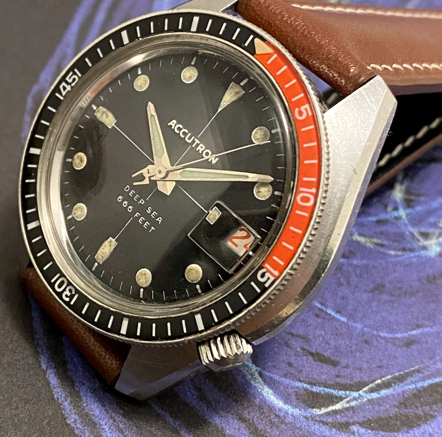 ·This Bulova Accutron Deep Sea 'Devil Diver' (regarding the 666 feet depth rating) is in my opinion one of the most attractive vintage diving watches featuring an oversized case, interesting movement, excellent finish and overall interesting aesthetic. These are incredibly rare watches and I have searched for months for the right piece that is fully original, fully functional and in my opinion features the most attractive dial layout (with sword hands and an accutron seconds hand)