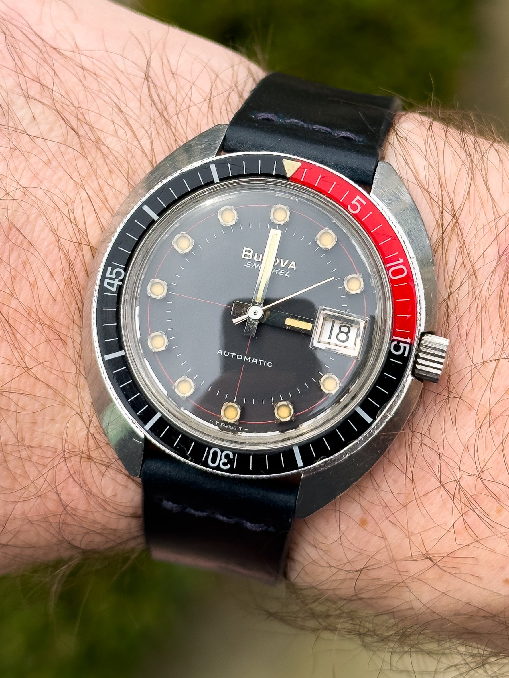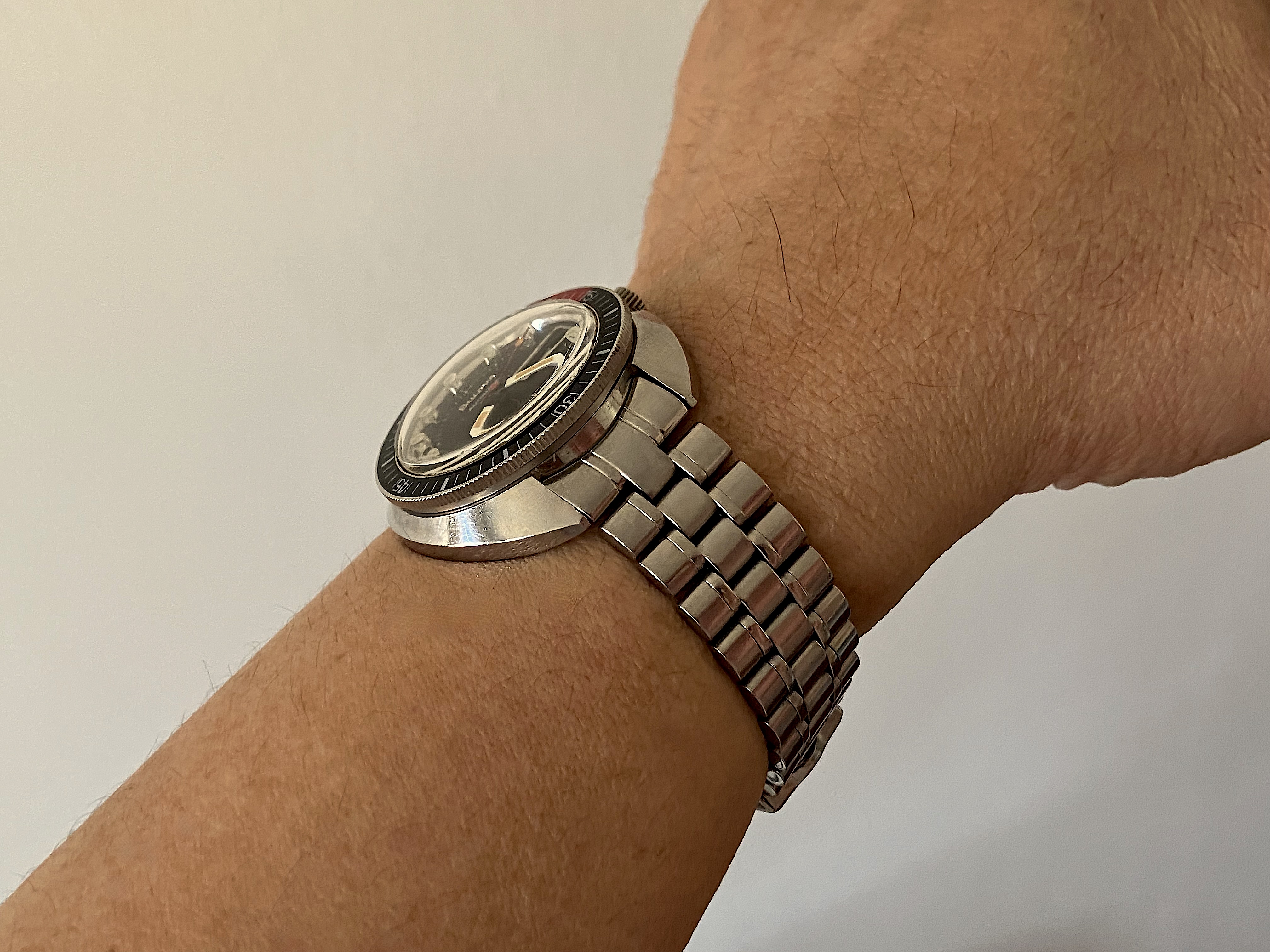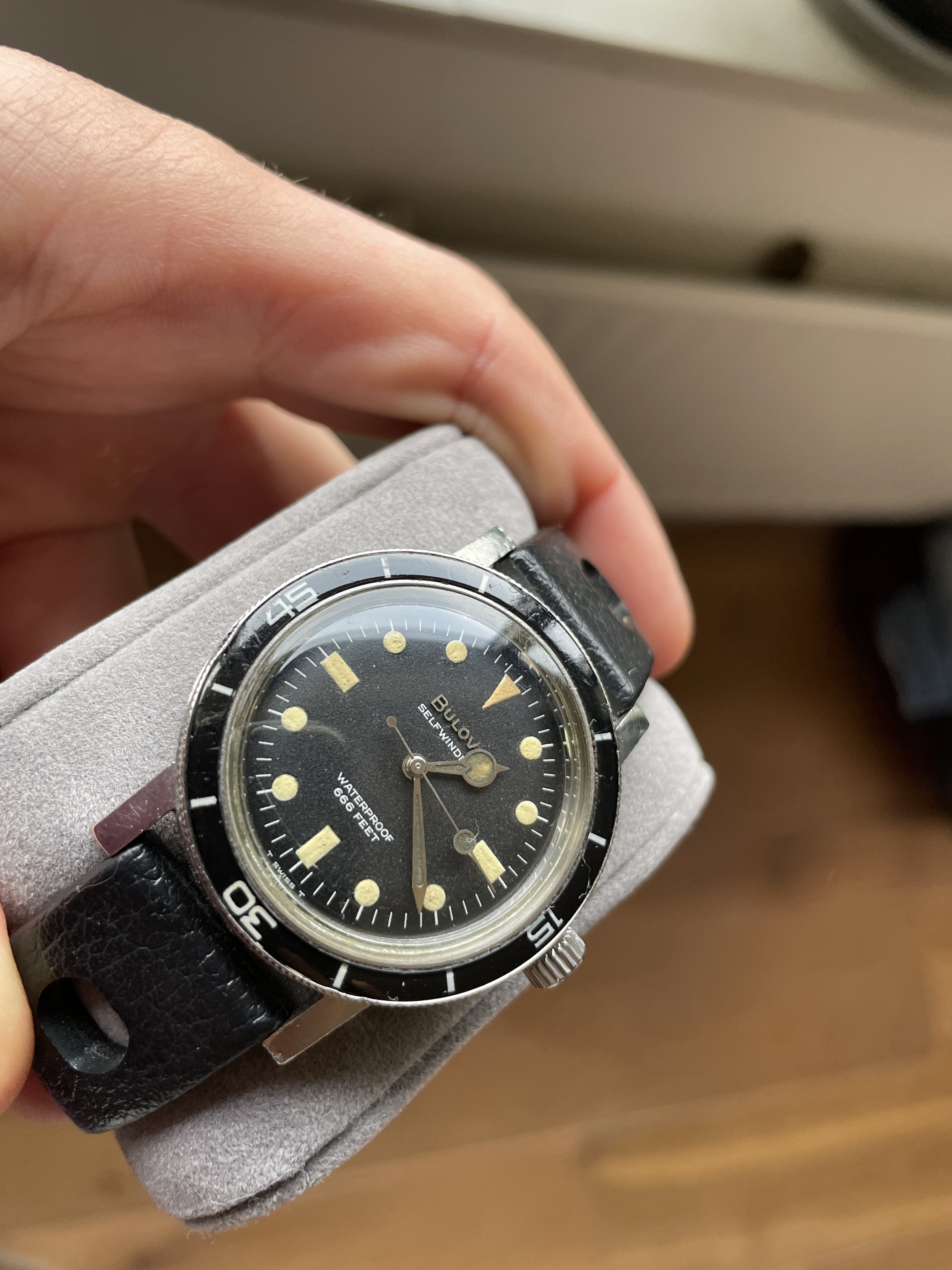I can’t speak to Aaron’s technique, but these dials are satin finished and very durable (thank you Singer). A swab with a bit of water or even alcohol won’t mess them up. Don’t try that with a lacquered dial like a Seamaster- you look a them wrong and the lettering rubs off
