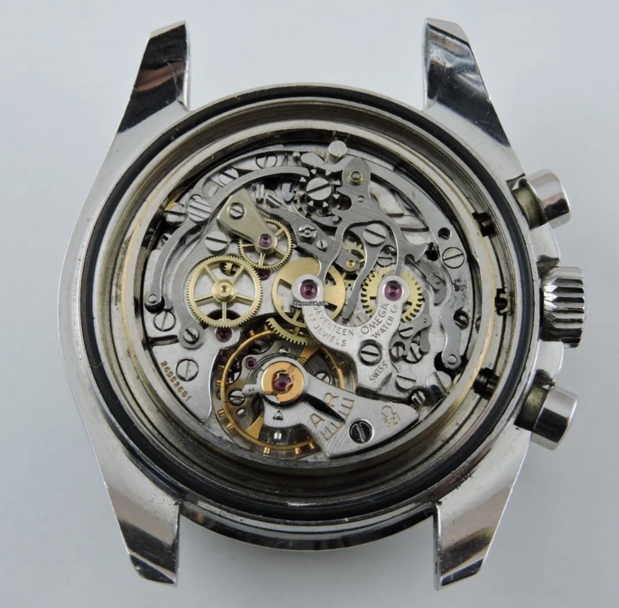 The whole watch is rather fishy (missing the original case back, heavily polished case, and replacement glass) so I don't really believe that story. But I'm curious what really happened there? Is it possible that it's Lemania movement with some modded elements from Omega 321? or maybe it was a possible way to "renovate" the rusted movement?