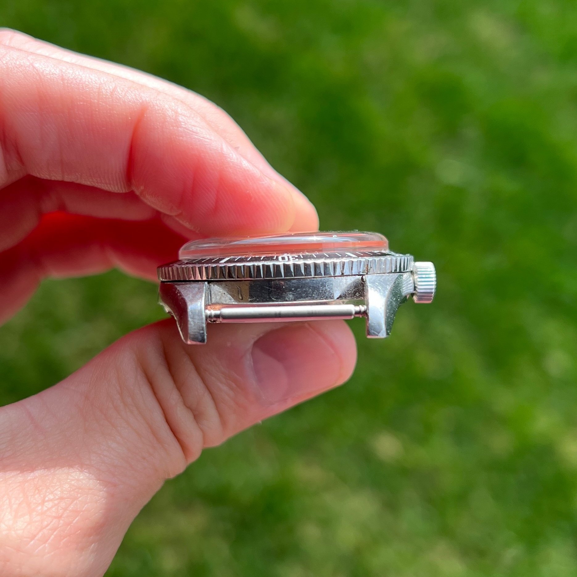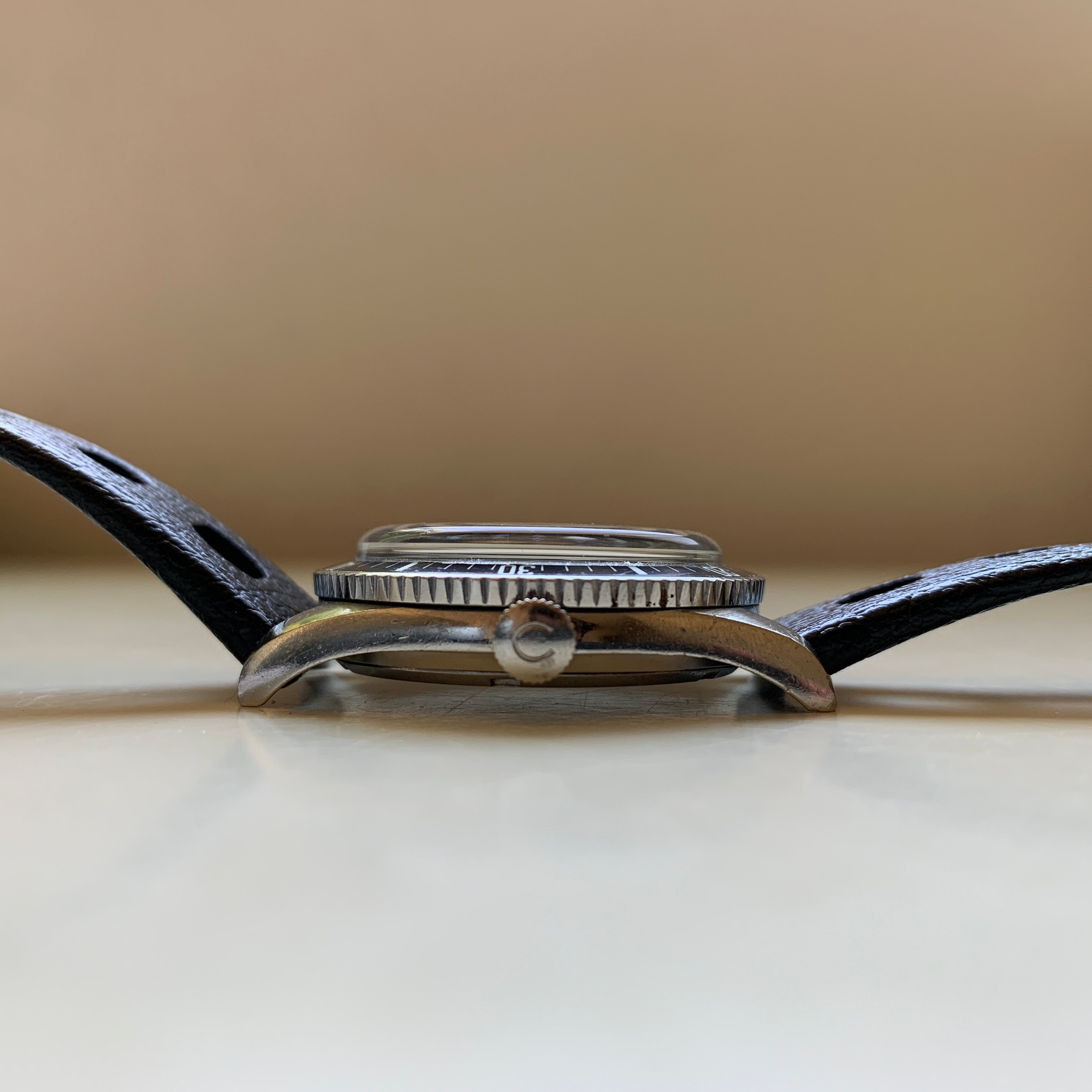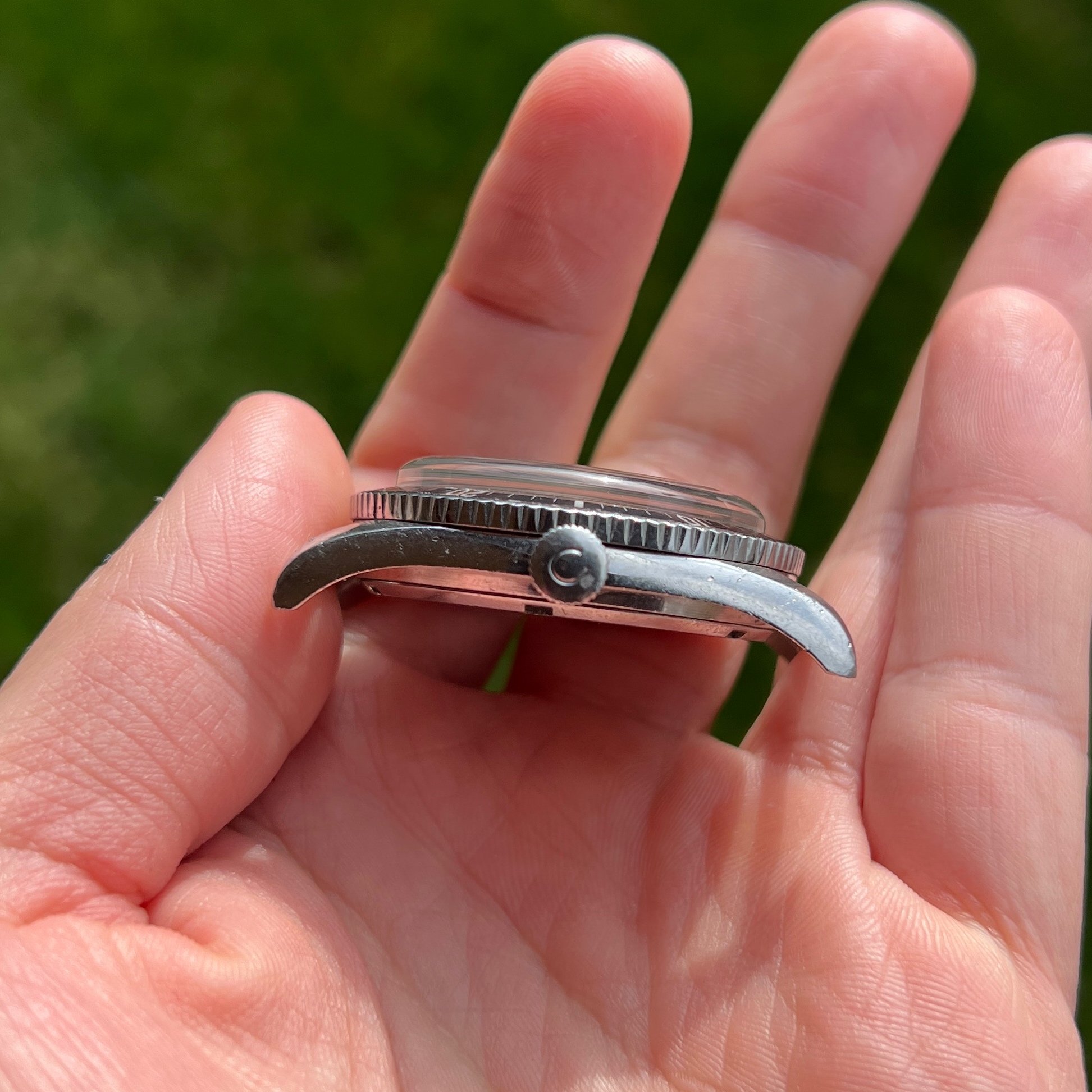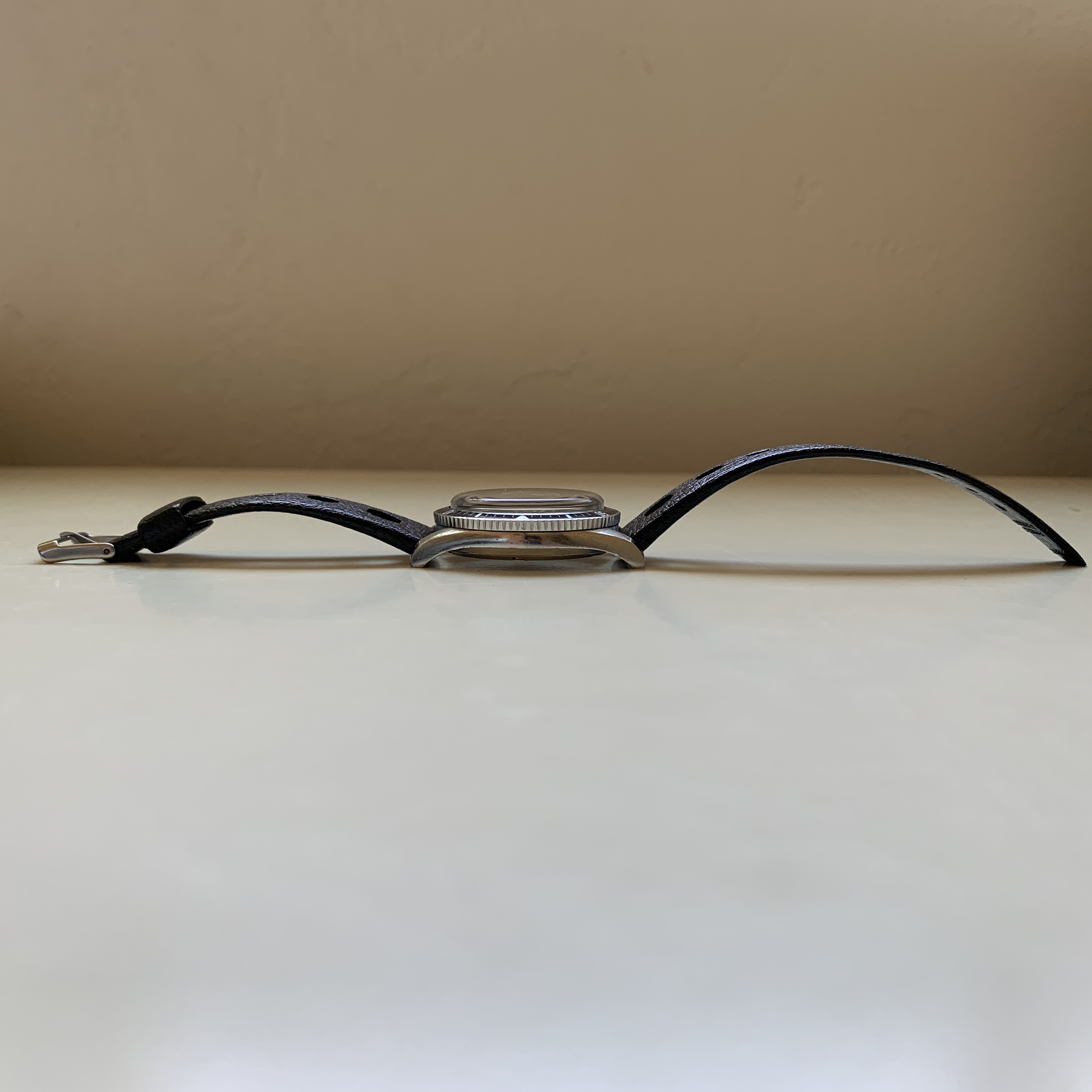 Dial: Original dial and hands in great vintage condition with the kind of patina you want on these. Very even and consistent coloring throughout with some oxidation on the hands, specifically the seconds hand, which adds to the overall tool aesthetic. This has the earlier "waterproof" 2-line dial, dagger or dauphine hands and the straight seconds with counter weight, my personal favorite configuration of these watches. Dial is very clean on wrist and to the naked eye, but as you can see in the photos, there's some lume dust or something the camera picks up from time to time, overall a really charming, honest, vintage watch.