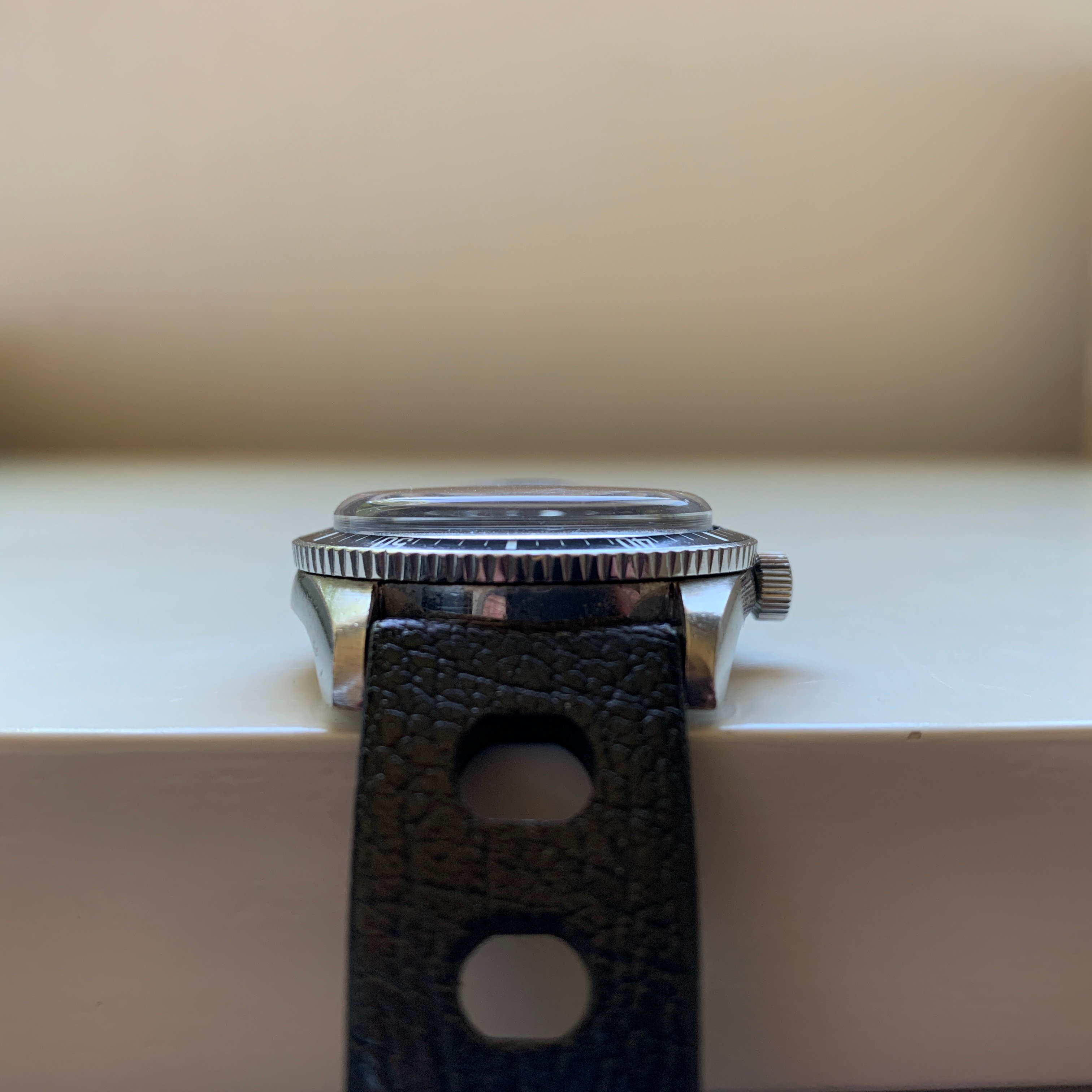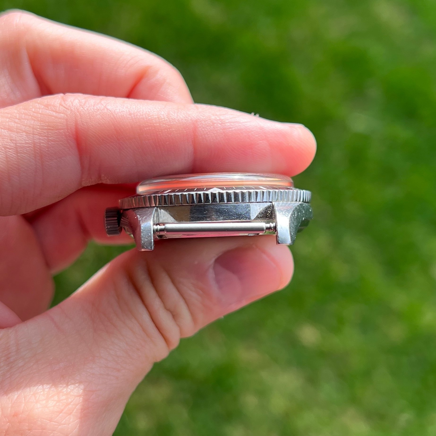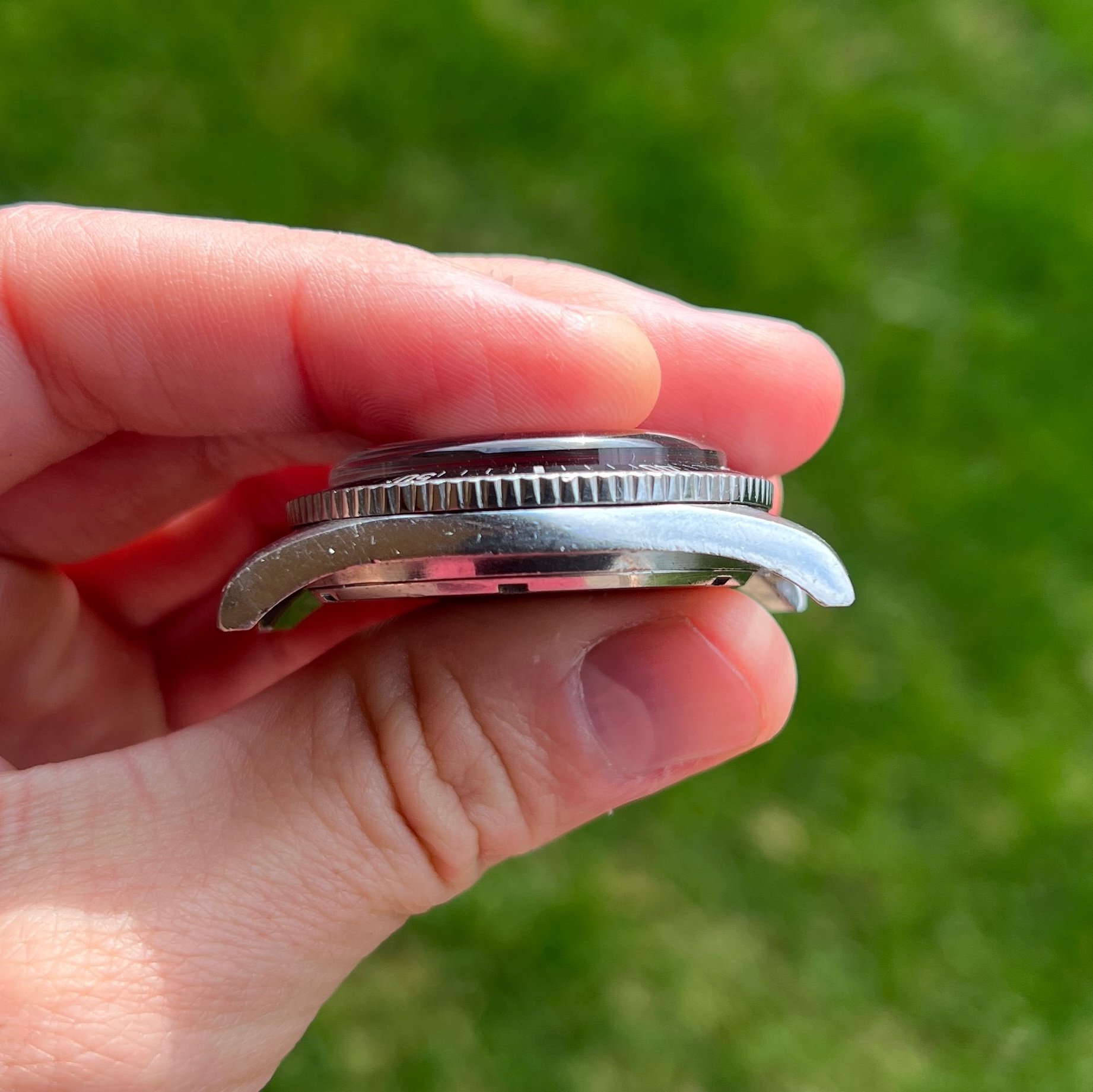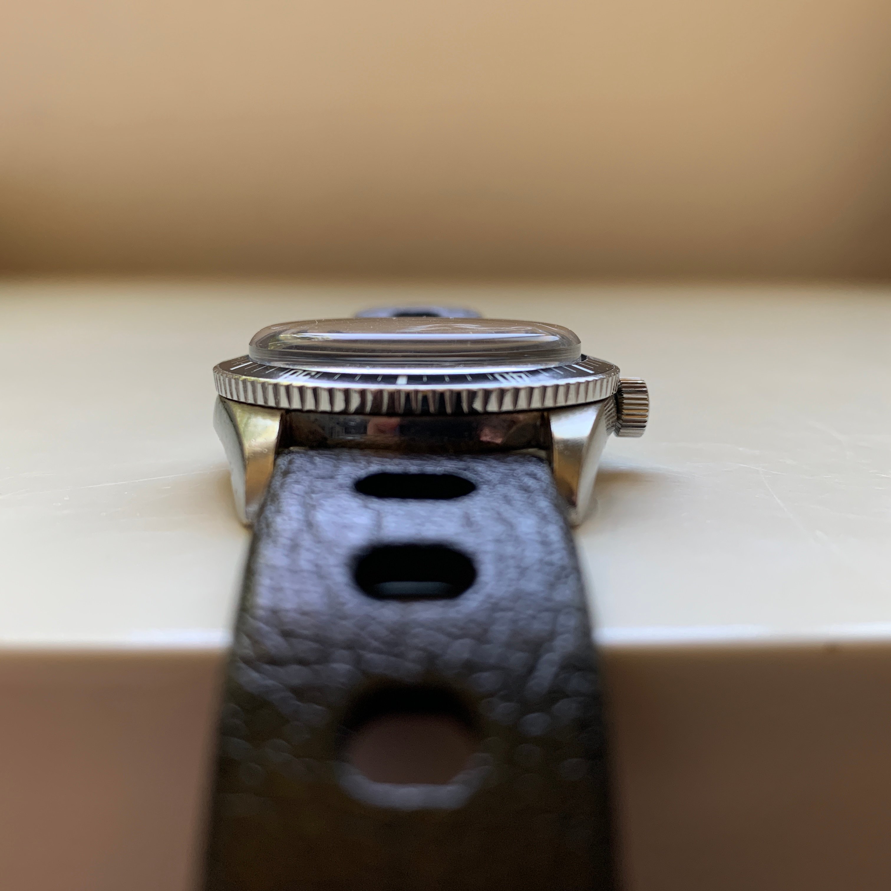 Dial: Original dial and hands in great vintage condition with the kind of patina you want on these. Very even and consistent coloring throughout with some oxidation on the hands, specifically the seconds hand, which adds to the overall tool aesthetic. This has the earlier "waterproof" 2-line dial, dagger or dauphine hands and the straight seconds with counter weight, my personal favorite configuration of these watches. Dial is very clean on wrist and to the naked eye, but as you can see in the photos, there's some lume dust or something the camera picks up from time to time, overall a really charming, honest, vintage watch.
