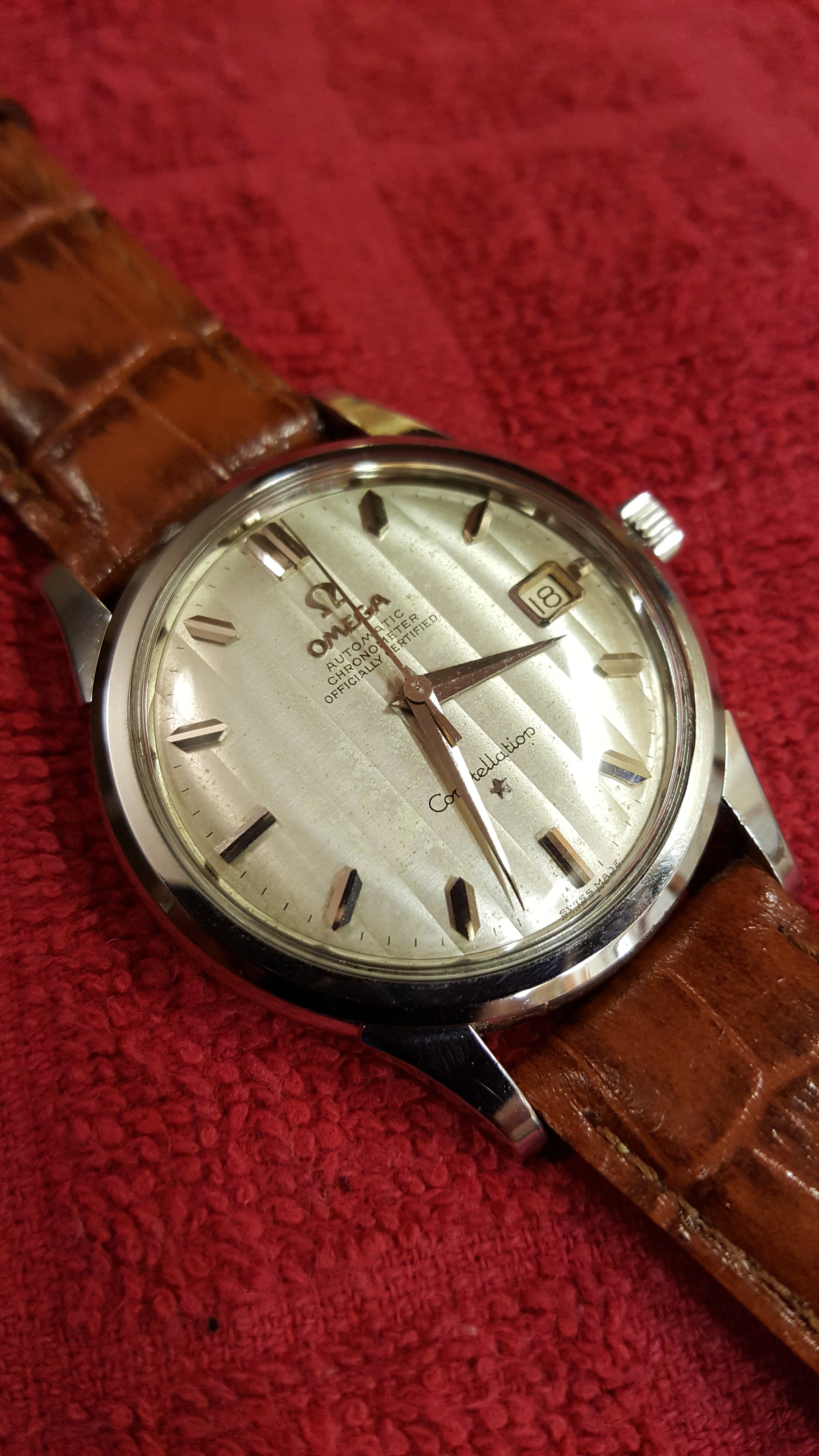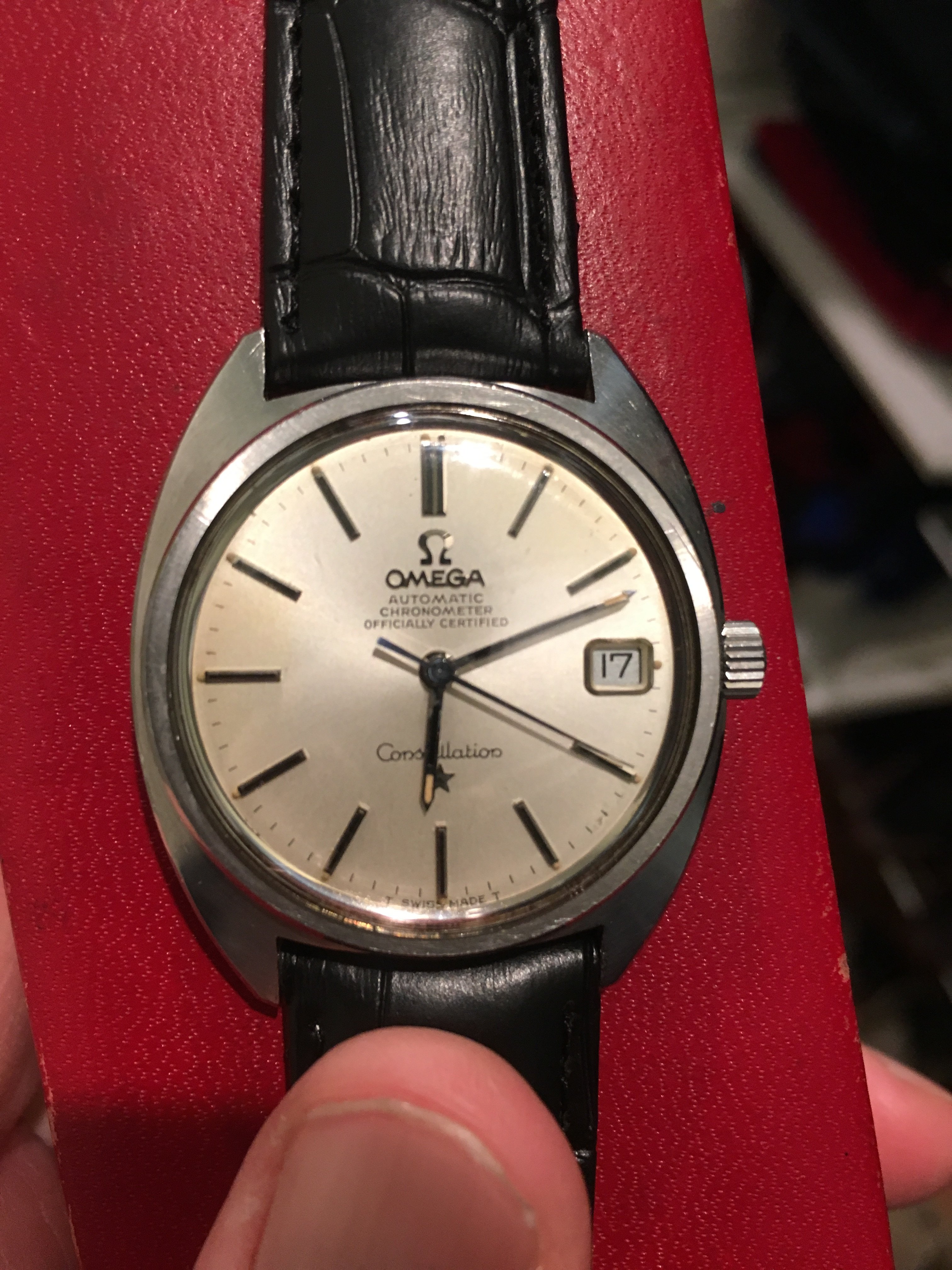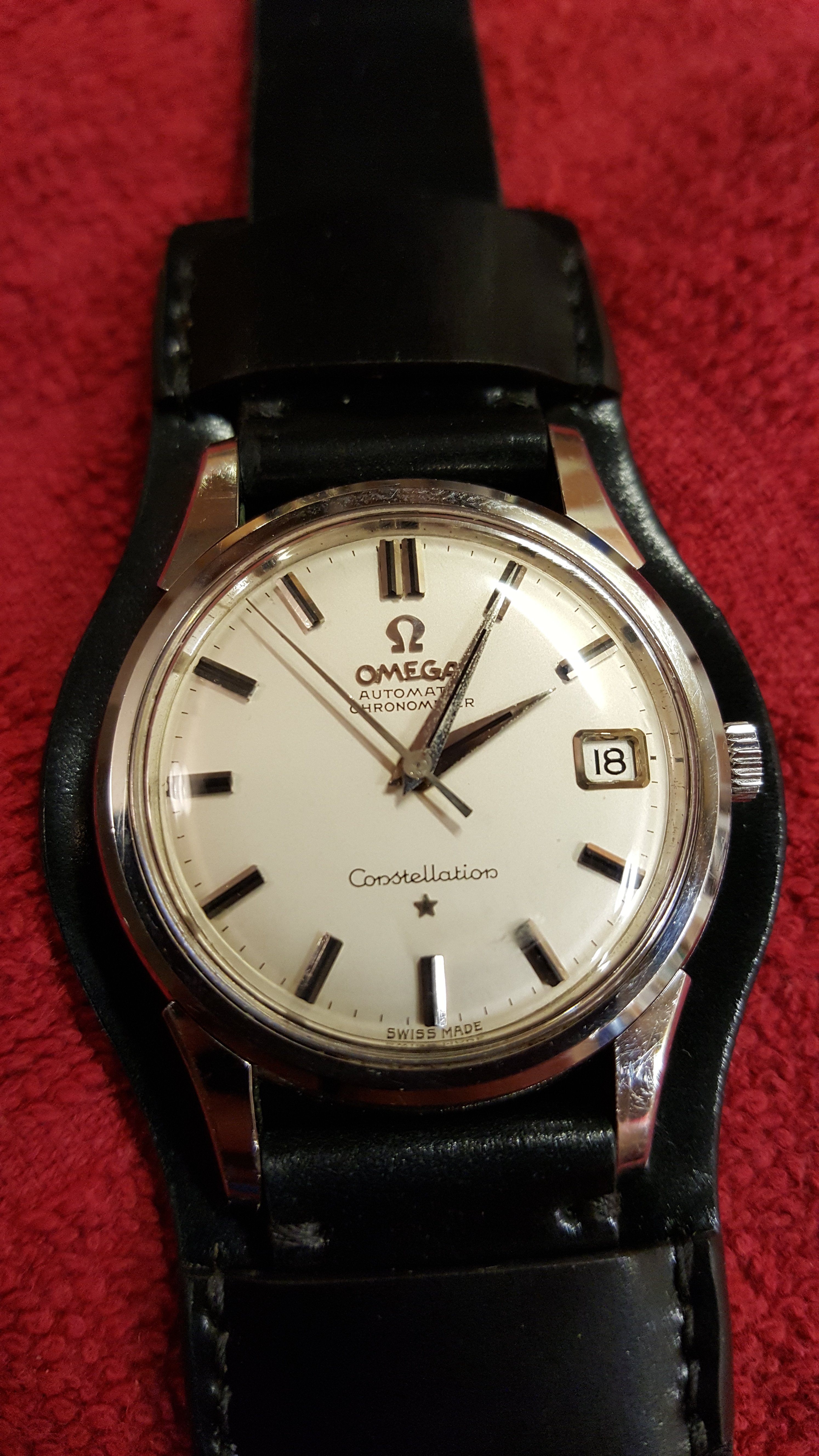 路Here's mine, I consider myself very lucky with the price paid for it. She looks better in person, and is currently at service. I can't wait to get her back!! I believe she's a 1968 model. Does anyone know what size bands/ straps they take? I've heard conflicting stories between 18/19mm.