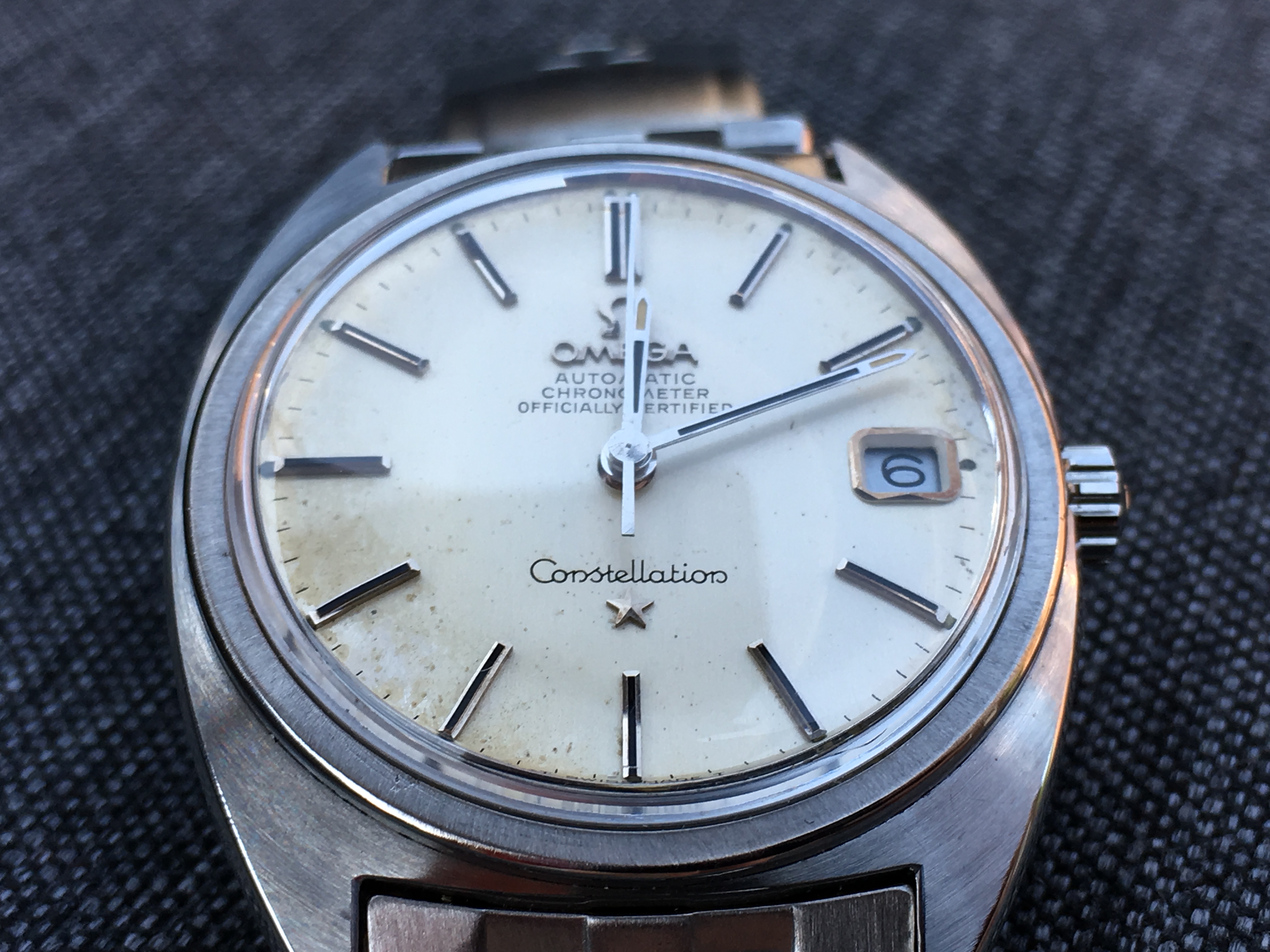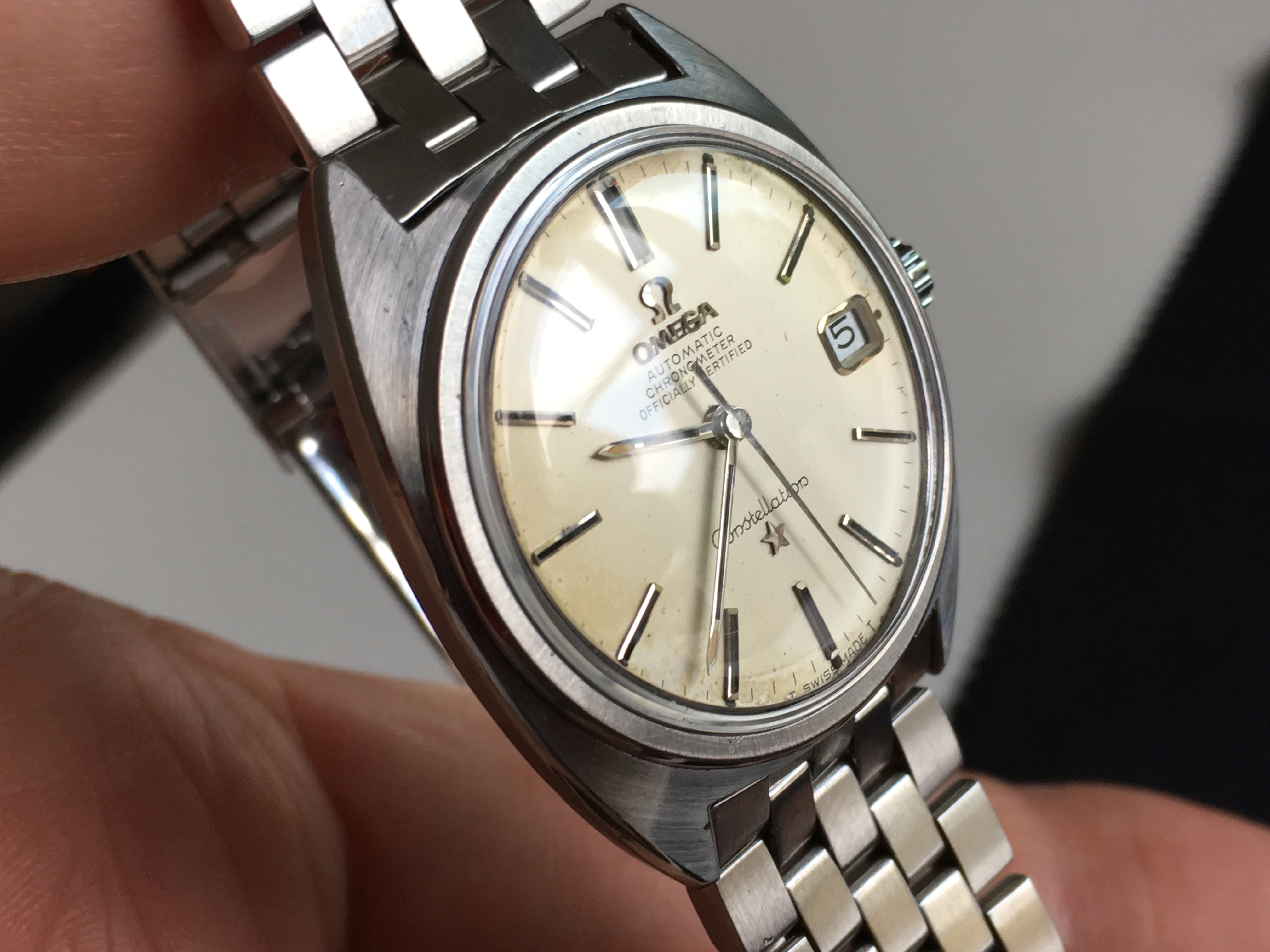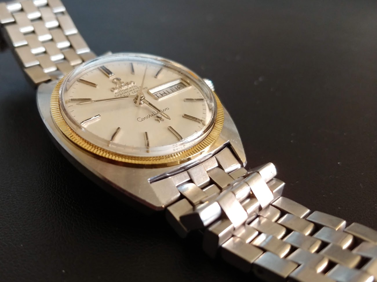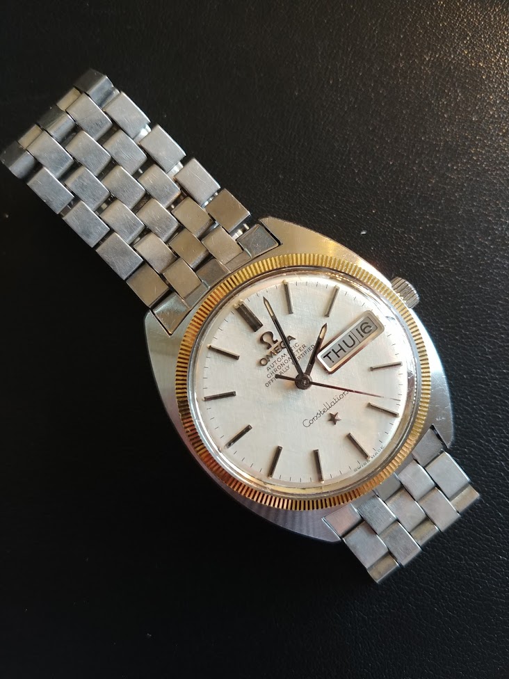 I bought it on eBay from the second owner of this watch. Apparently, the seller inherited it in 1975 from his grandfather, who purchased it in 1969 from his Omega dealer. It's a little unusual because the knurled bezel, which on stainless steel, non-gold filled C-case Connies is usually white gold, is in this instance yellow gold. I'm quite confident that it isn't "dirty" white gold, or white gold that lost its rhodium coating. It's thus the only two-tone C-case Constellation that I've seen. Does this mean it could be a franken? Maybe. I prefer to think not, of course, and would appreciate if people could help me figure this out either way. I would like to believe the seller who says all of this is original.