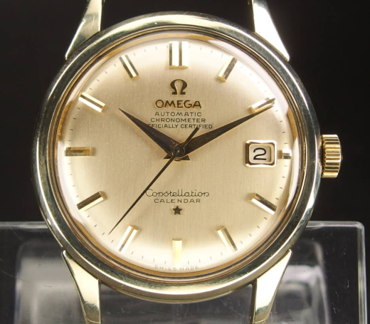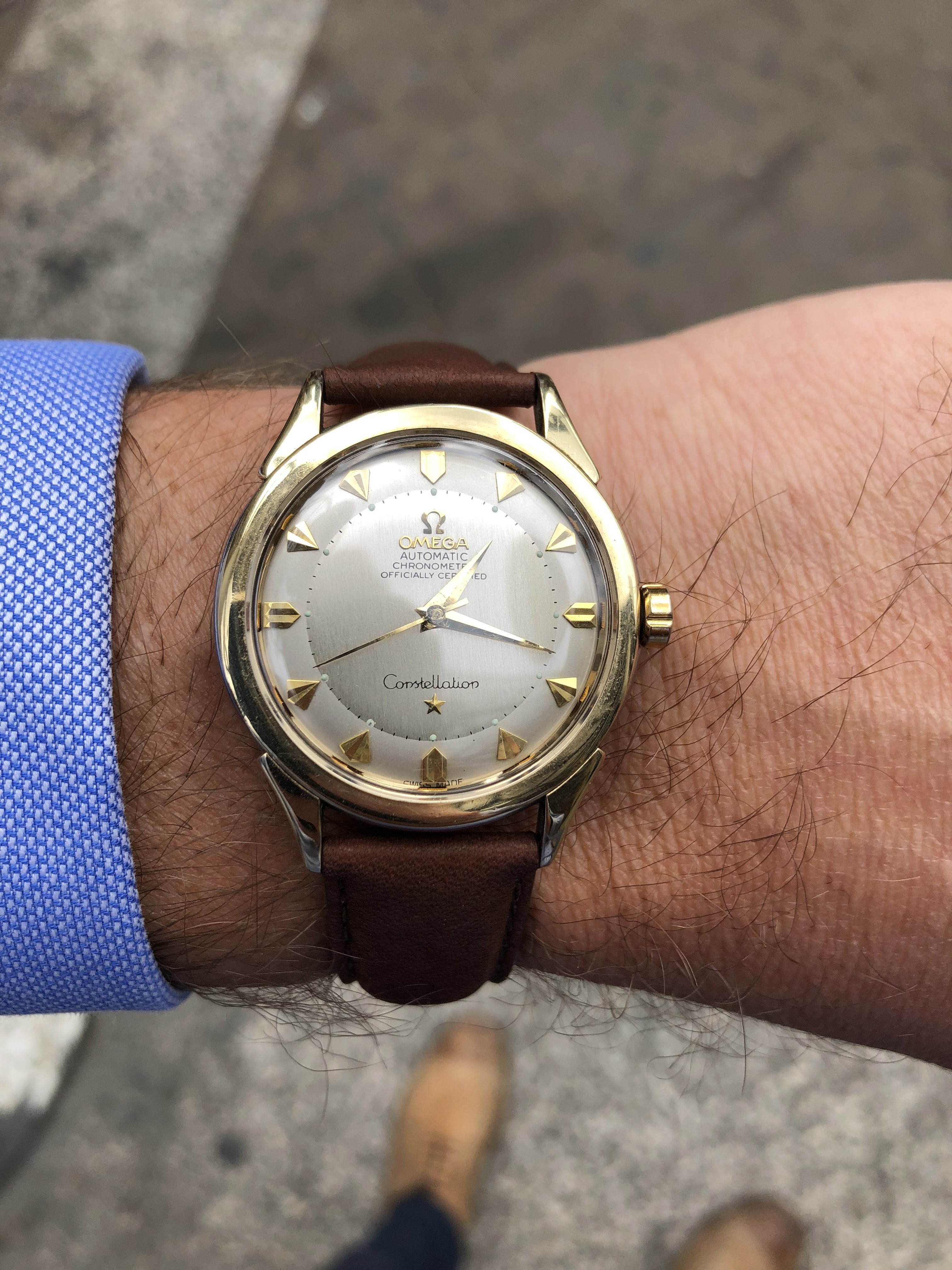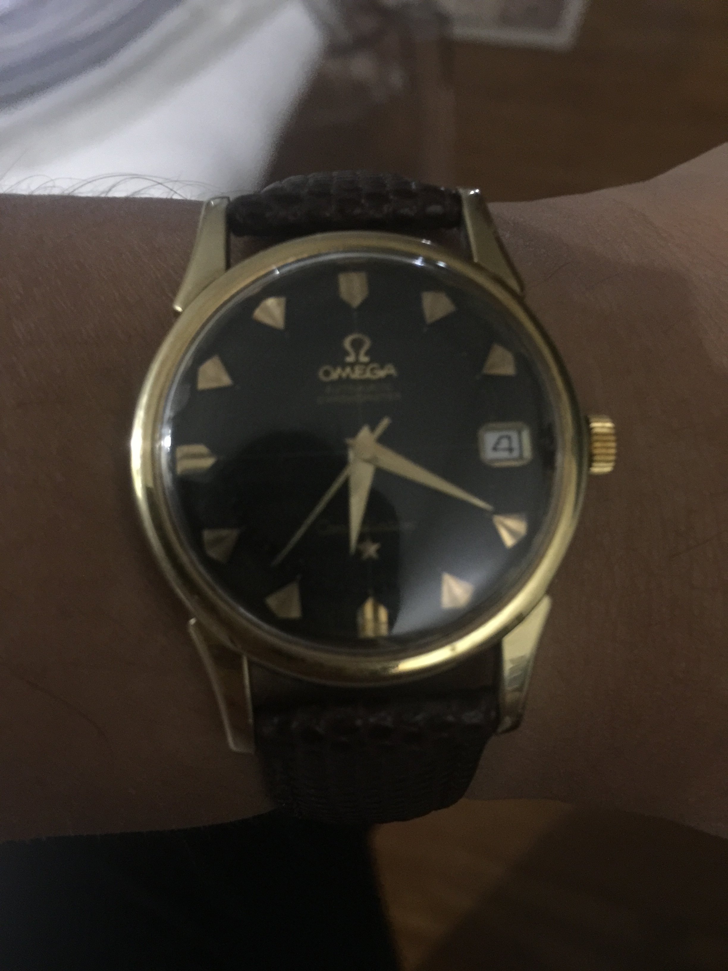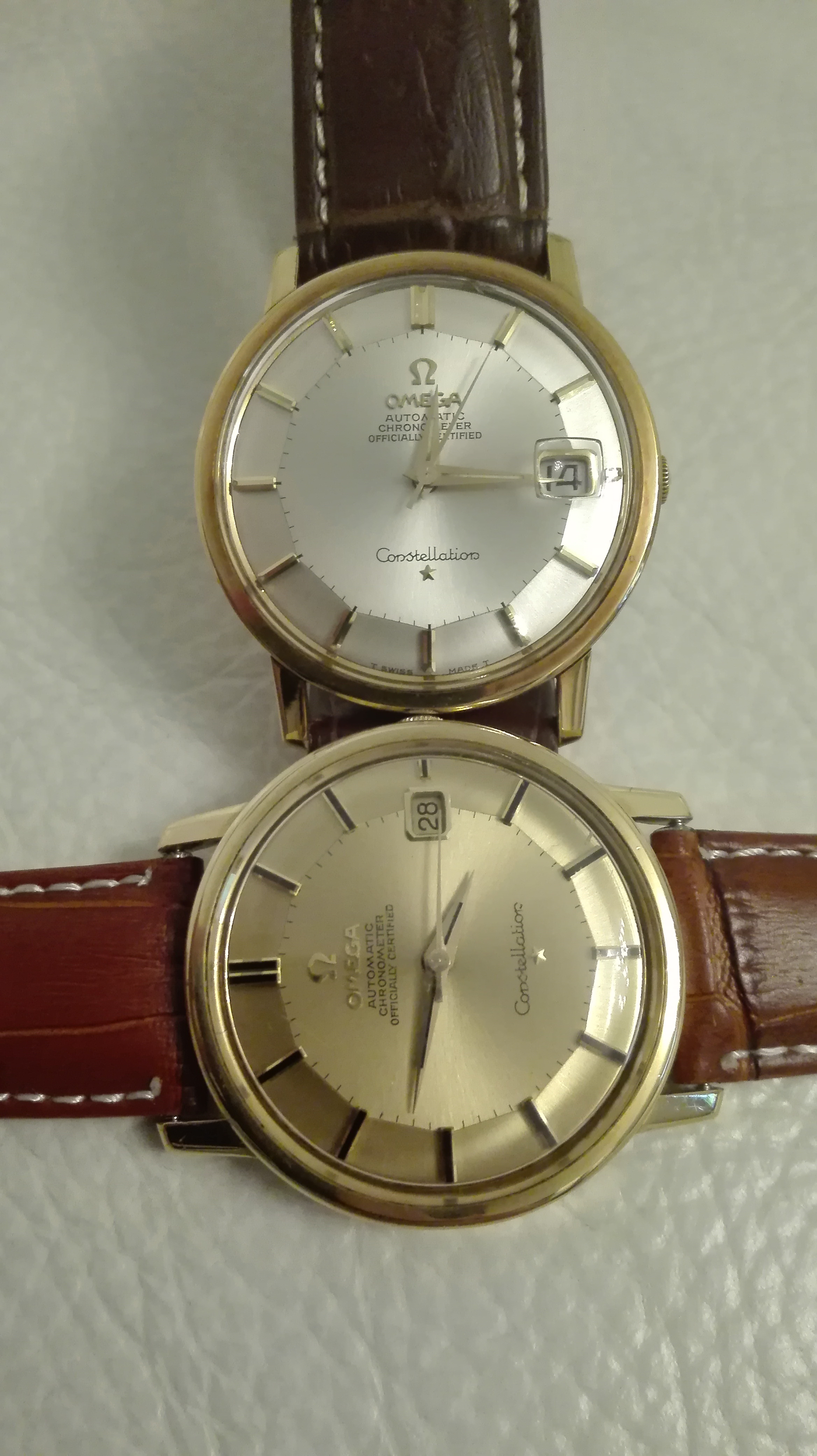 I bought it on eBay from the second owner of this watch. Apparently, the seller inherited it in 1975 from his grandfather, who purchased it in 1969 from his Omega dealer. It's a little unusual because the knurled bezel, which on stainless steel, non-gold filled C-case Connies is usually white gold, is in this instance yellow gold. I'm quite confident that it isn't "dirty" white gold, or white gold that lost its rhodium coating. It's thus the only two-tone C-case Constellation that I've seen. Does this mean it could be a franken? Maybe. I prefer to think not, of course, and would appreciate if people could help me figure this out either way. I would like to believe the seller who says all of this is original.