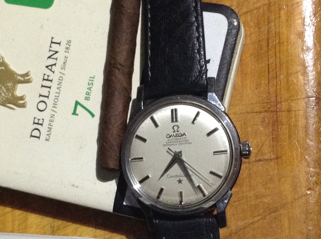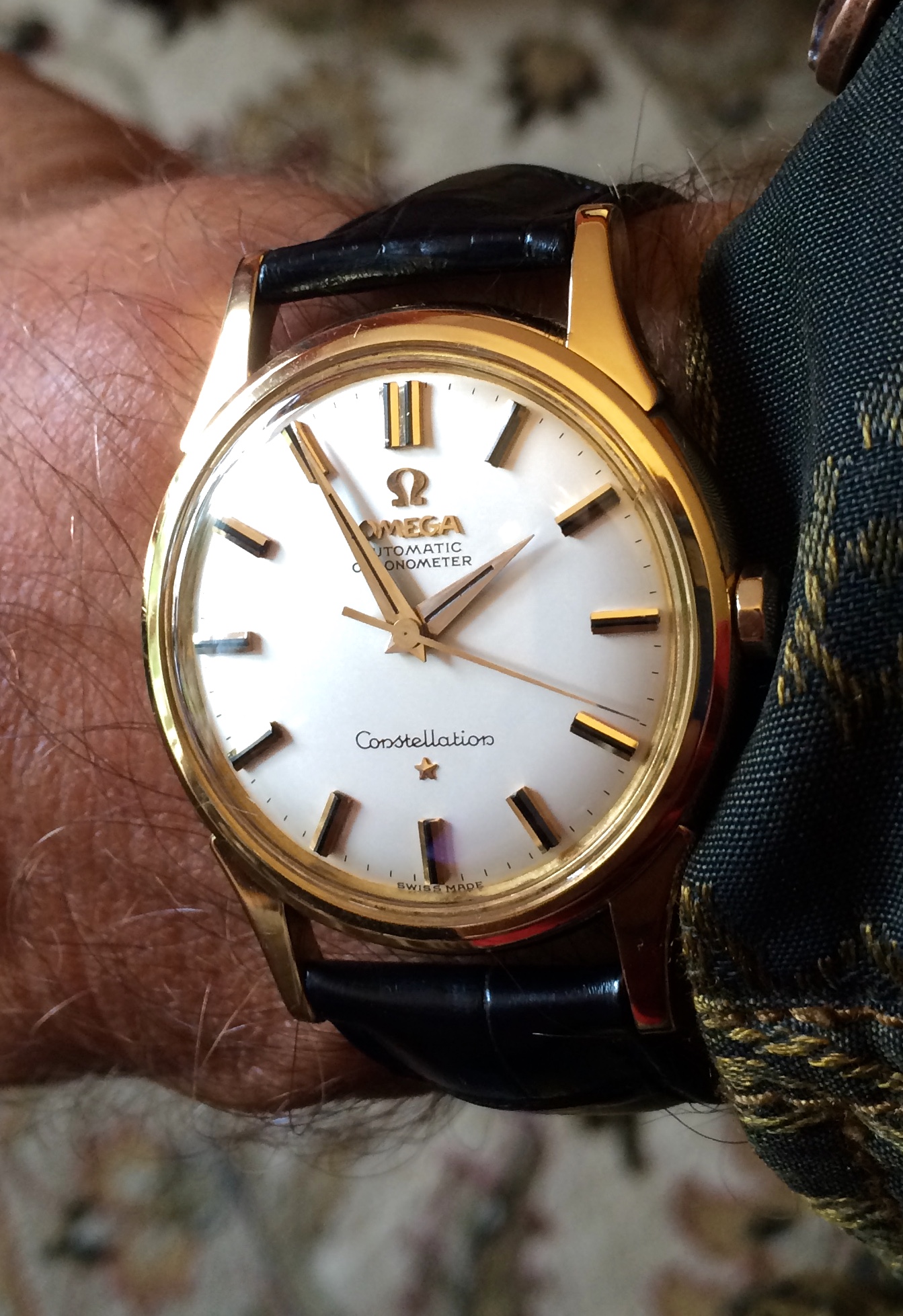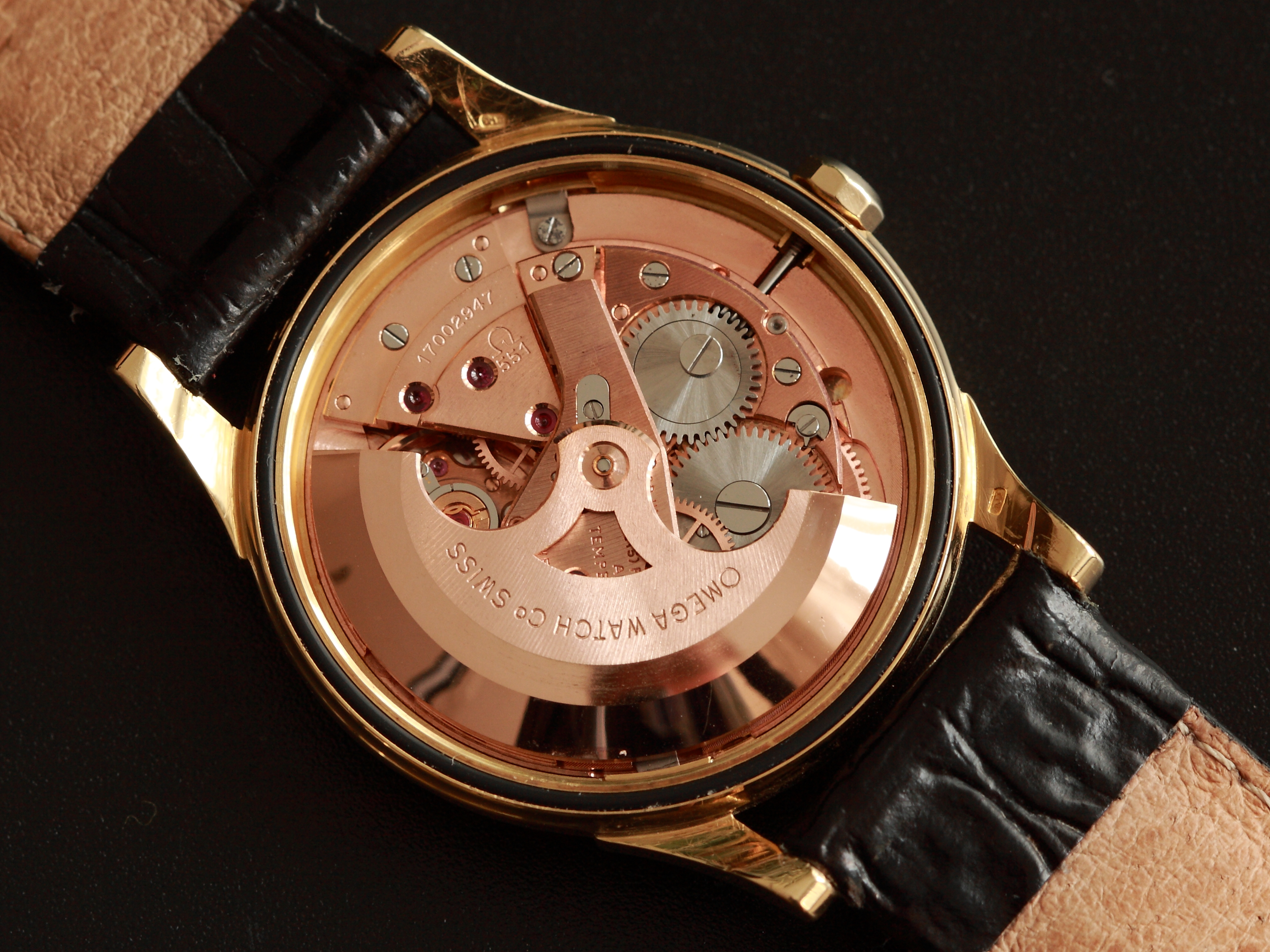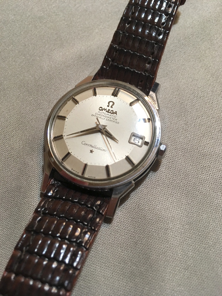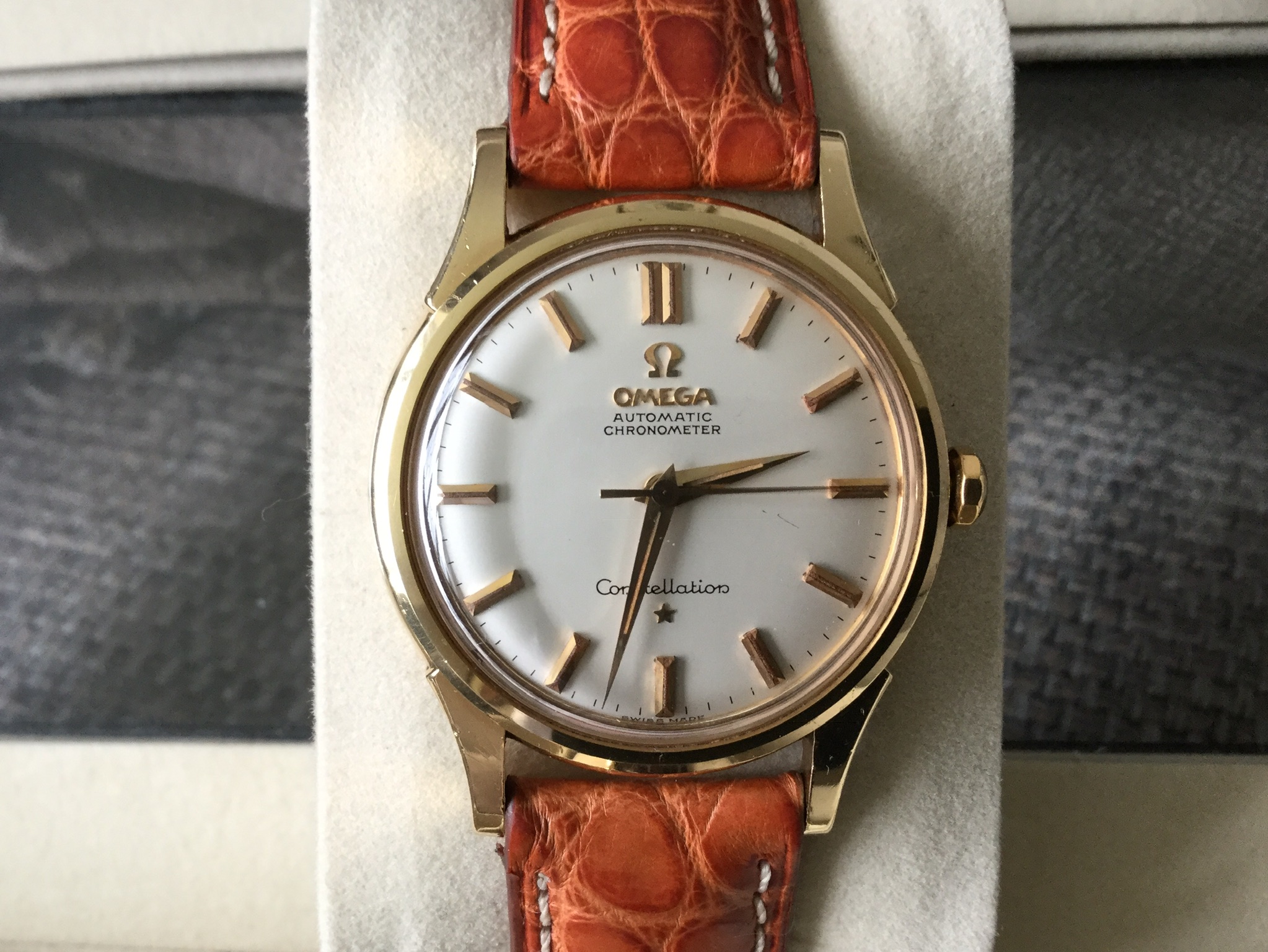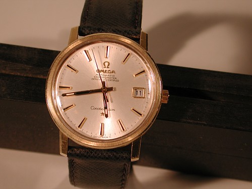 ·I bought this in 2002 off ebay from a shop in Melbourne (Watchco, I think). It is a 168.018 gold capped model (looks to be unpolished) originally purchased in Singapore 1968 (a duty free purchase no doubt). I had it serviced and it came back with the correct hands, band (cross hatched leather as in catalogue pictures) and crown. A couple of the hour markers dropped off during use (you can see one varnish flake at the 10 o'clock marker because of this), but all seems to be in a stable condition now. I do love it and wear it occasionally, but 35mm feels a little small now.