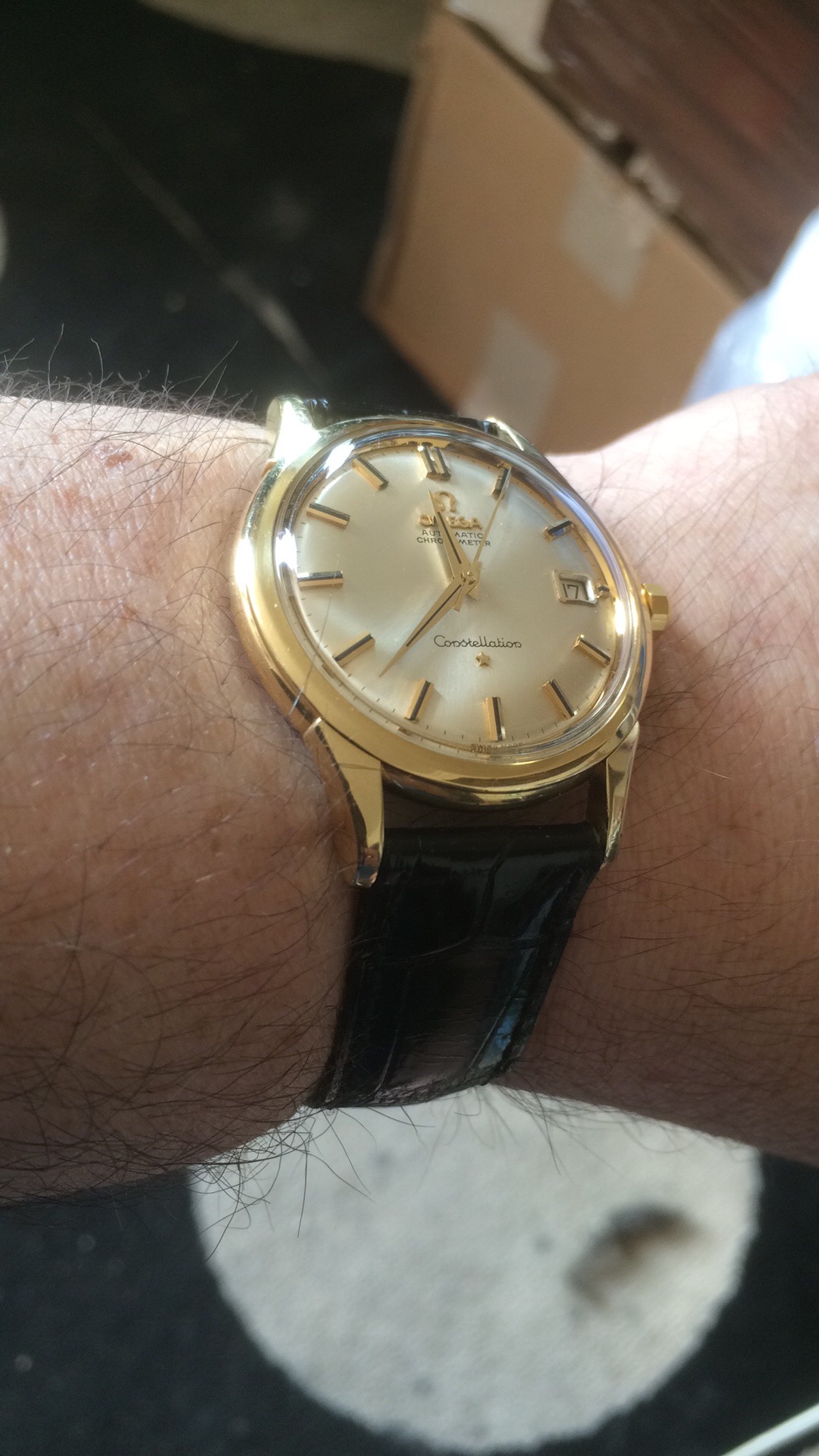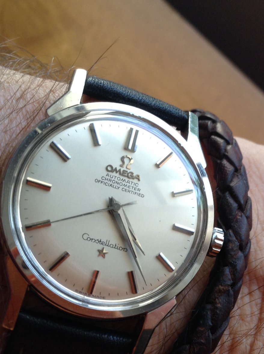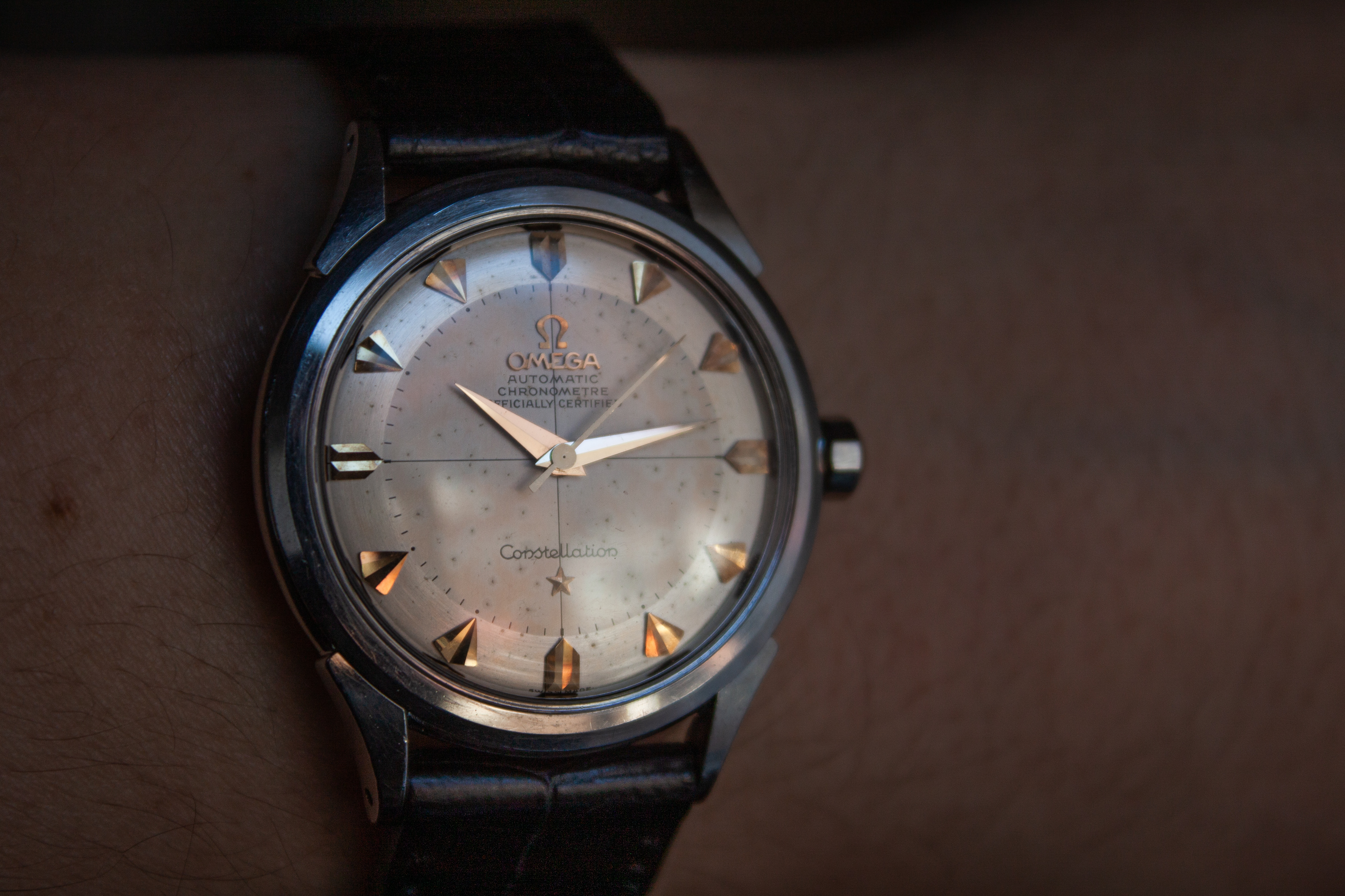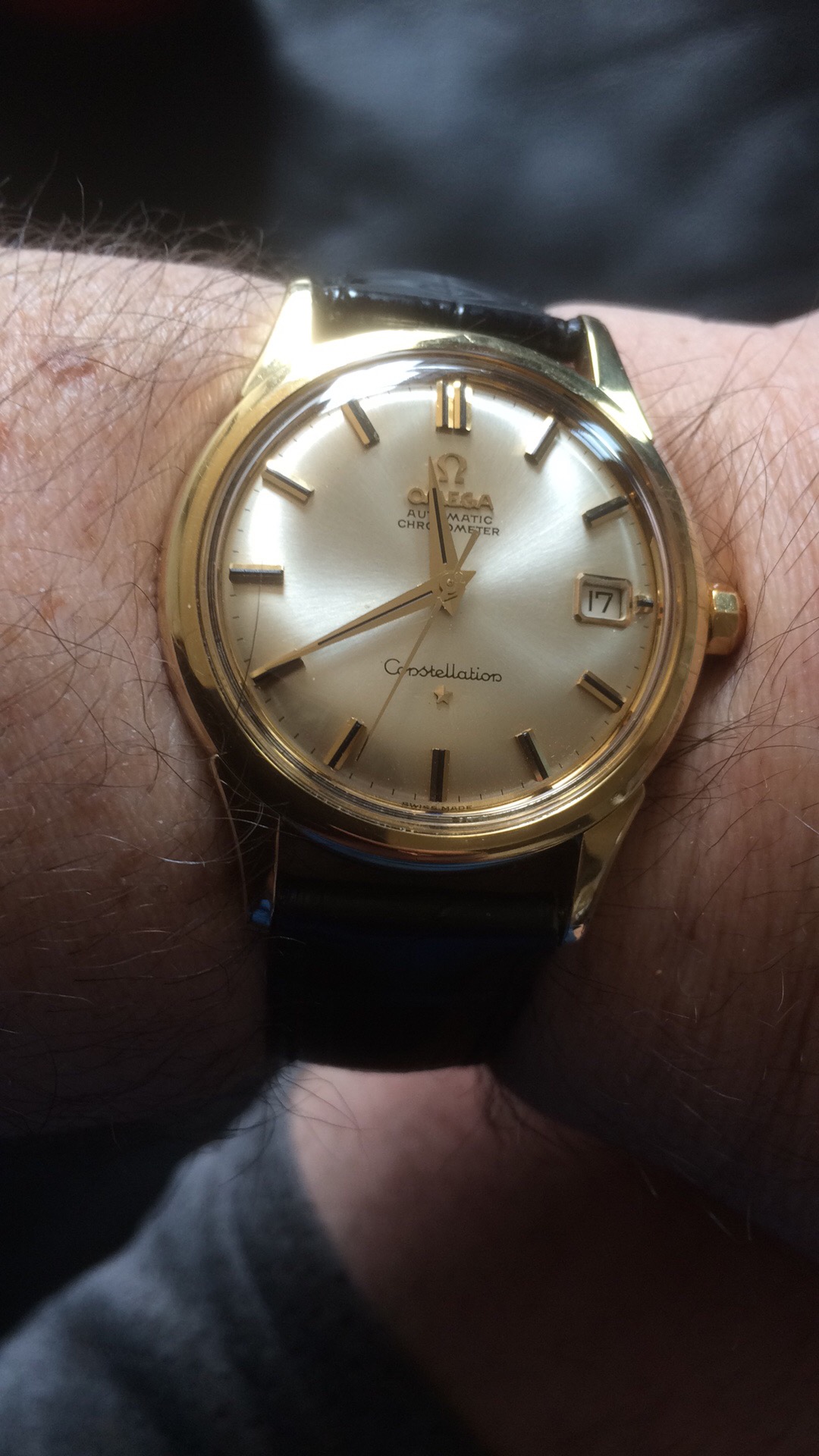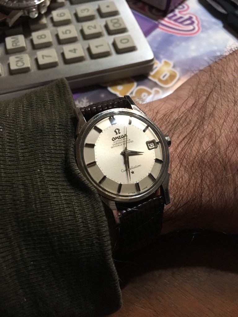 ·I bought this in 2002 off ebay from a shop in Melbourne (Watchco, I think). It is a 168.018 gold capped model (looks to be unpolished) originally purchased in Singapore 1968 (a duty free purchase no doubt). I had it serviced and it came back with the correct hands, band (cross hatched leather as in catalogue pictures) and crown. A couple of the hour markers dropped off during use (you can see one varnish flake at the 10 o'clock marker because of this), but all seems to be in a stable condition now. I do love it and wear it occasionally, but 35mm feels a little small now.