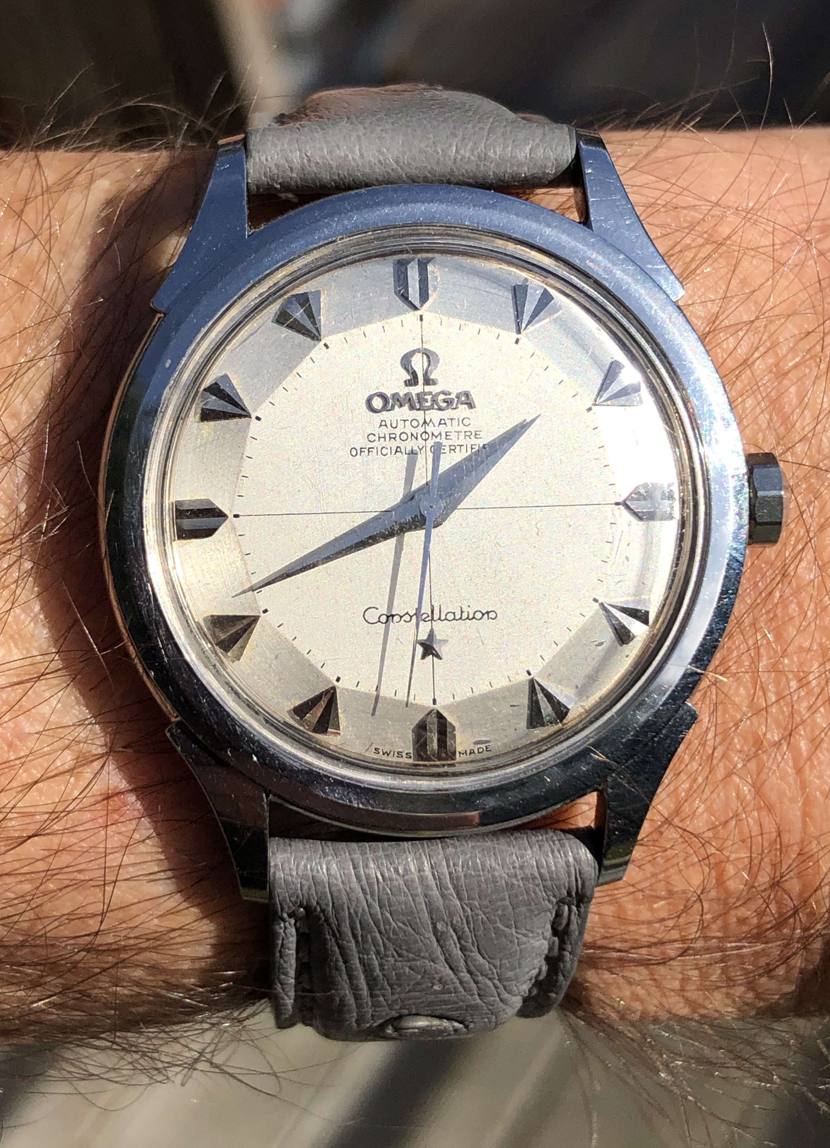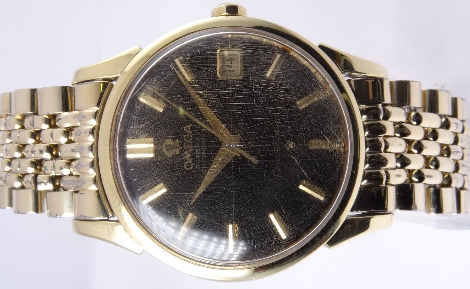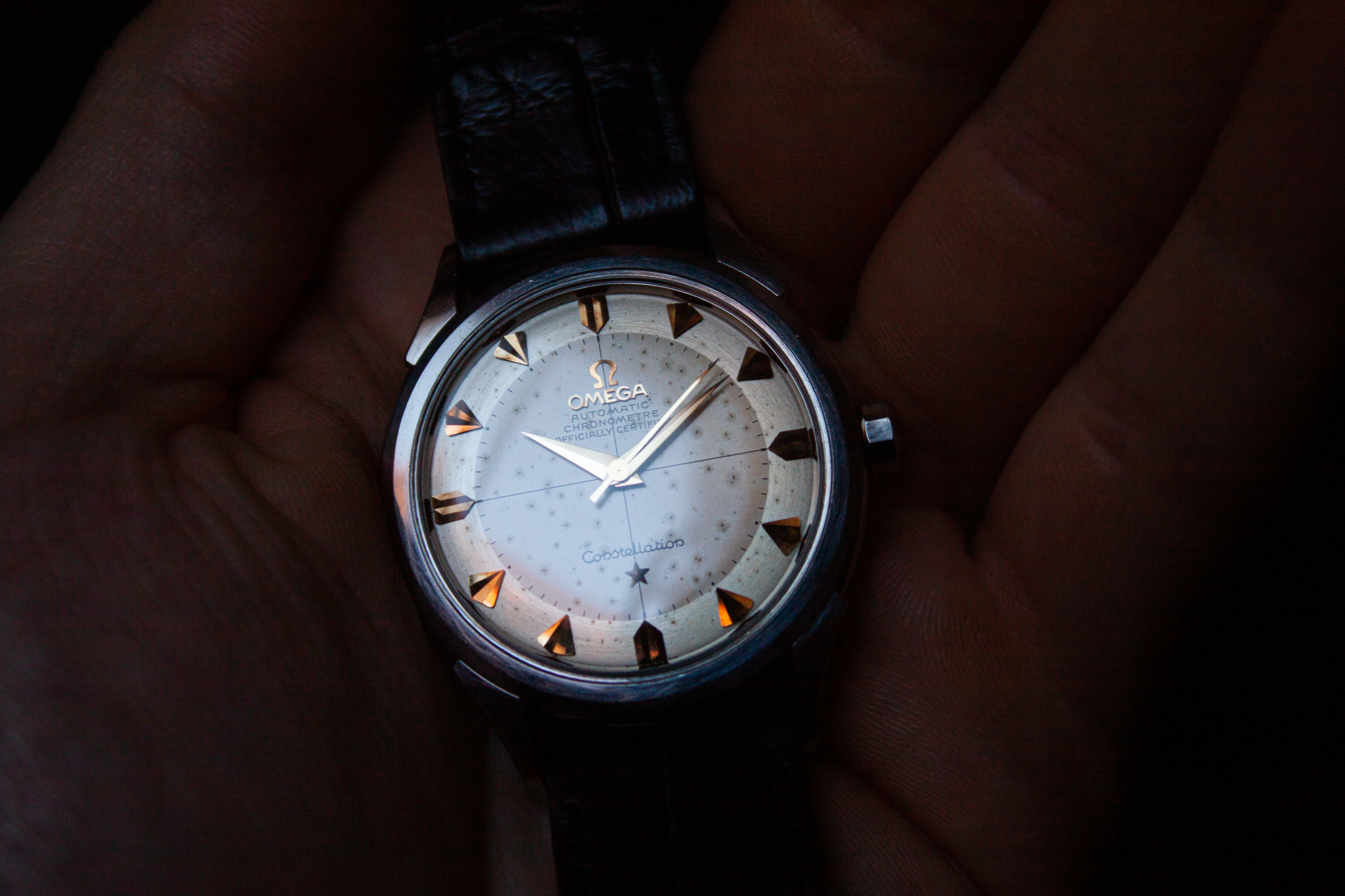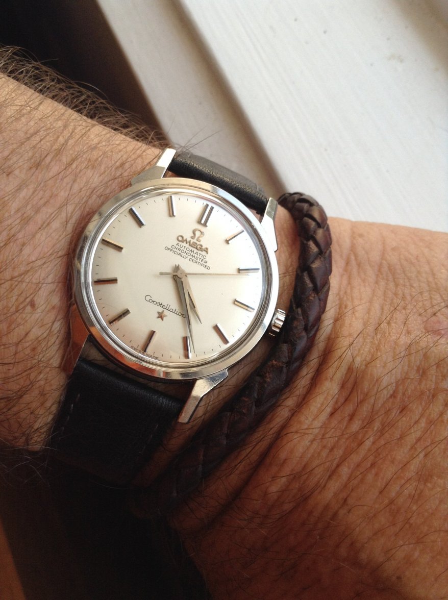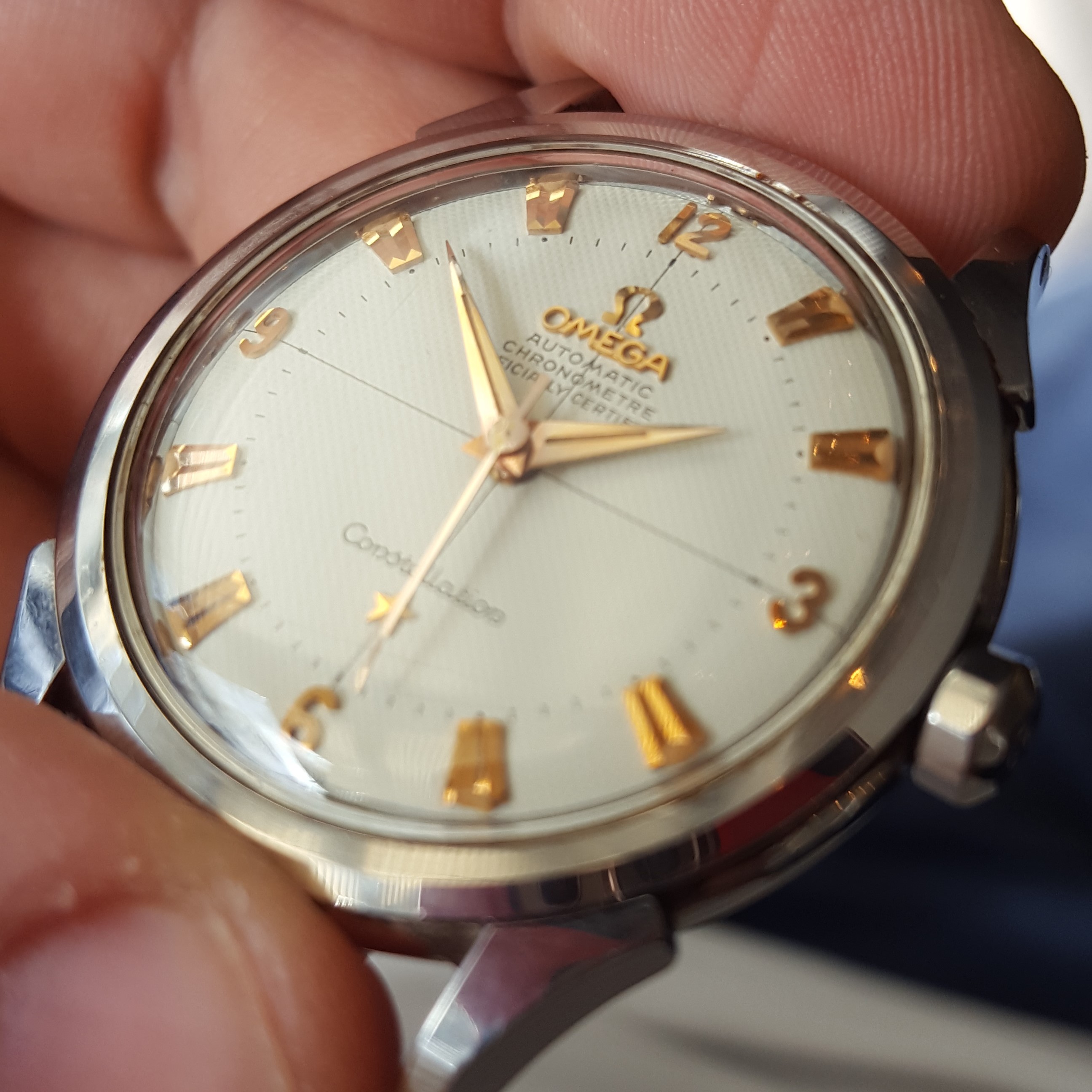 ·I bought this in 2002 off ebay from a shop in Melbourne (Watchco, I think). It is a 168.018 gold capped model (looks to be unpolished) originally purchased in Singapore 1968 (a duty free purchase no doubt). I had it serviced and it came back with the correct hands, band (cross hatched leather as in catalogue pictures) and crown. A couple of the hour markers dropped off during use (you can see one varnish flake at the 10 o'clock marker because of this), but all seems to be in a stable condition now. I do love it and wear it occasionally, but 35mm feels a little small now.