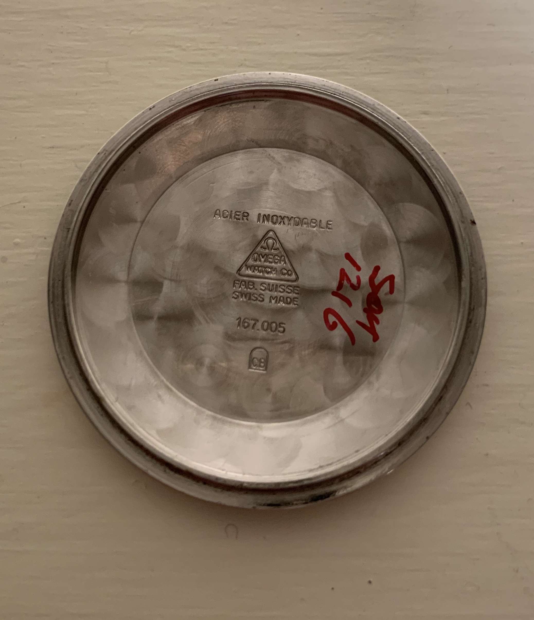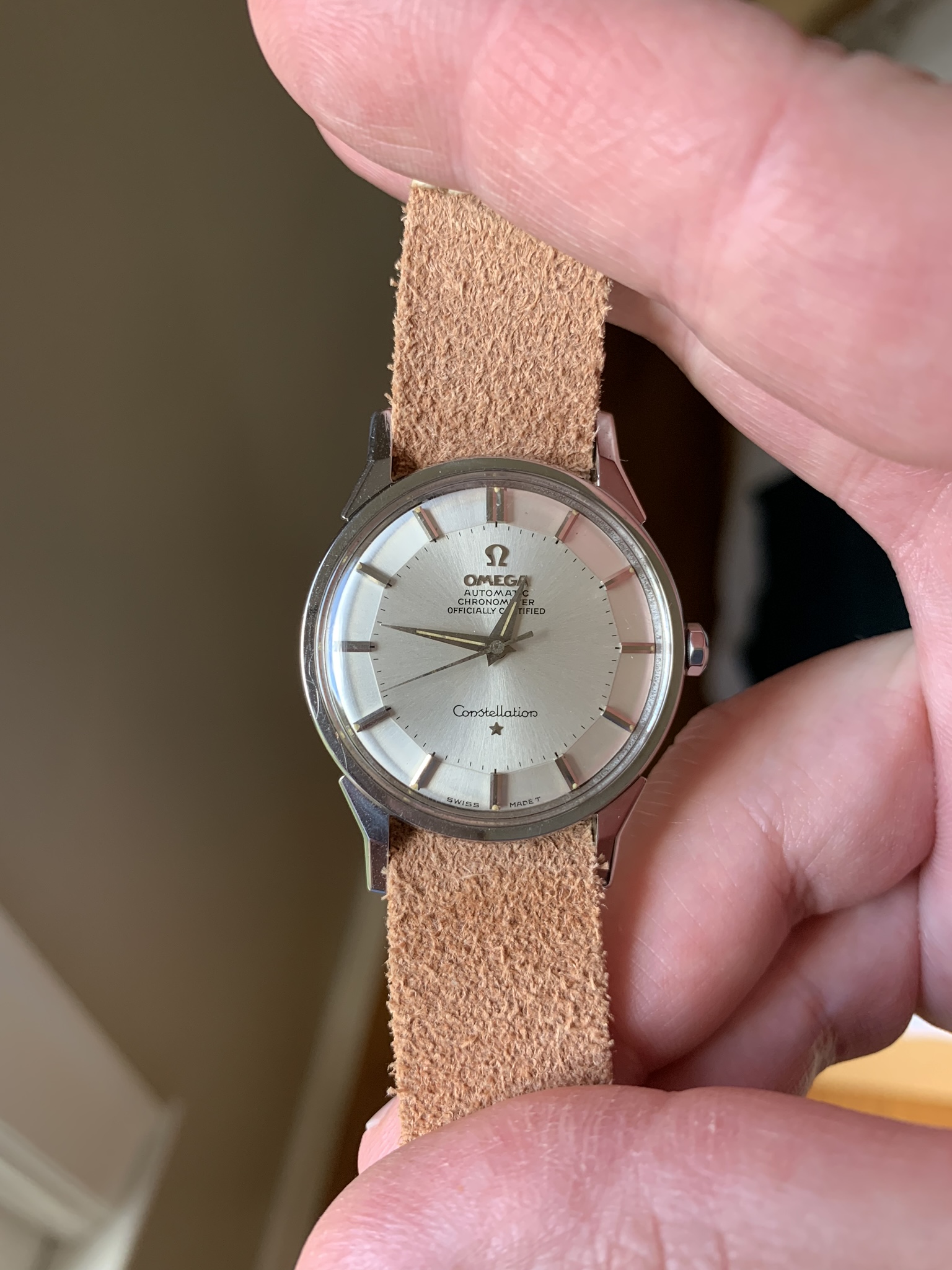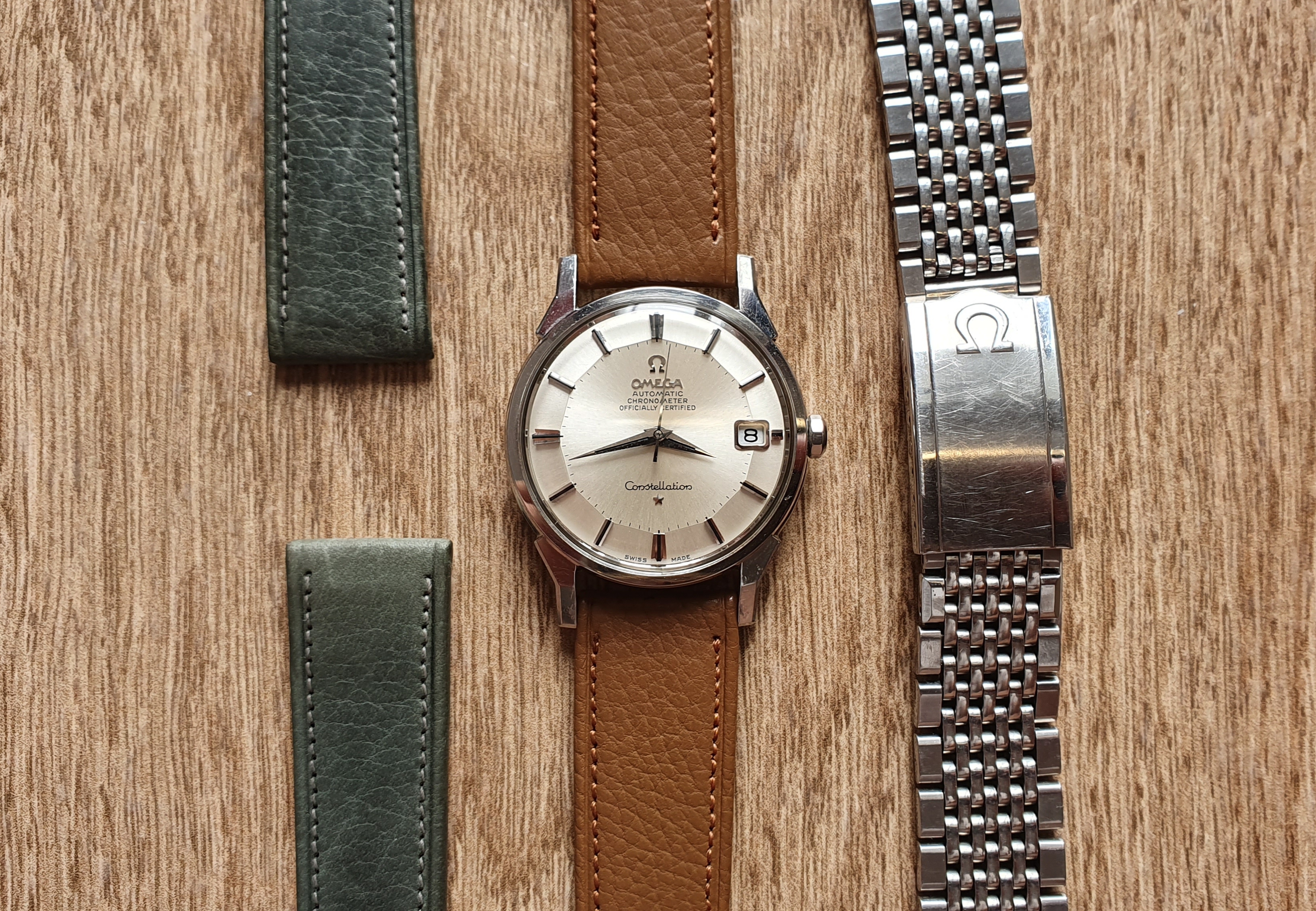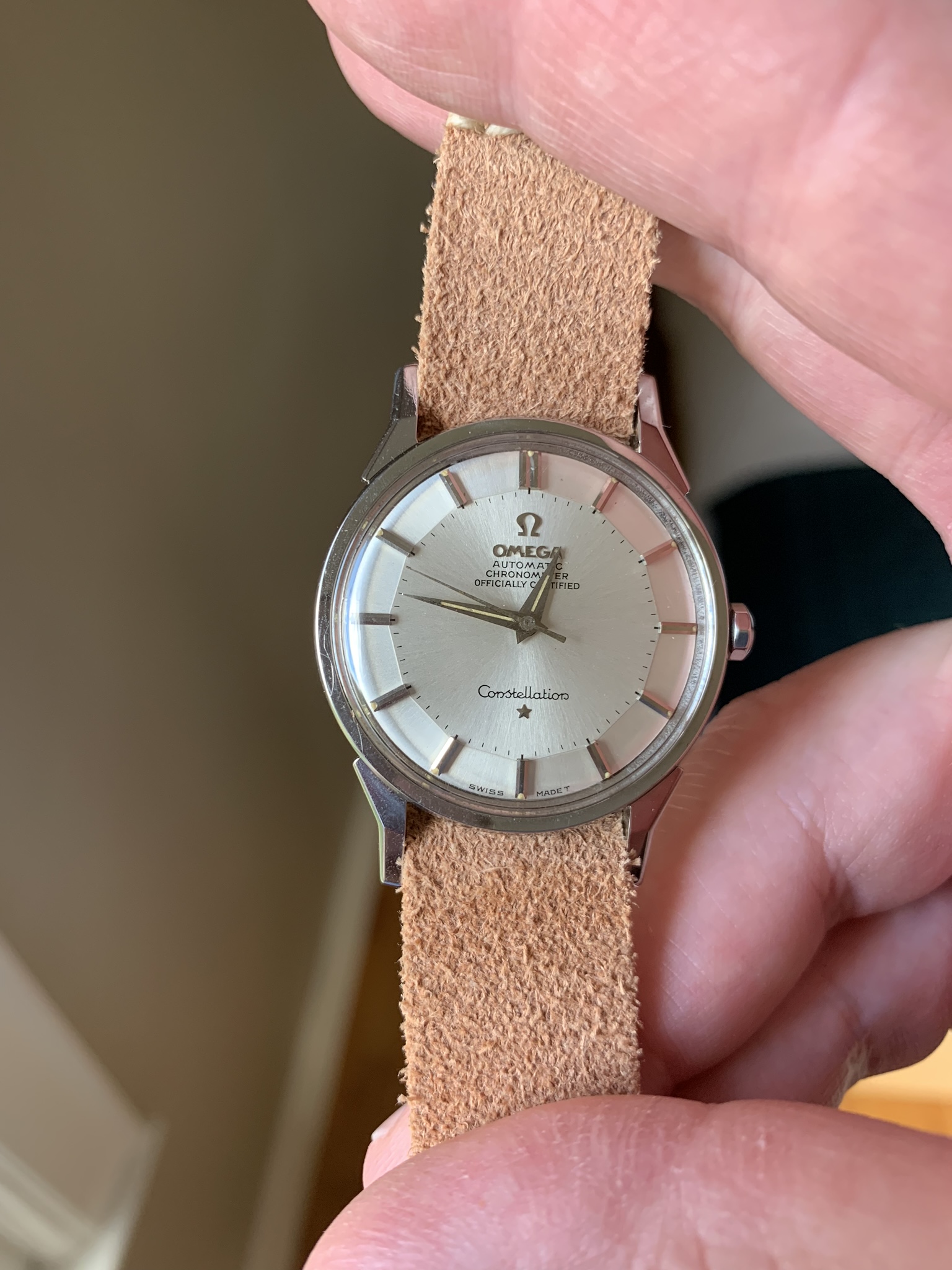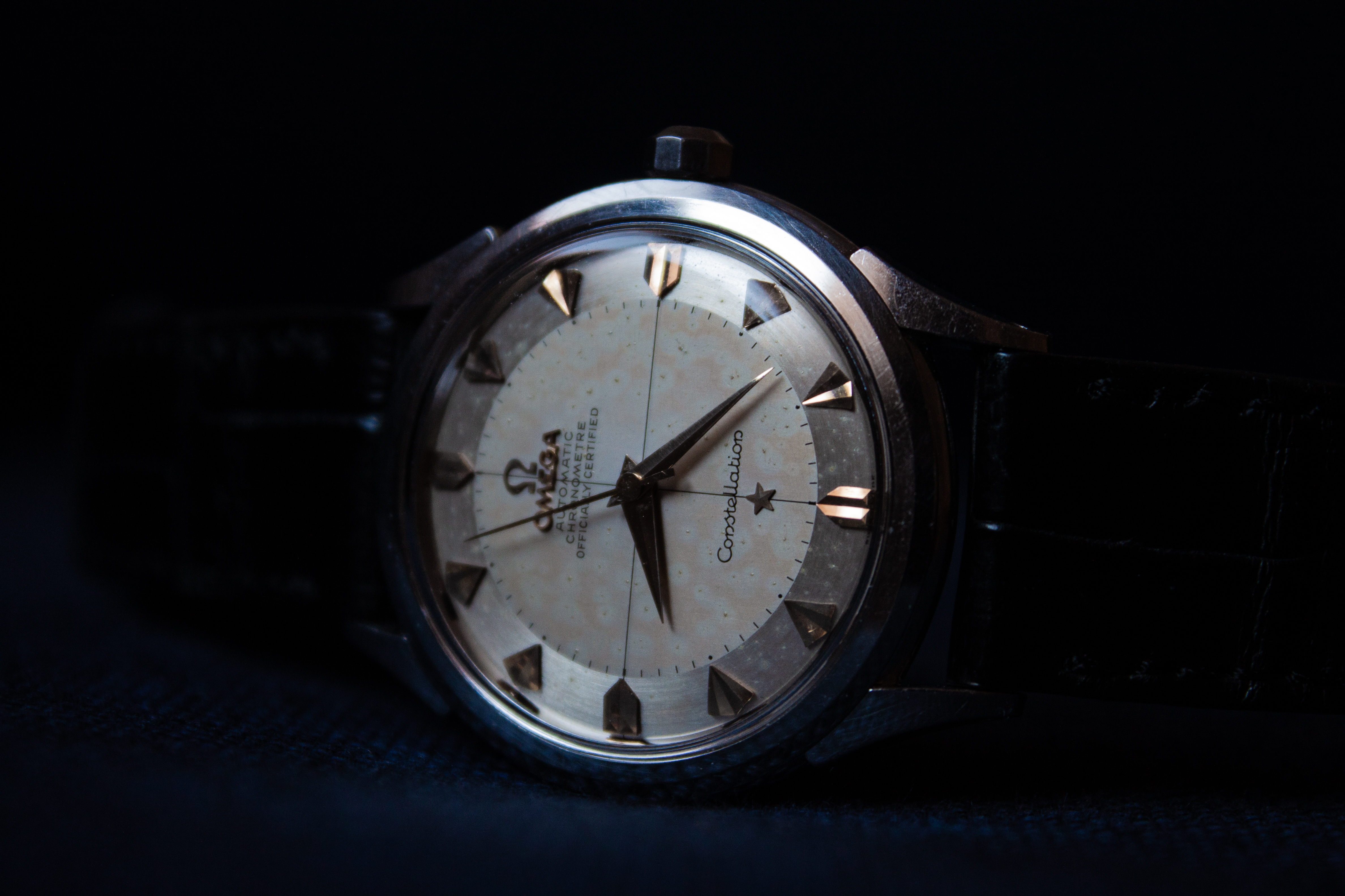 ·I bought this in 2002 off ebay from a shop in Melbourne (Watchco, I think). It is a 168.018 gold capped model (looks to be unpolished) originally purchased in Singapore 1968 (a duty free purchase no doubt). I had it serviced and it came back with the correct hands, band (cross hatched leather as in catalogue pictures) and crown. A couple of the hour markers dropped off during use (you can see one varnish flake at the 10 o'clock marker because of this), but all seems to be in a stable condition now. I do love it and wear it occasionally, but 35mm feels a little small now.