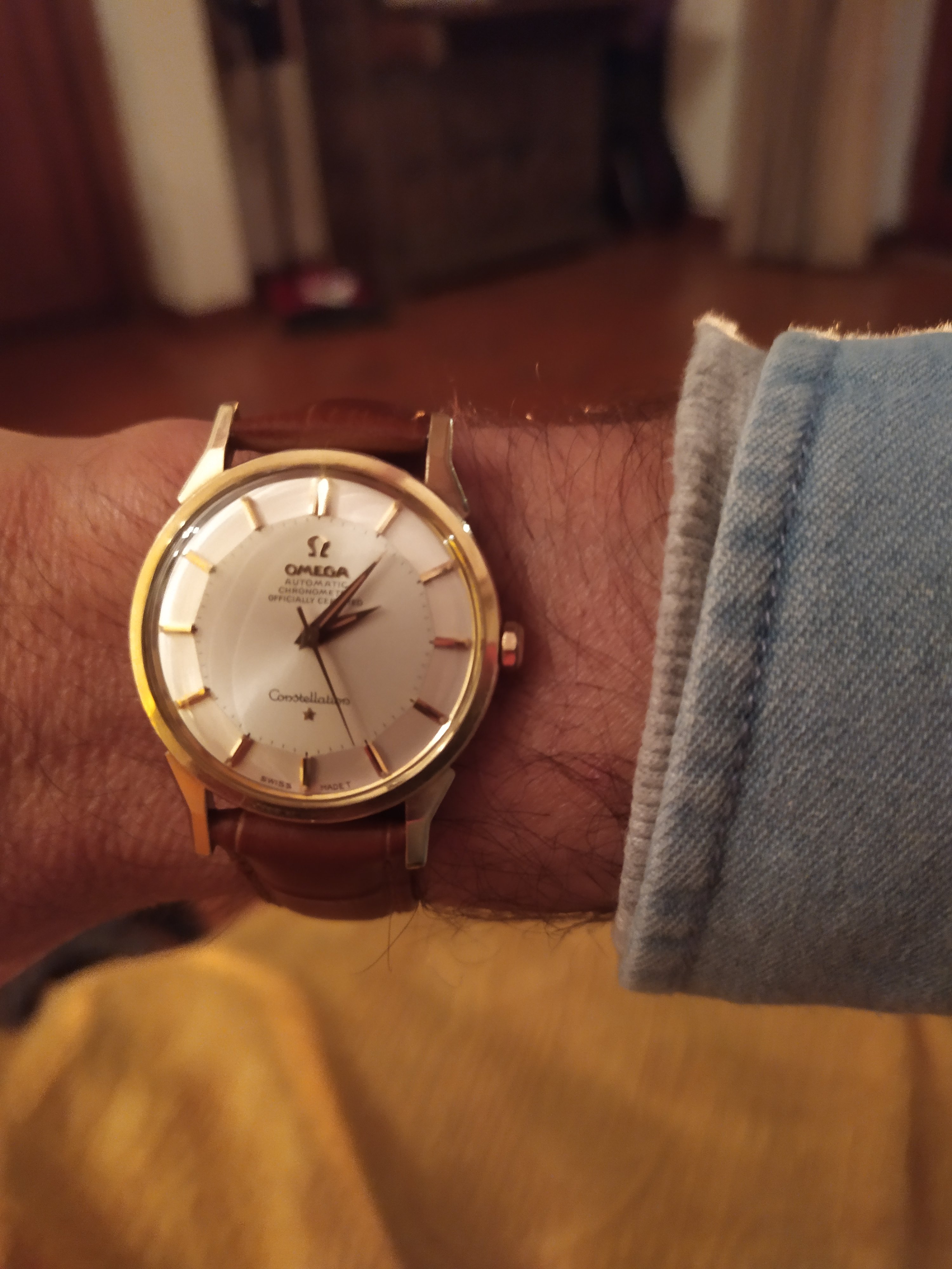 Hello folks, my first post, I have owned my constellation for about two years now. I believe it is a 168 something, forgive my vagueness. The movement number is 26993980. The guy I bought it from informed me that it kept excellent time, it didn't. I bit the bullet and had it fully services by an Omega authorised service centre. I have been keeping a look out for an 18 carat gold pie pan constellation, they are very eye catching.