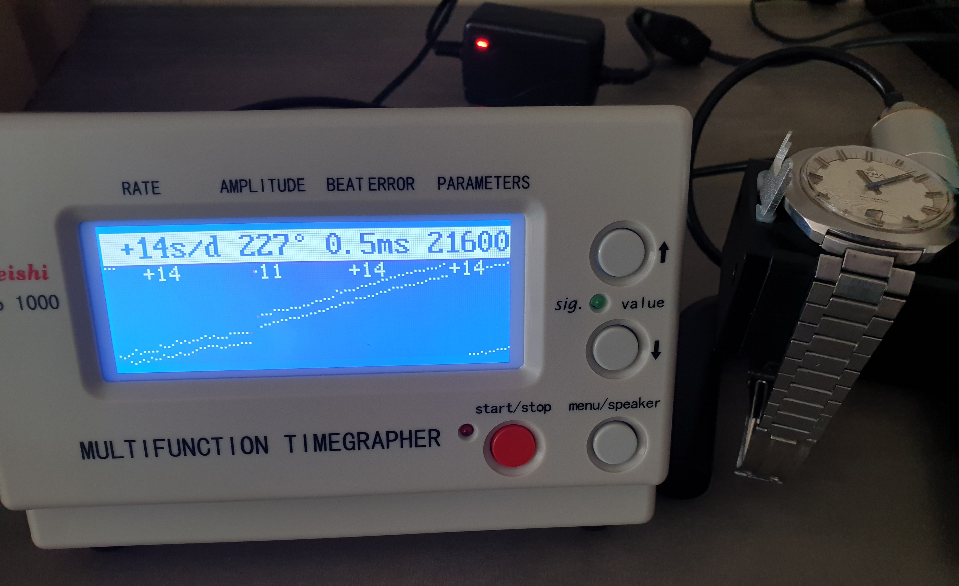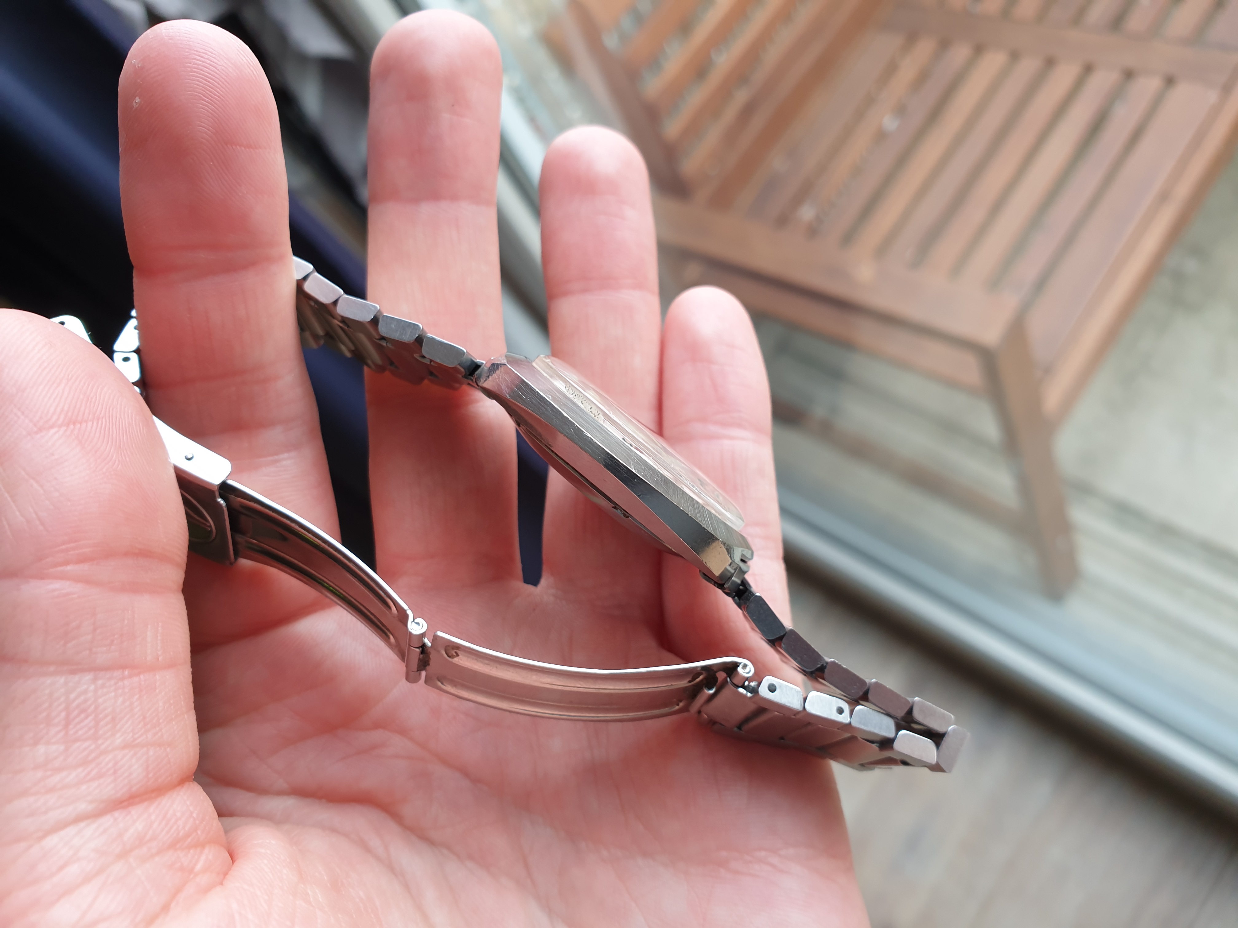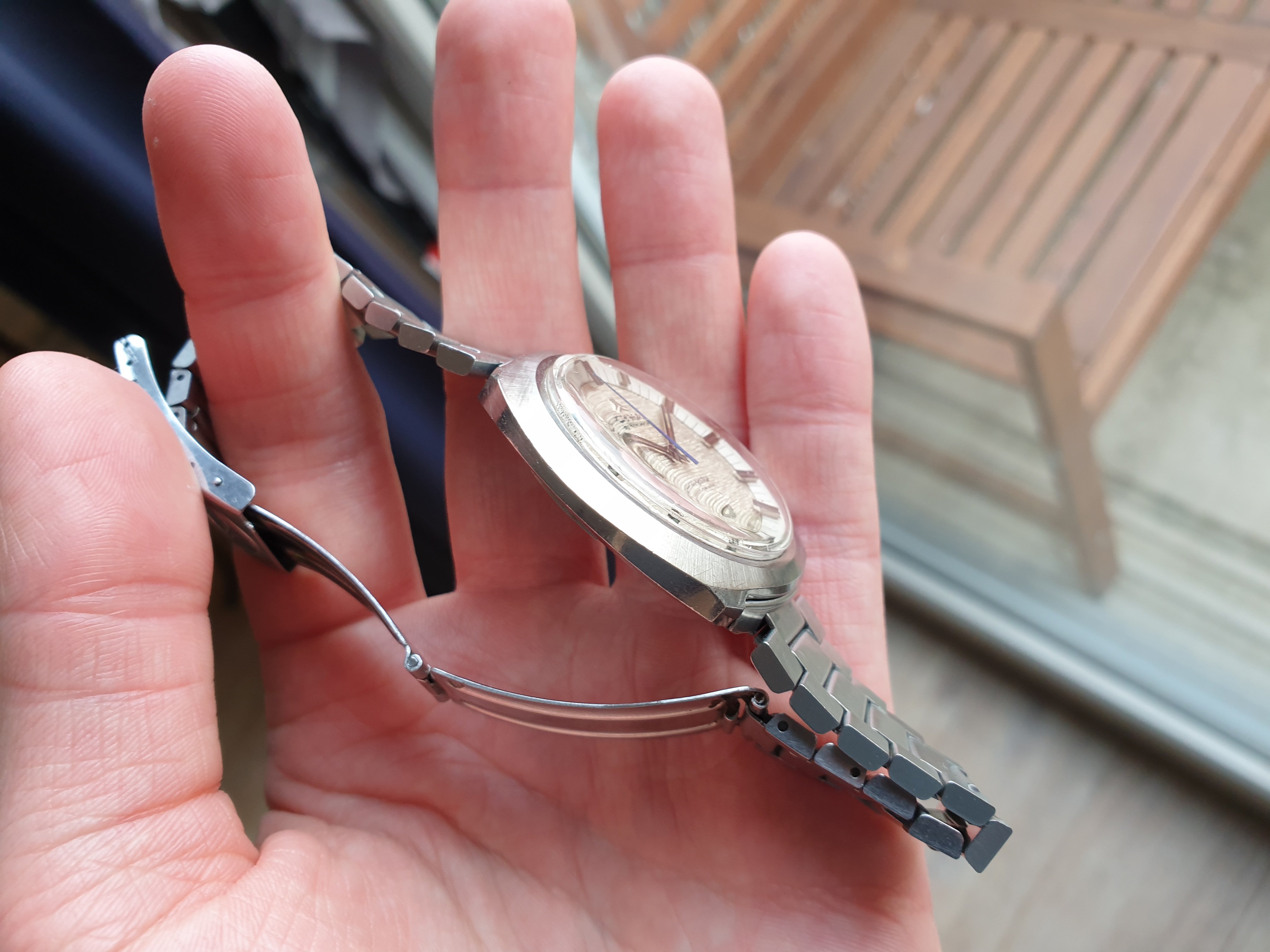 Up for your consideration is this sparkly 1970s package in jumbo size. The dial is a true eye-catcher and varies from a gold-ish tone to silver-grey depending on lighting conditions.