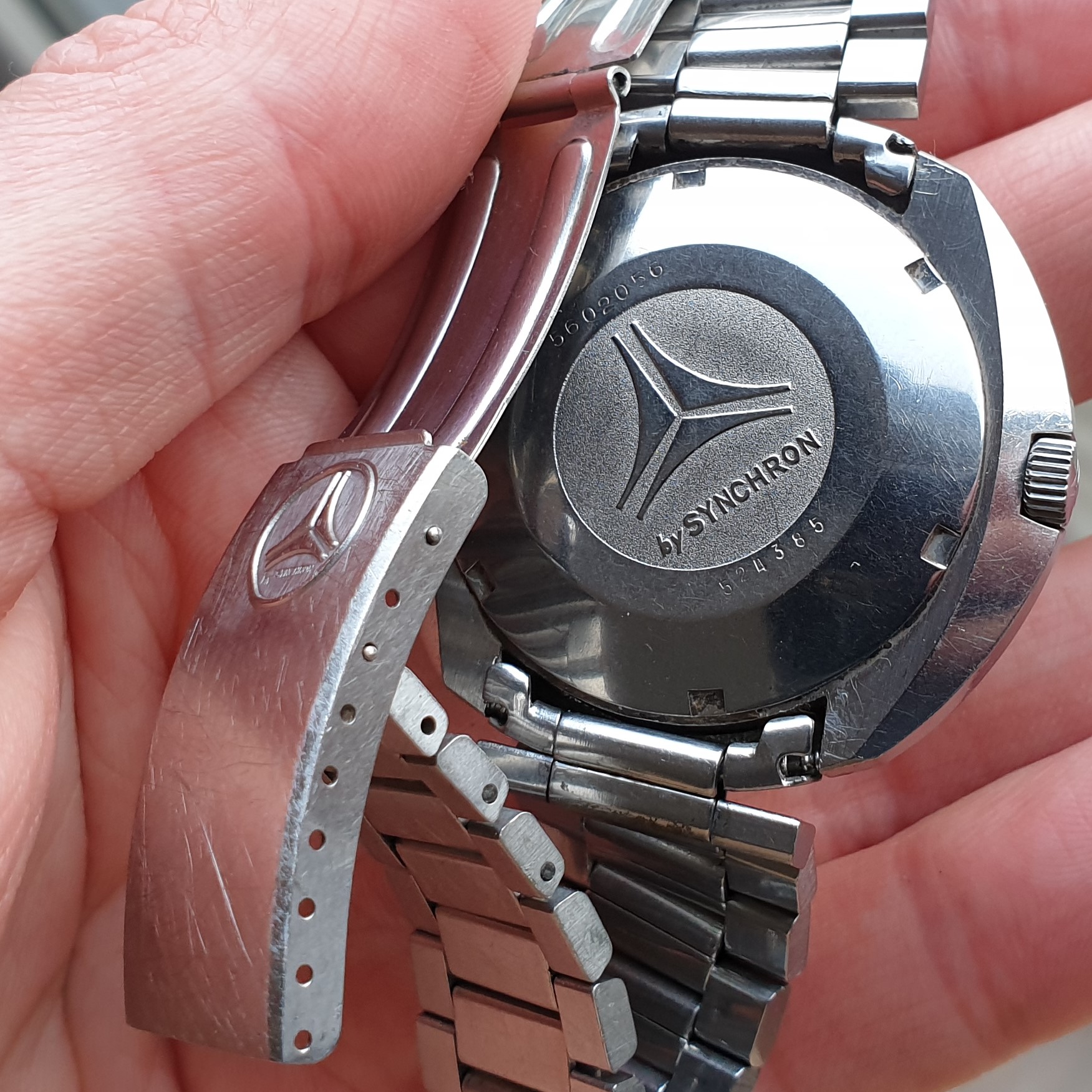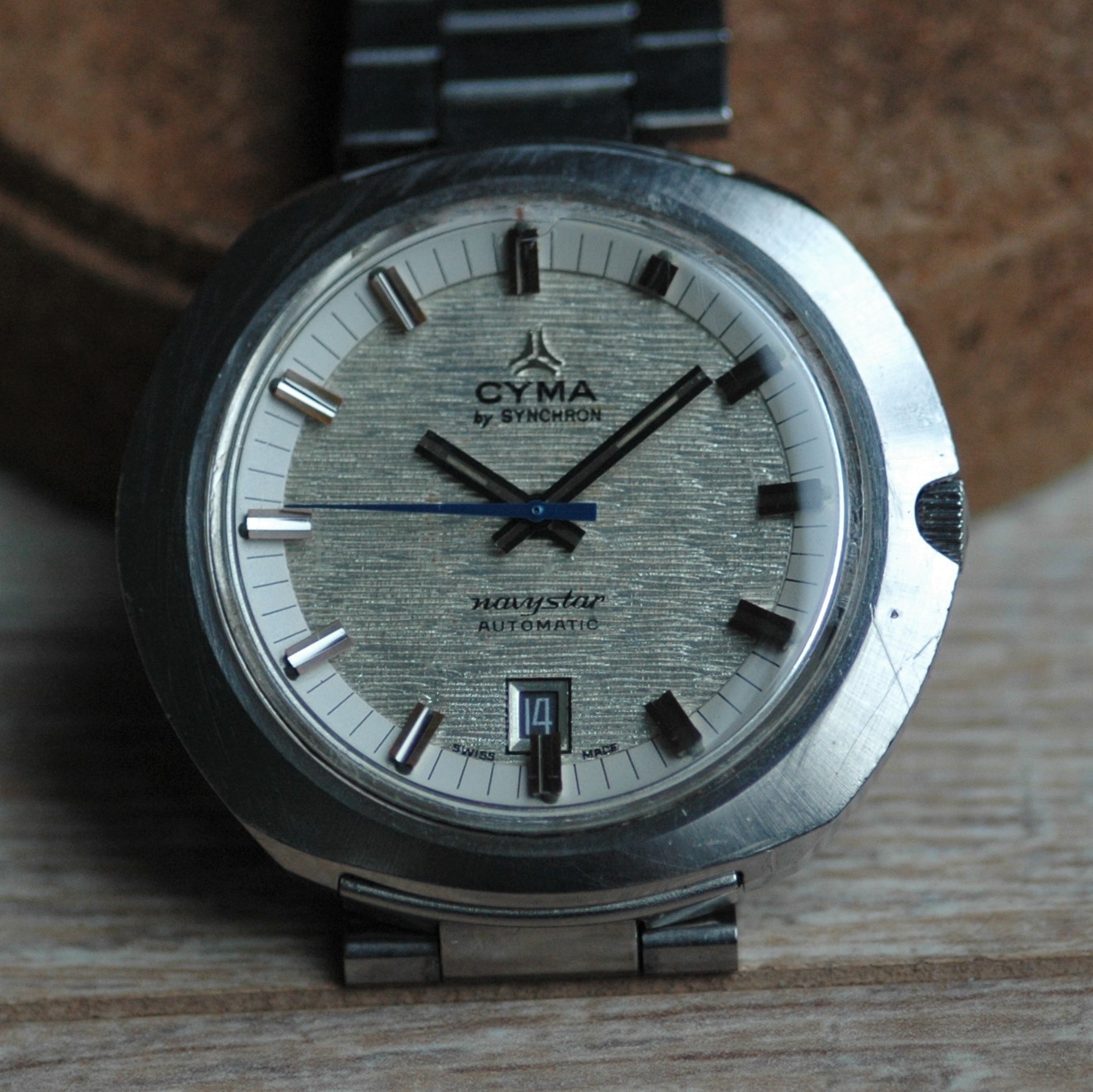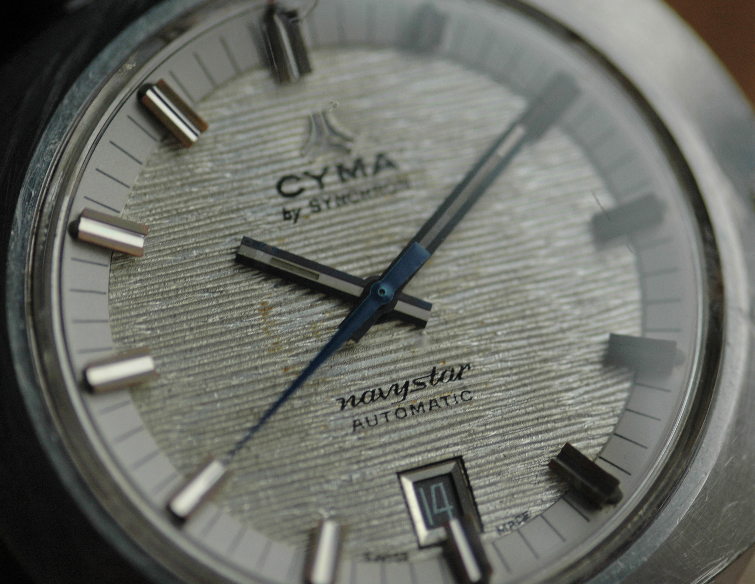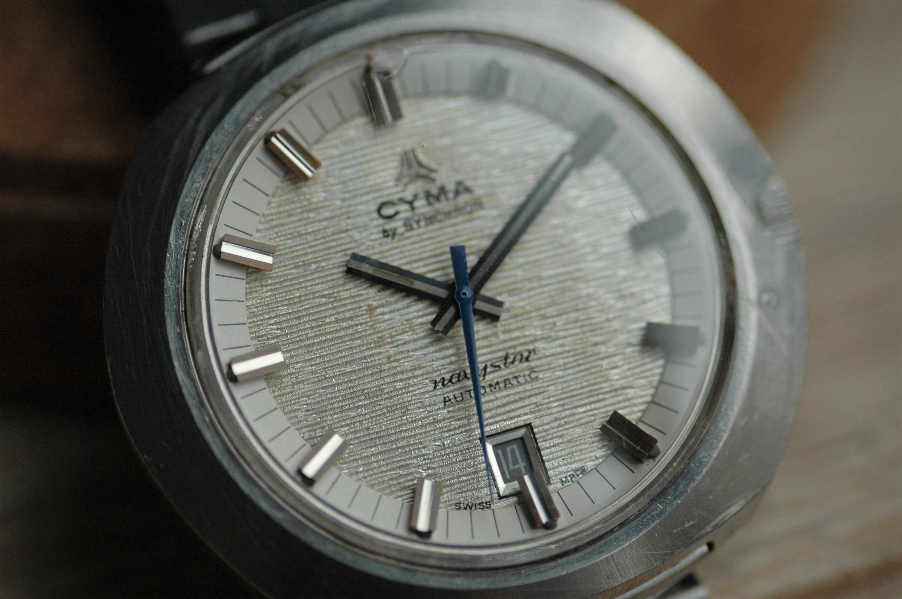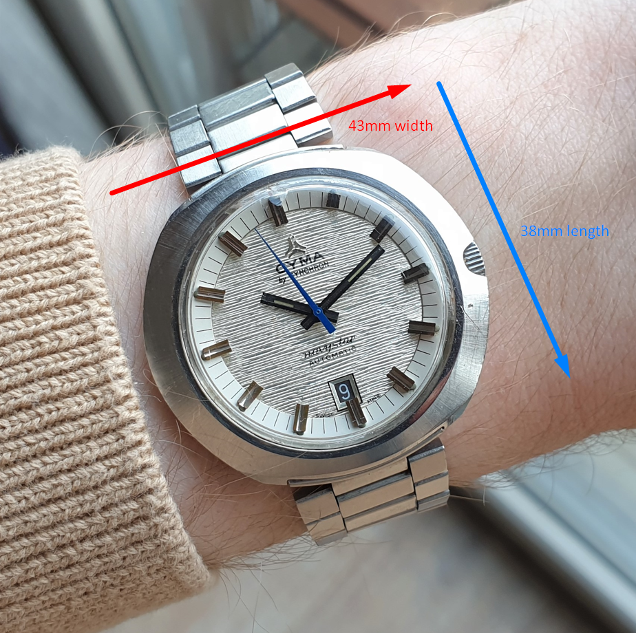 Cyma: a brand we all know and love. Somewhere in the 1970s the brand was acquired by SYNCHRON and they made some great watches in their own respect. This particular reference features a jumbo case and a textured dial, and a striking blue seconds hand. Despite its wide case, it wears surprisingly comfortable for someone like me, with smaller wrists (17cm). The design all in all in very well-balanced (see picture for dimensions).