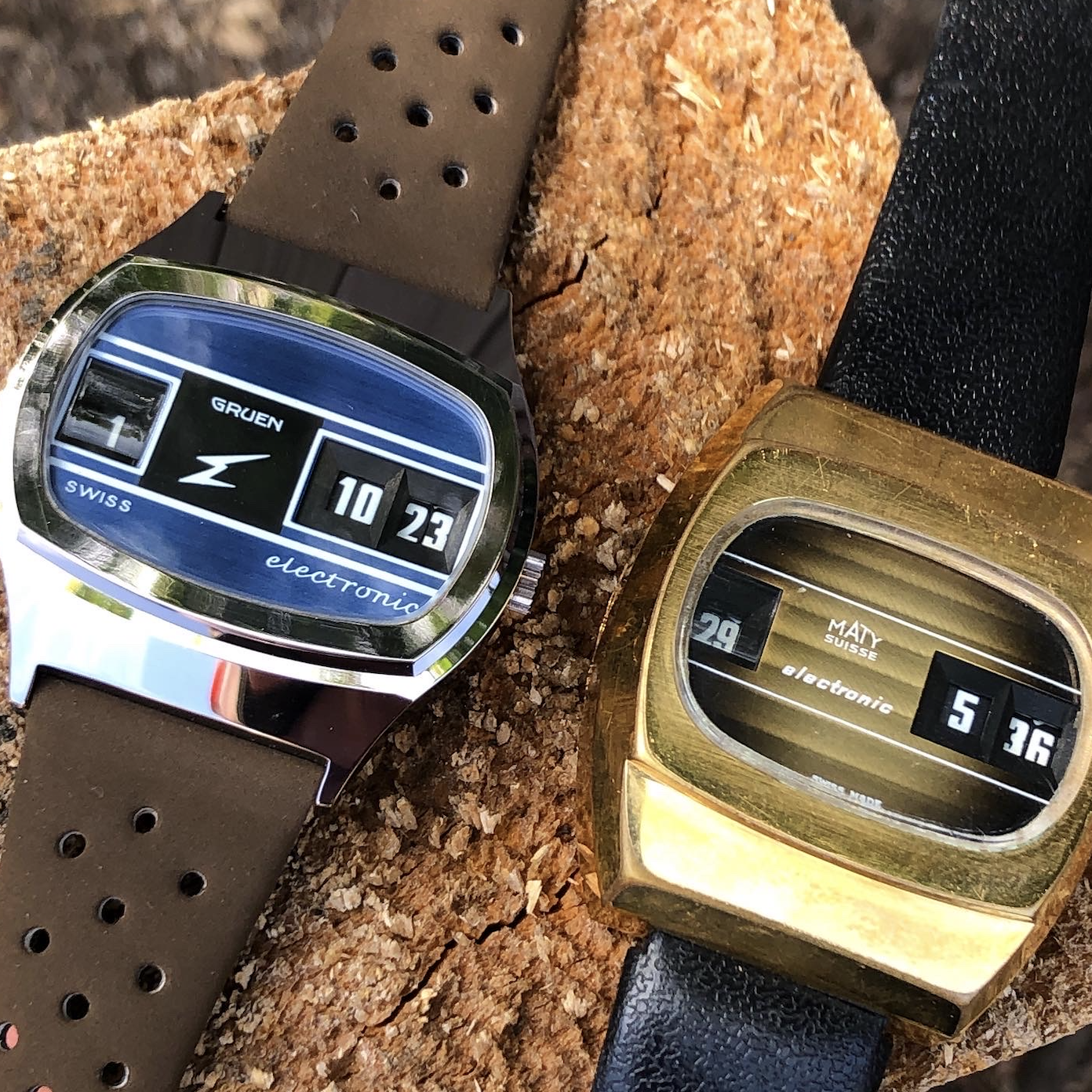 These are ones made from Electro-Mechanical watches, such as the Lip R148 (skeleton and chonometer), Landeron 4750 (Wittnauer Electro-Chron) and the ESA 9159 (Green dial digital jump hour orb)