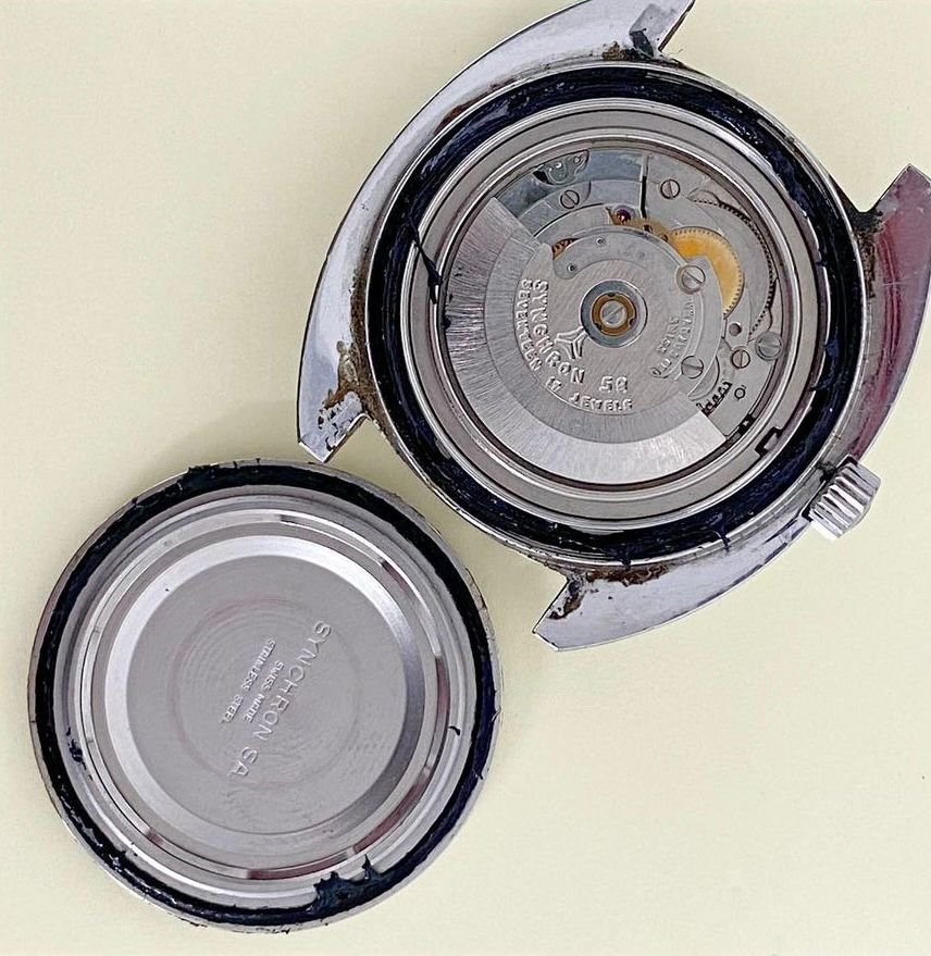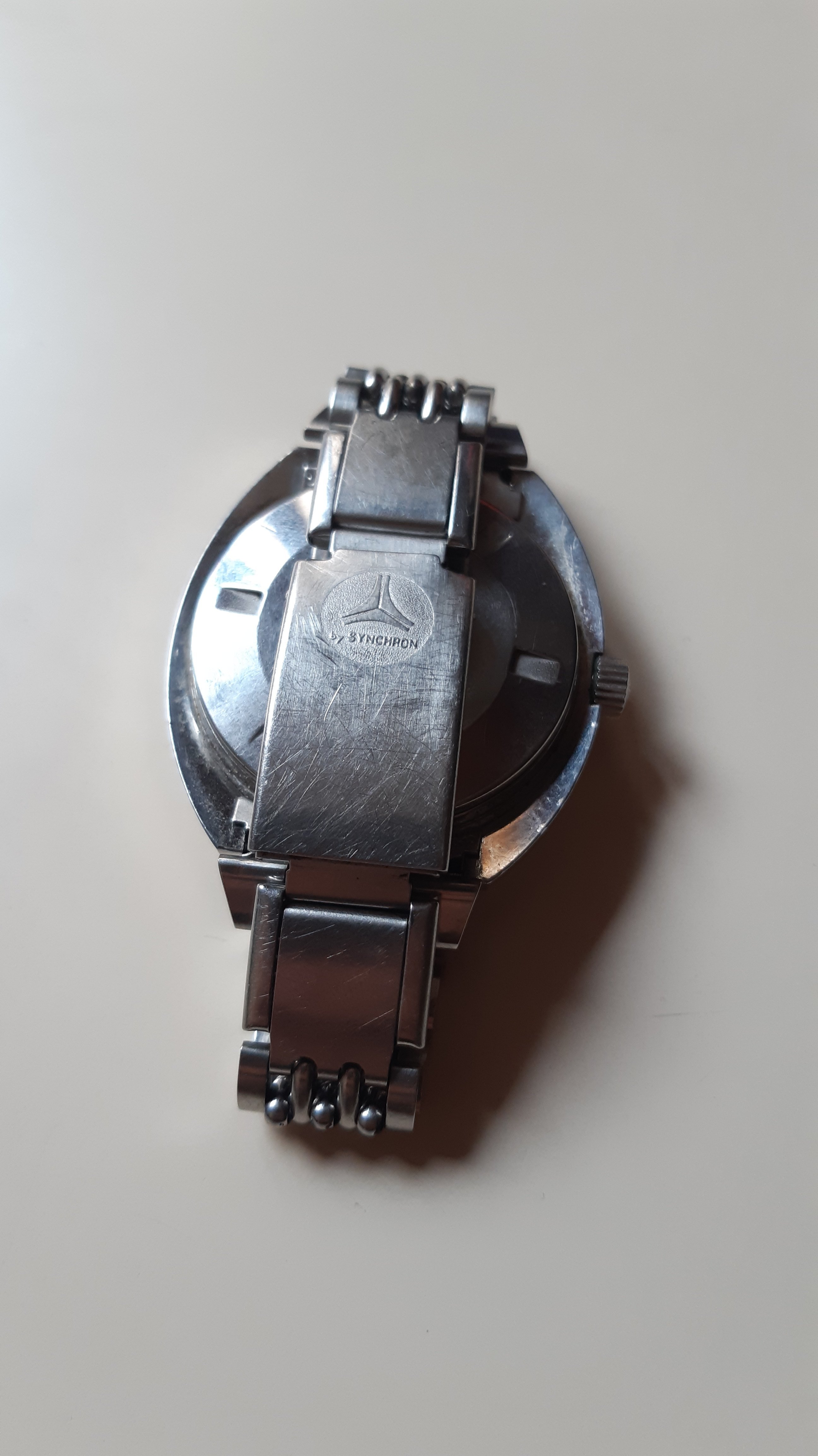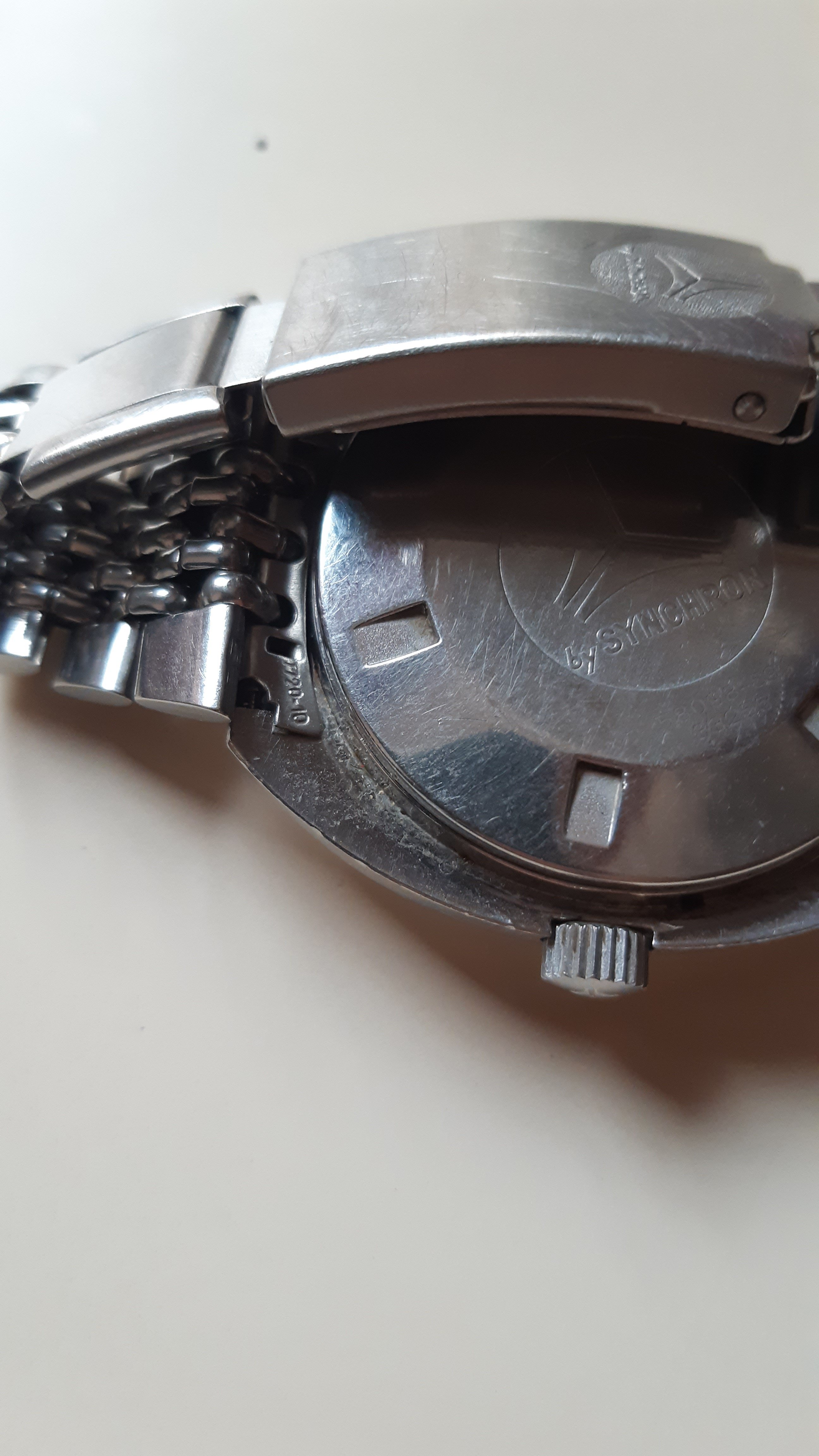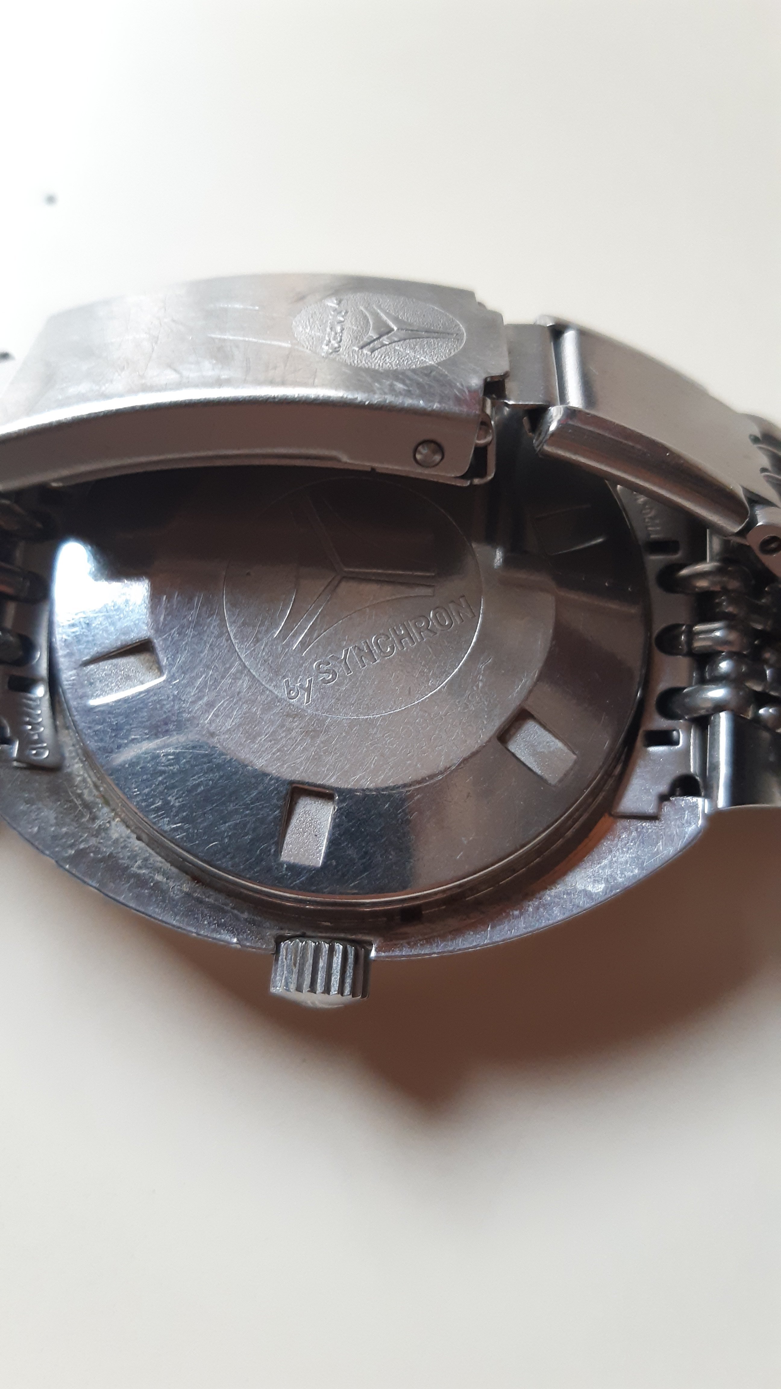 Case: 42x45mm stainless steel with unmolested lines and edges and fully retaining its factory brushing, serial number shows up clearly on the screw down case back, signed Synchron as crown and clasp. Bezel is sharp with most factory paint remaining, clicks and spins as it should. Original mineral glass, original hands set.