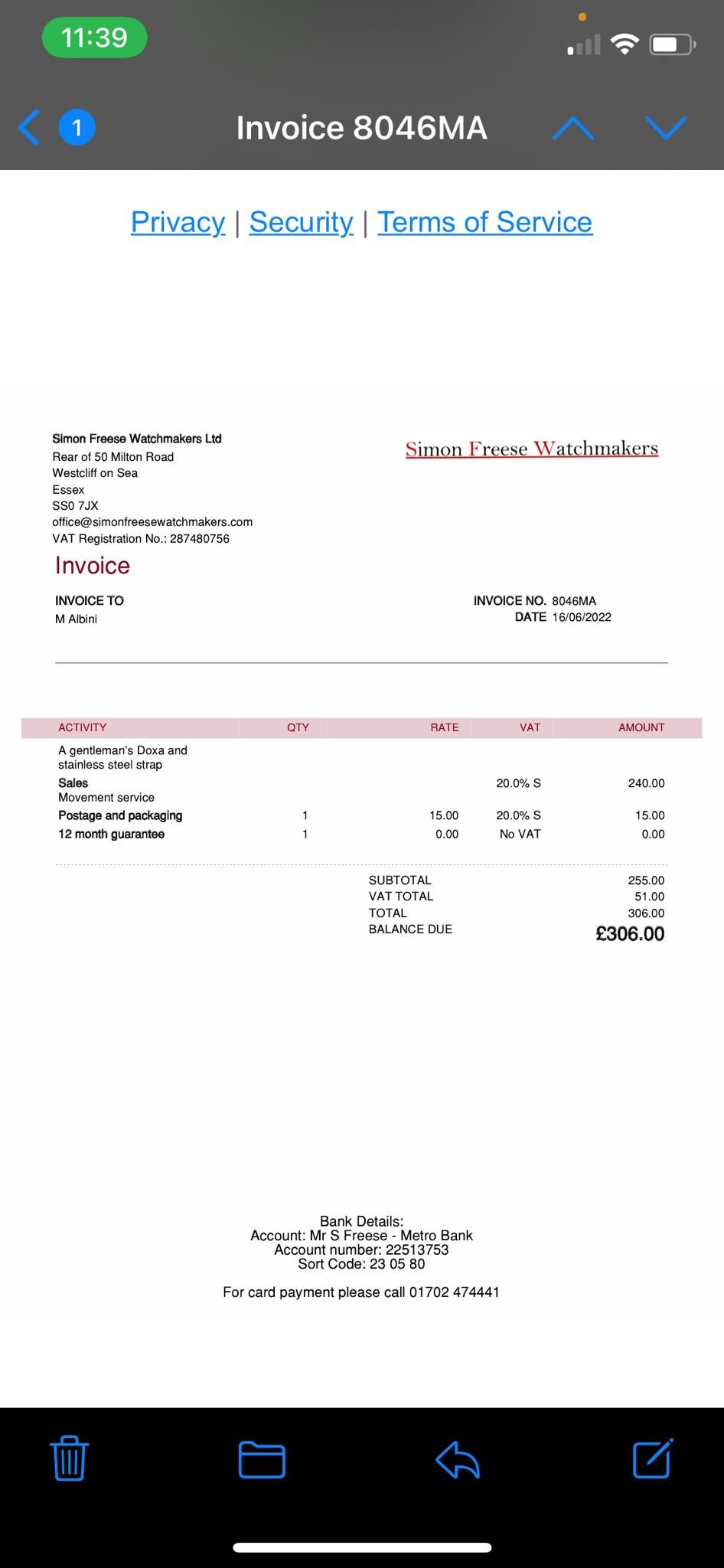 I got this one last summer from a nice fellow OF member, as just serviced in London by Simon Freese -an electronic receipt is included in the sale.