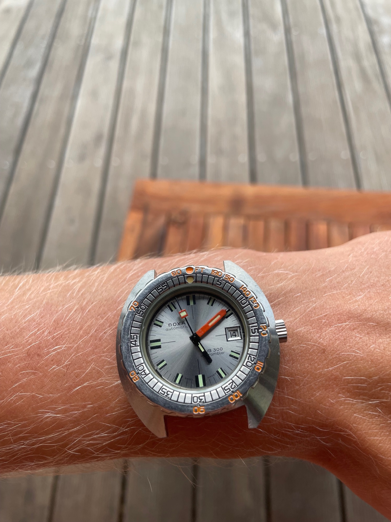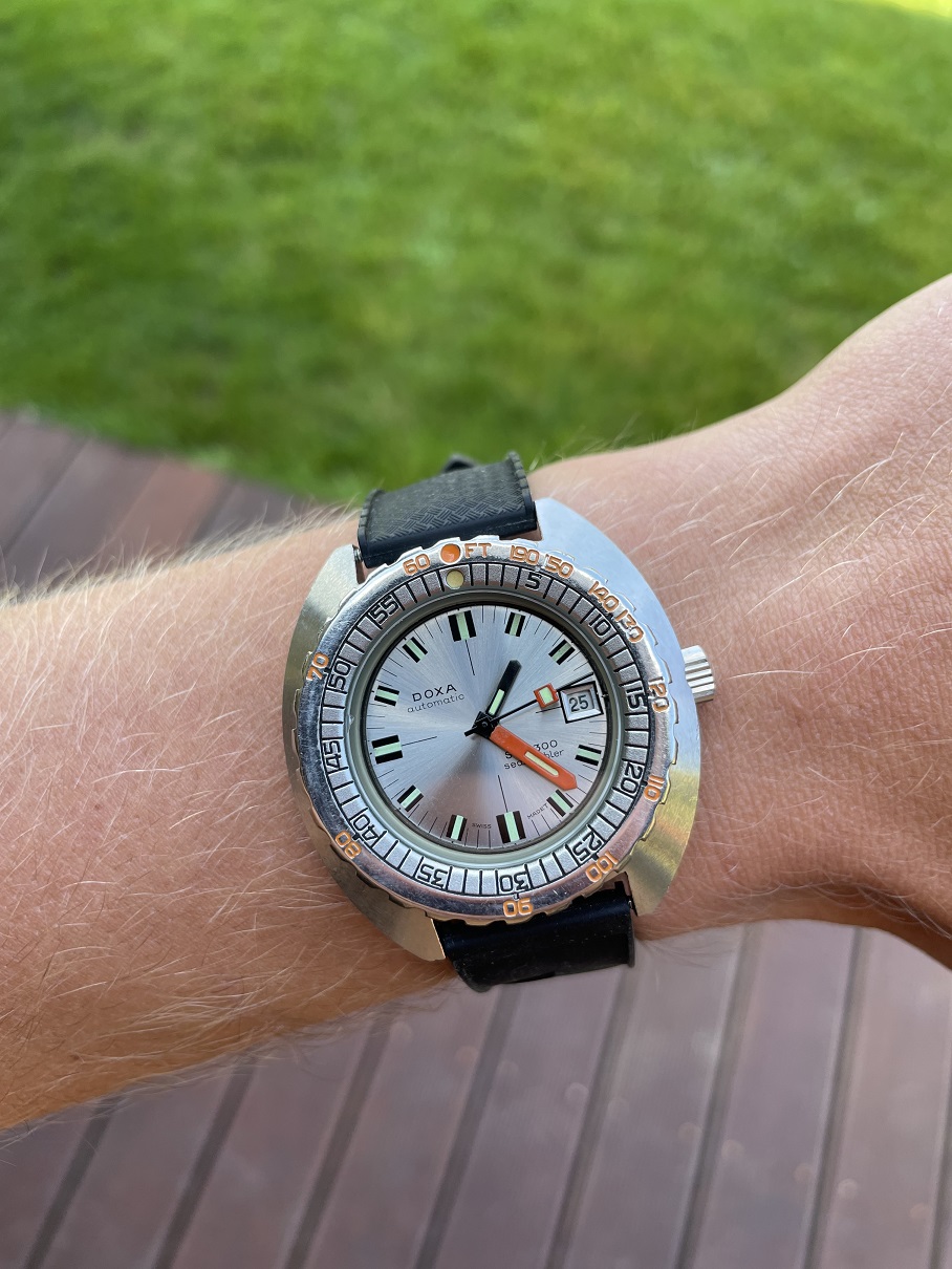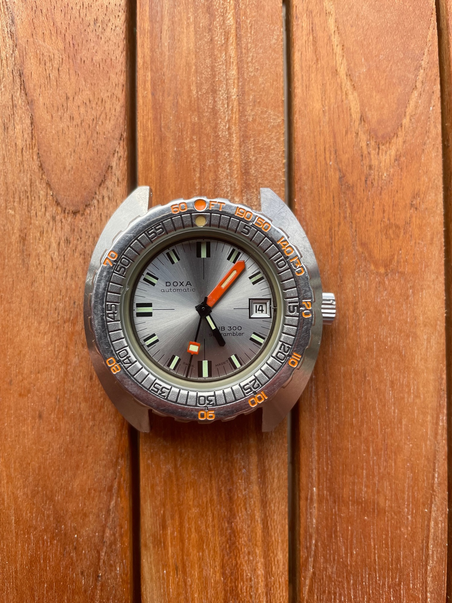 "Doxa sub 300T Searambler. Winds and runs smoothly. Sent to Doxa a few years ago when they found the stash of parts. Came back with NOS 300 no T dial and hour/minute hand. Not for the purist, but gorgeous and chock full of rare parts."