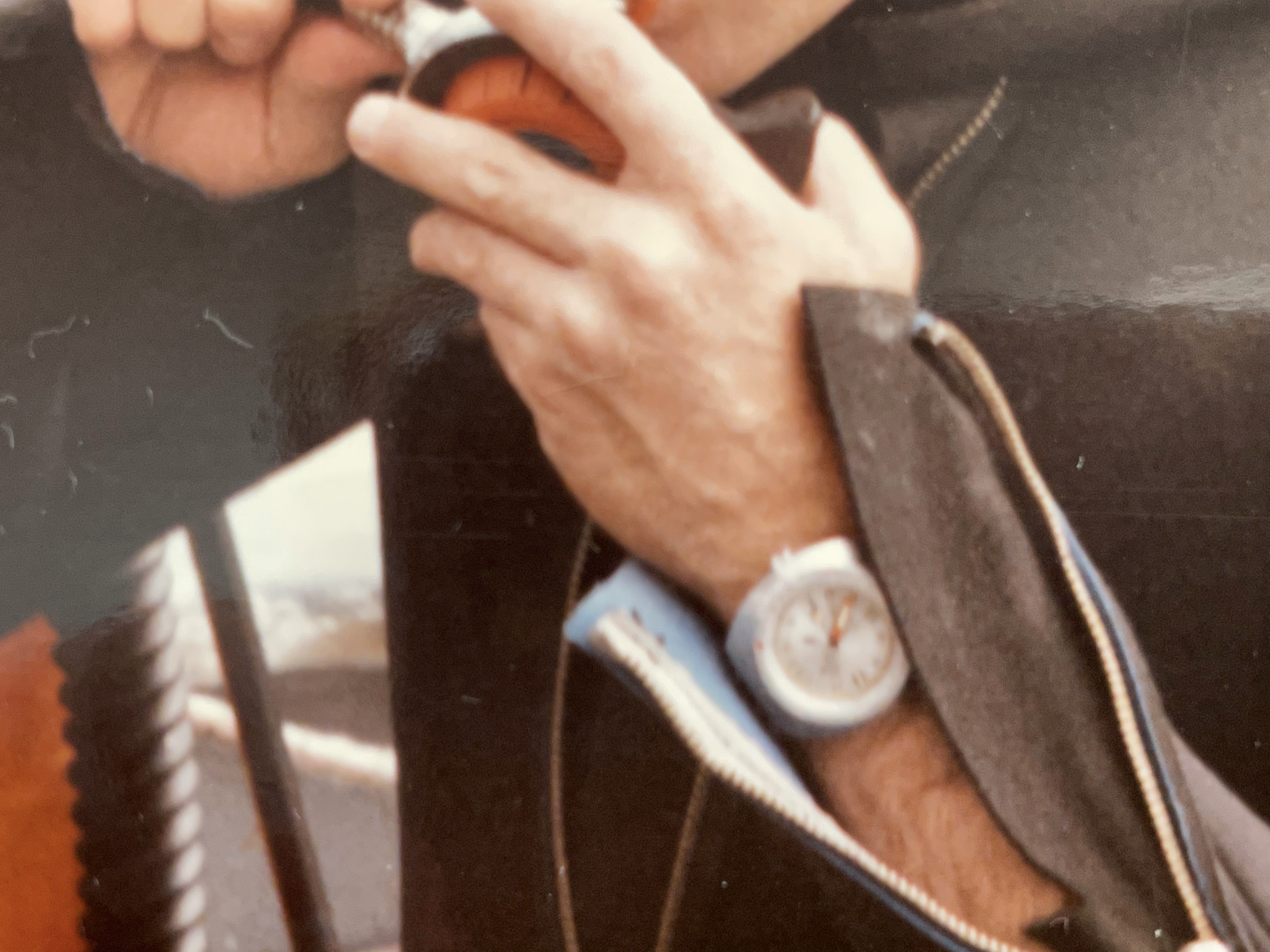 "Also, not to sharp, but here's a photo from 1977 from a dive with the watch. Can't recall either of the SR's with different hands after service by Doxa CF but hey, 21 years ago it was a major accomplishment just to have them serviced by the manufacturer. Hope this helps!"
