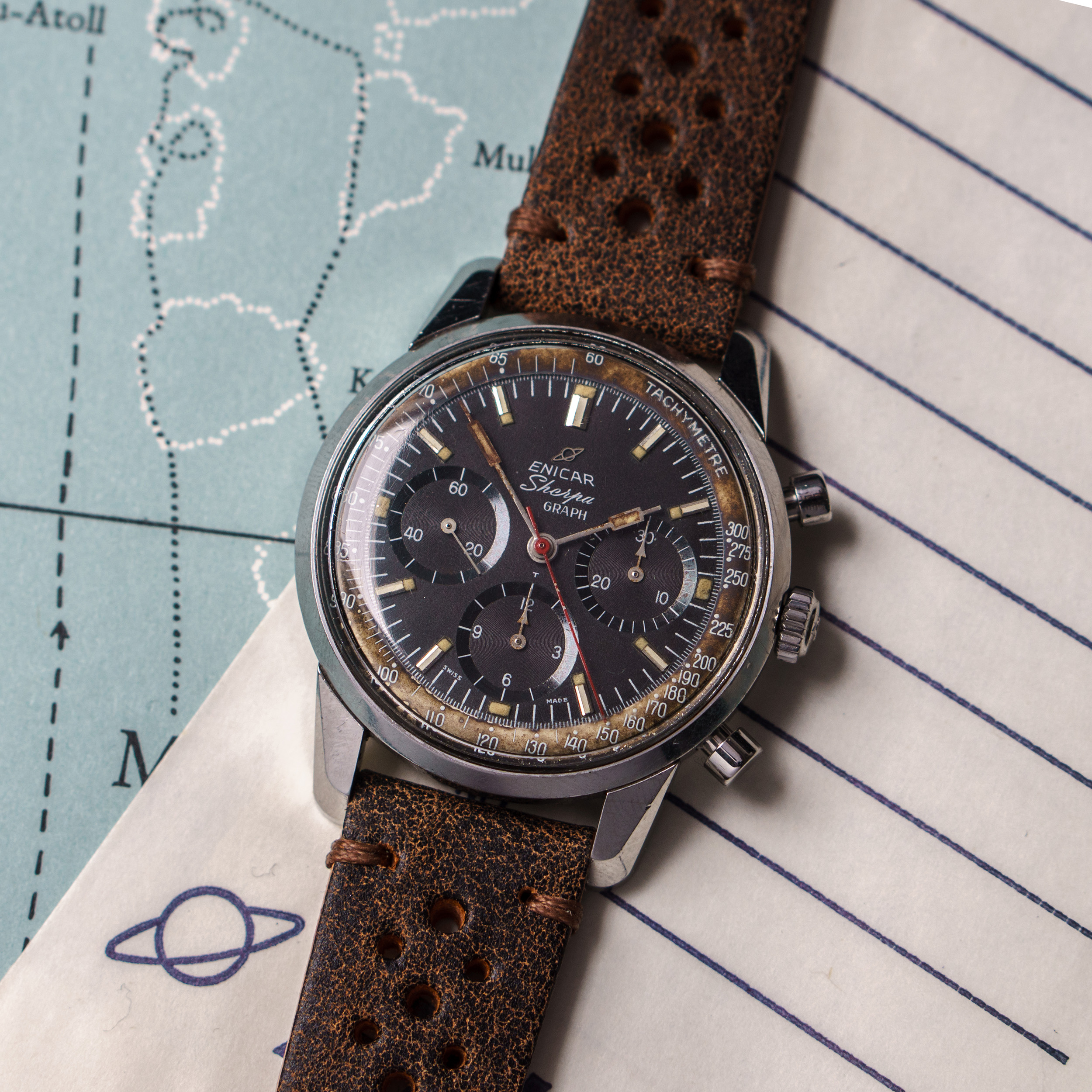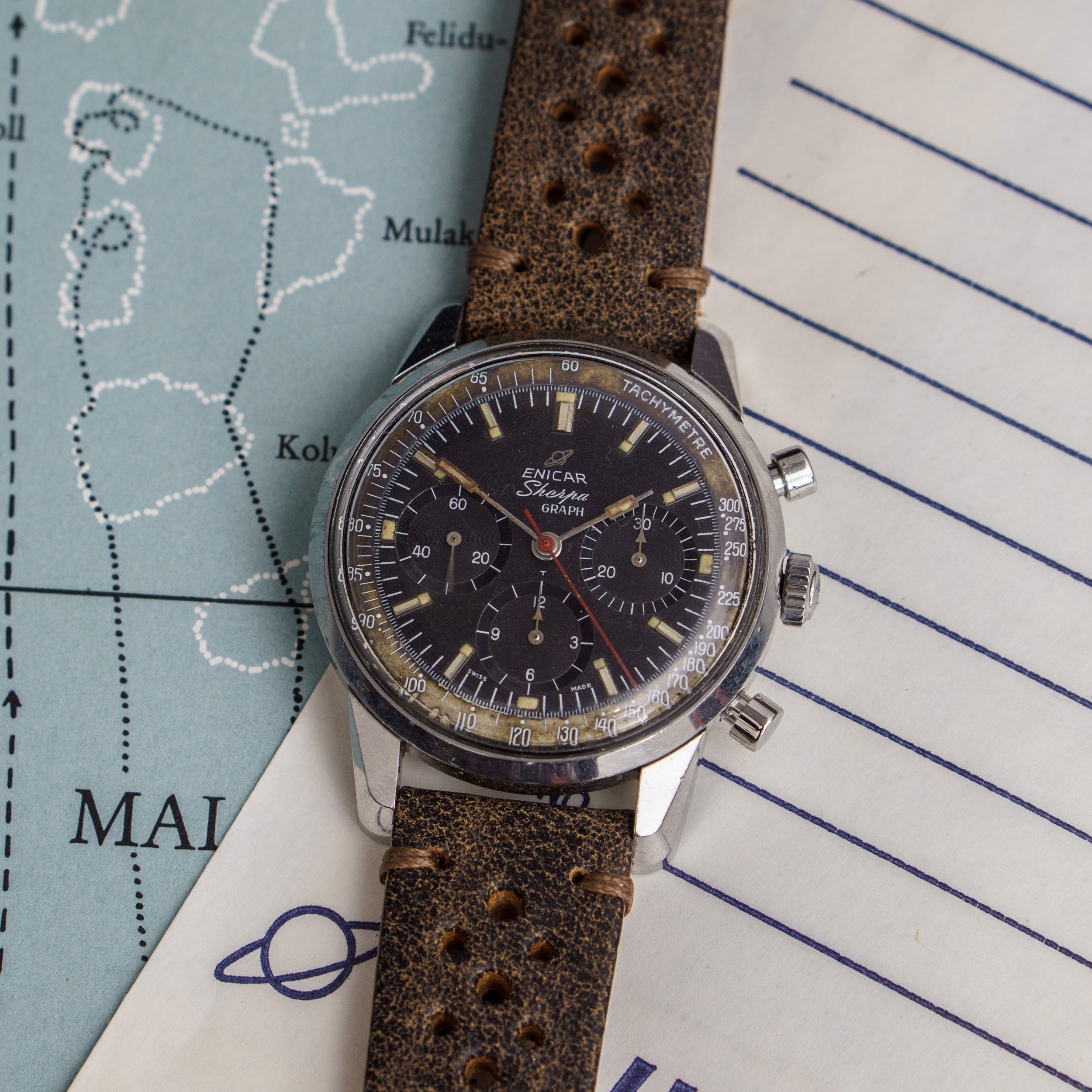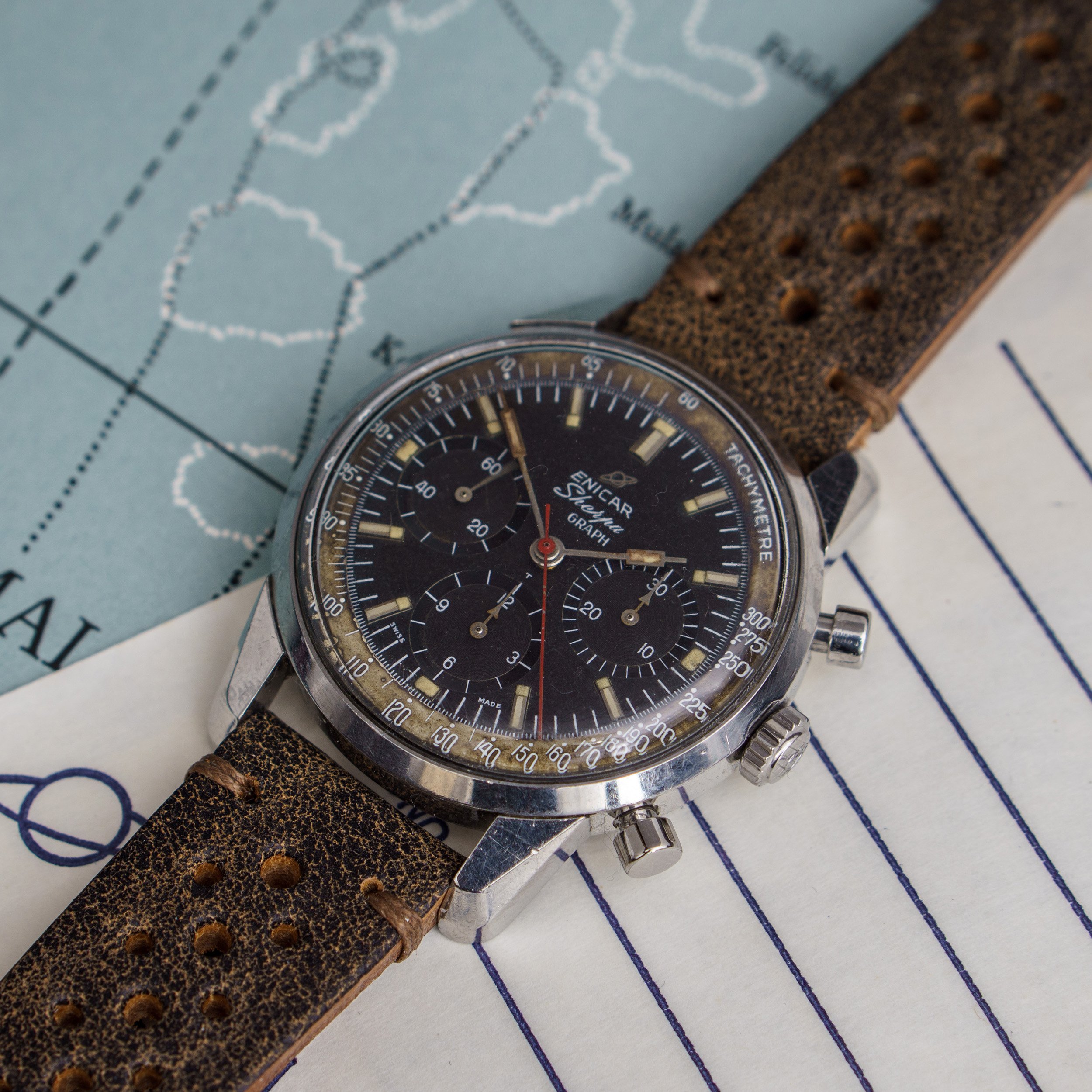 from my collection I am selling this unique Enicar Sherpa Graph MK IIa from around 1963. The Sherpa Graph is the non - bezel version of the famous Graph chronograph line of Enicar in the 60s and mostly connected to racing drivers like Jim Clark and Stirling Moss. Established in the early sixites, this is an early MK IIa model. (more info on that model you can find at https://enicar101.com/sherpa-graph-mkii/)
